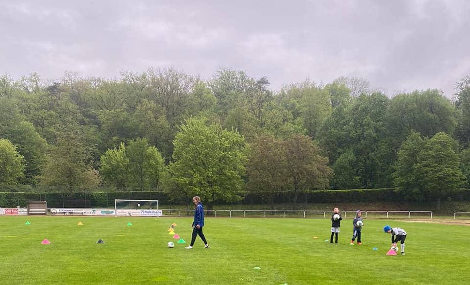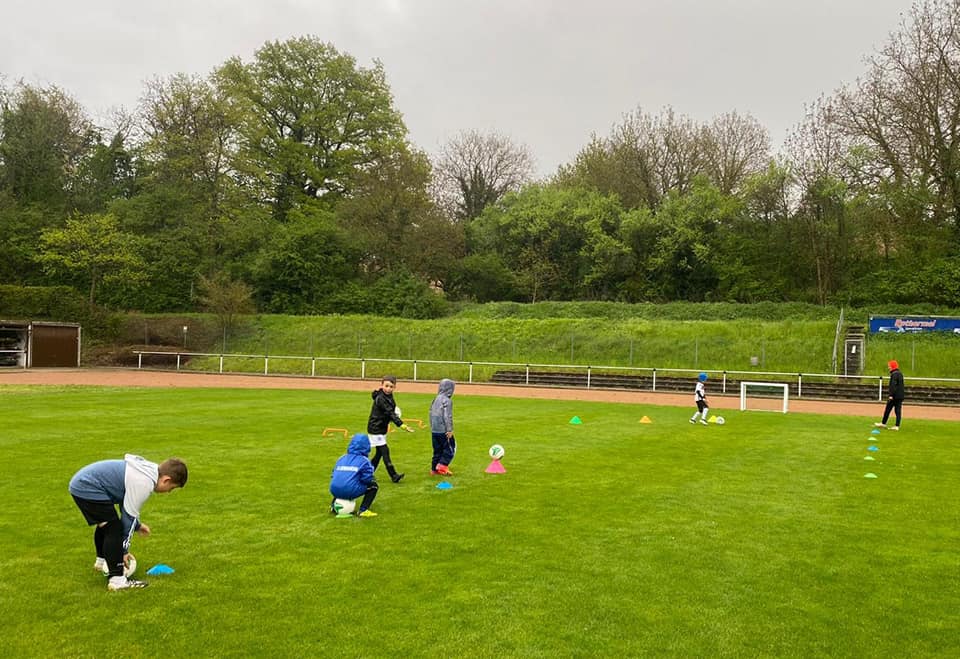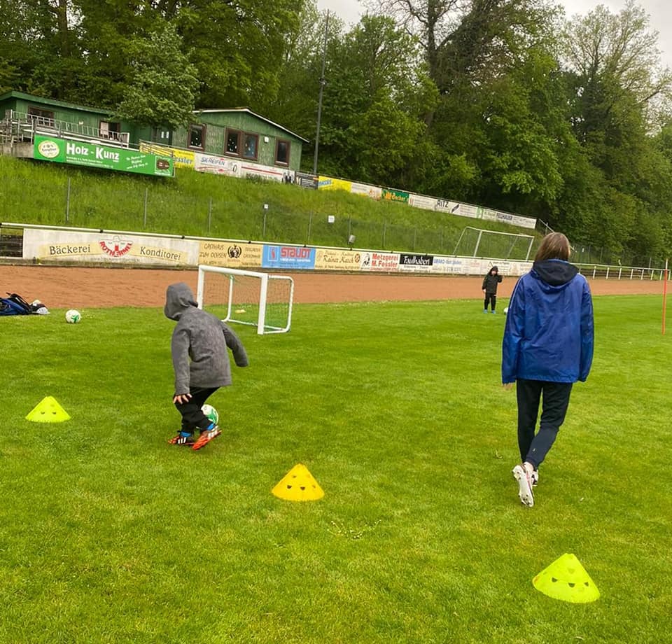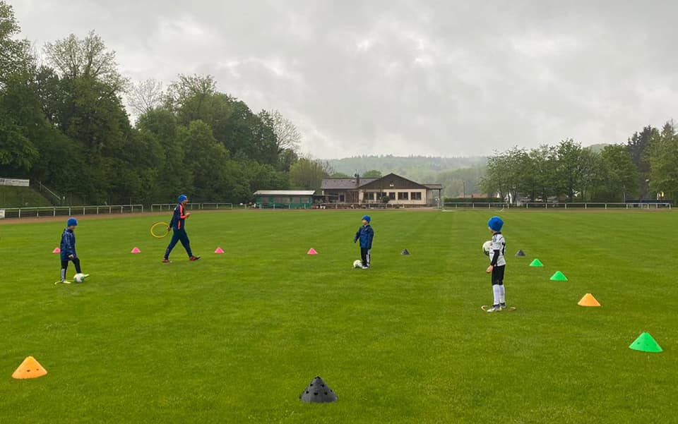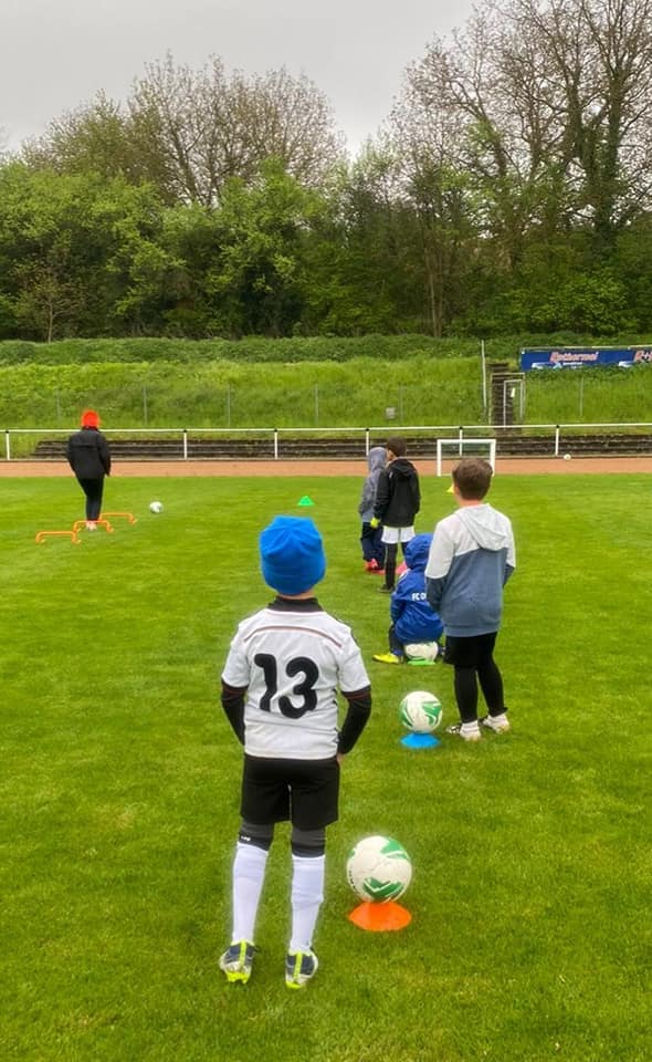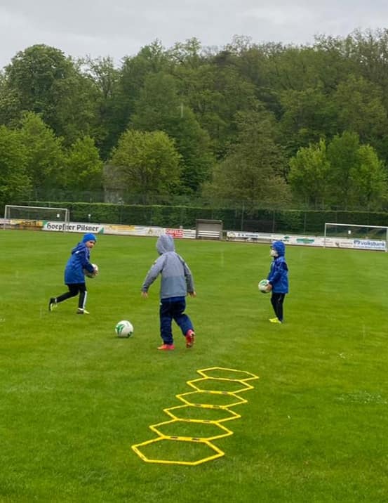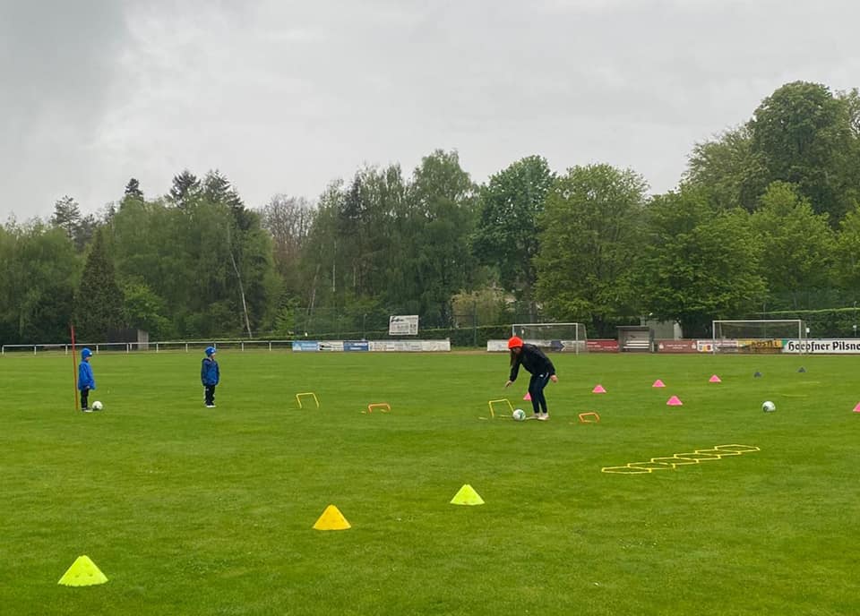 Die Coaches Steffen Lay, Emily Wagner und Jenny Wagner konnten eine erste Trainingsgruppe mit 10 Kids begrüßen, die mega happy waren, endlich wieder gegen den Ball treten zu dürfen. Dabei ließen sie sich auch vom ausgerechnet an diesem Tag Schmuddelwetter nicht aufhalten.