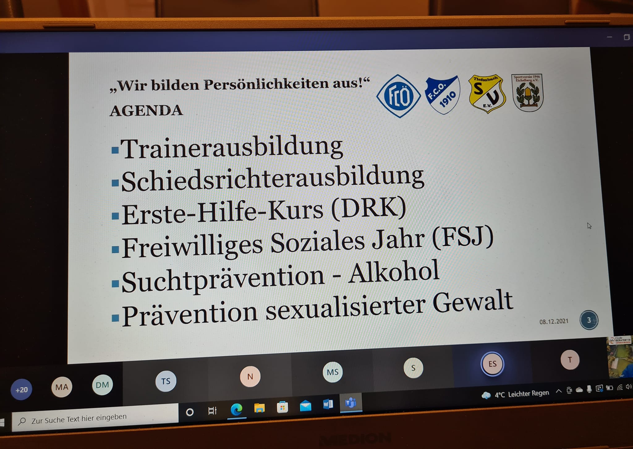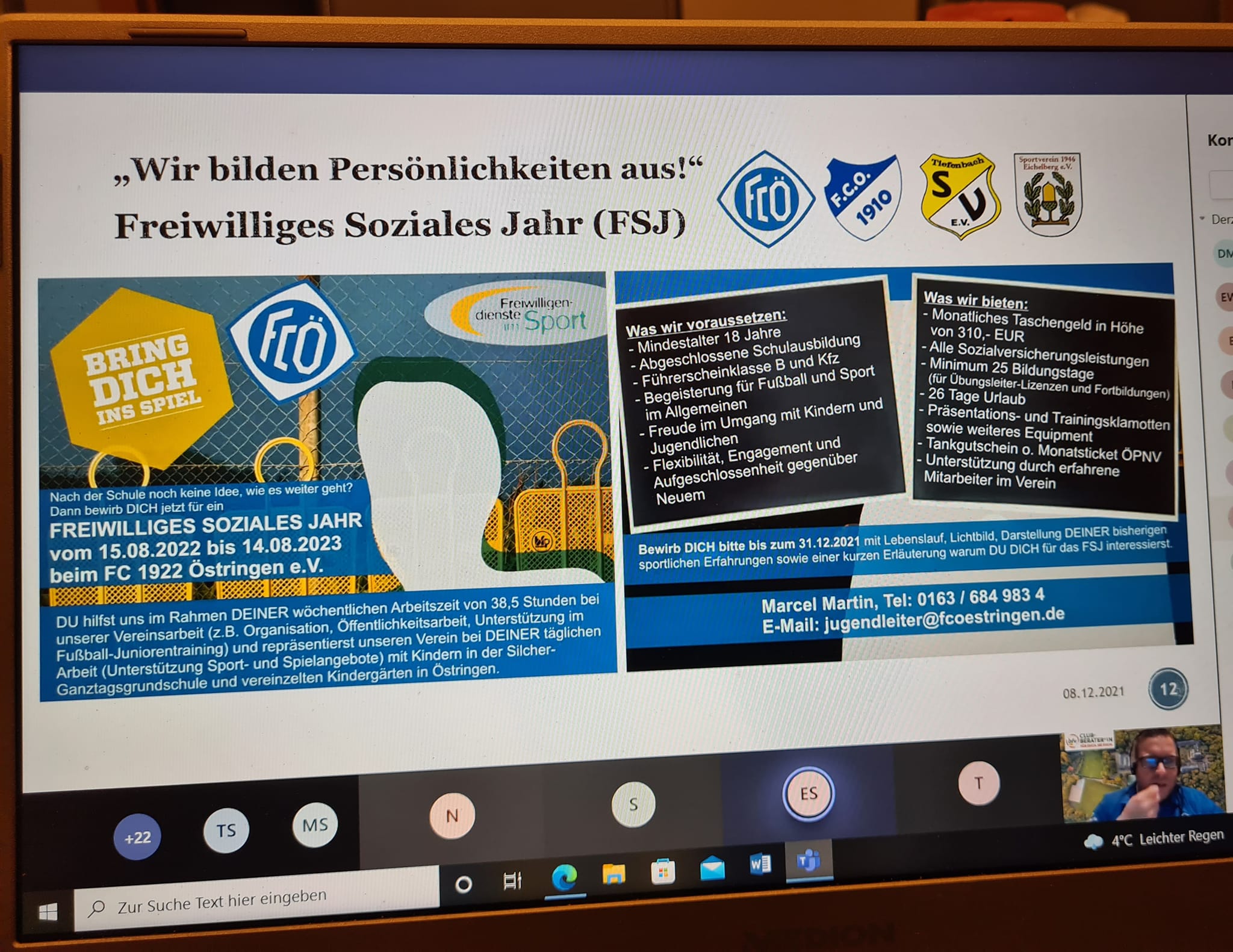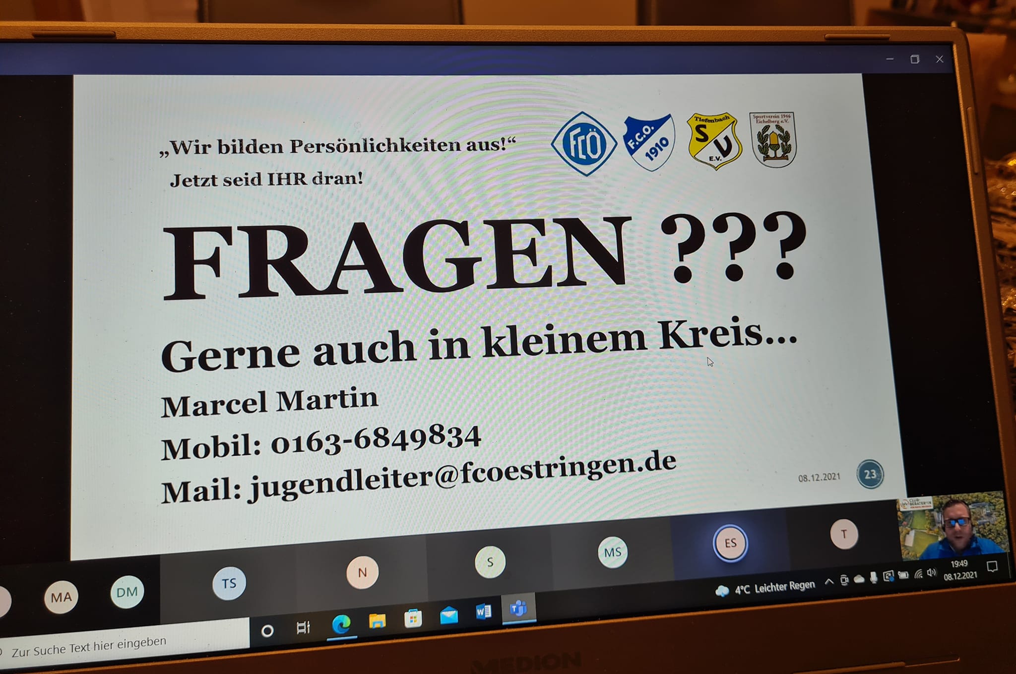 Auf Initiative der paritätisch besetzten JSG-Leitung (Sport FC Östringen, Finanzen FC Odenheim, Veranstaltungen SV Tiefenbach, Orga & Verwaltung SV Eichelberg), fand am Mittwochabend, den 8. Dezember, per Videokonferenz eine Infoveranstaltung zu wichtigen und interessanten Themen statt. Die Veranstaltung stand unter dem Motto „Wir bilden Persönlichkeiten aus!“.