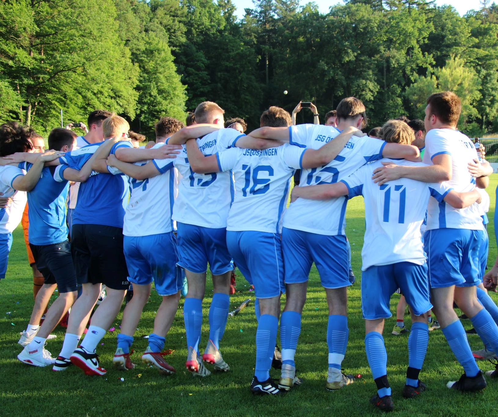 In der Halbzeit rückten die Jungs dann nochmals zusammen, um im zweiten Abschnitt zur Aufholjagd zu blasen. Mit vollem Tatendrang kam die Mannschaft aus der Kabine, um jedoch keine fünf Minuten nach Wiederanpfiff den nächsten Rückschlag hinnehmen zu müssen. Nach einem Konter des SV, der aus einem JSG-Standard resultierte, gab es Elfmeter für die Heimmannschaft, der zur 3:1 Führung verwandelt wurde. Aber auch der erneute Zwei-Tore-Rückstand konnte den Willen und Kampfgeist bei sommerlichen Temperaturen nicht brechen. Es dauerte wie schon im ersten Spielabschnitt keine drei Spielminuten, da konnten die Jungs auf 3:2 verkürzen. Nach einem weiten Ball von Linksverteidiger Süheyl S. war Stürmer Kevin S. durch und schloss im Sechzehner trocken zur seinem 7. Saisontreffer ab. Dieser Treffer entpuppte sich als Wirkungstreffer für unsere Mannschaft, der neue Kräfte freisetzte. Es ging nun rauf und runter auf dem Grün des Kickers-Stadion, auf dem mit zunehmender Spieldauer die Jungs der JSG immer mehr das Spiel an sich rissen. In der 70. Minute belohnten sie sich dann erneut und glichen zum 3:3 aus. Außenbahnspieler Luis B. konnte, nachdem er auf links freigespielt worden war, mit seinem stärkeren rechten Fuß vollenden. Luis B. war es dann erneut, der in der 84. Minute das Spiel endgültig drehte und alle Dämme brechen ließ. Mit seinem 10. Saisontreffer, der nach ähnlichem Strickmuster wie schon sein erster Treffer in diesem Spiel fiel, war der Aufstieg greifbar. Den berühmten Deckel auf das Spiel machte dann in der 88. Spielminute der eingewechselte Marius M. Nachdem er von Nicolas B. geschickt worden war, ließ er zunächst noch eine SV-Verteidiger aussteigen und schloss dann aus 16 Meter mit dem schwächeren linken Fuß zum 3:5 ab.