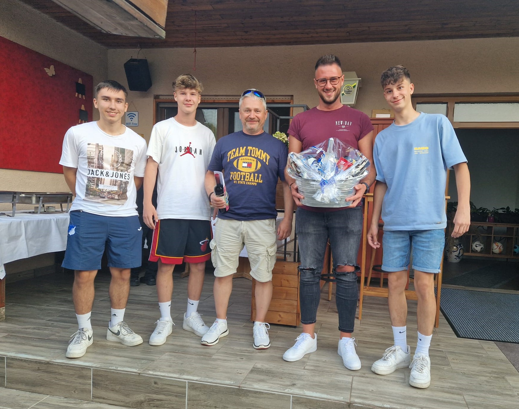 Trainer Andre, der bekanntlich nicht nur als Jugendtrainer, sondern auch als Torhüter beim FC Odenheim ausscheiden wird, war es ein großes Anliegen Danke zu sagen. Seinen Jungs für die gute Zusammenarbeit, die schönen Erlebnisse und den Spaß, den man gemeinsam hatte, sowie den Eltern und sonstigen Fans, die das Team bei jedem Spiel vorbildlich unterstützt haben. Unstrittig war in den Duellen unserer B-Junioren kein Gegner so gut vertreten, wie unser Team mit seiner „Fan-Base“. Nicht zu vergessen die tollen Feste, die zusammen gefeiert wurden, wie z.B. der heutige Saisonabschluss, das Sommergrillfest, Kabinenfest, Fasching (mit närrischem „Spezialtraining“) und viele weitere mehr. Diese waren dank der tollen Unterstützung der Eltern möglich. Besonders erwähnte Andre dabei Carmen Rattay, die immer den Verkauf bei den Heimspielen organisiert hatte und damit mit ihren Helfer/innen das Geld erwirtschaftete, mit dem die vorgenannten Feste gefeiert werden konnten. Und Xenia Völkel, Ira Quaty und Karina Rapisarda, die die Organisation für das heutige, sehr gelungene Saisonabschlussfest übernommen haben. Schließlich bedankte sich Andre auch bei seinem Trainerkollegen Tilo, der ihn immer unterstützt und mit dem er sich gut ergänzt hat.