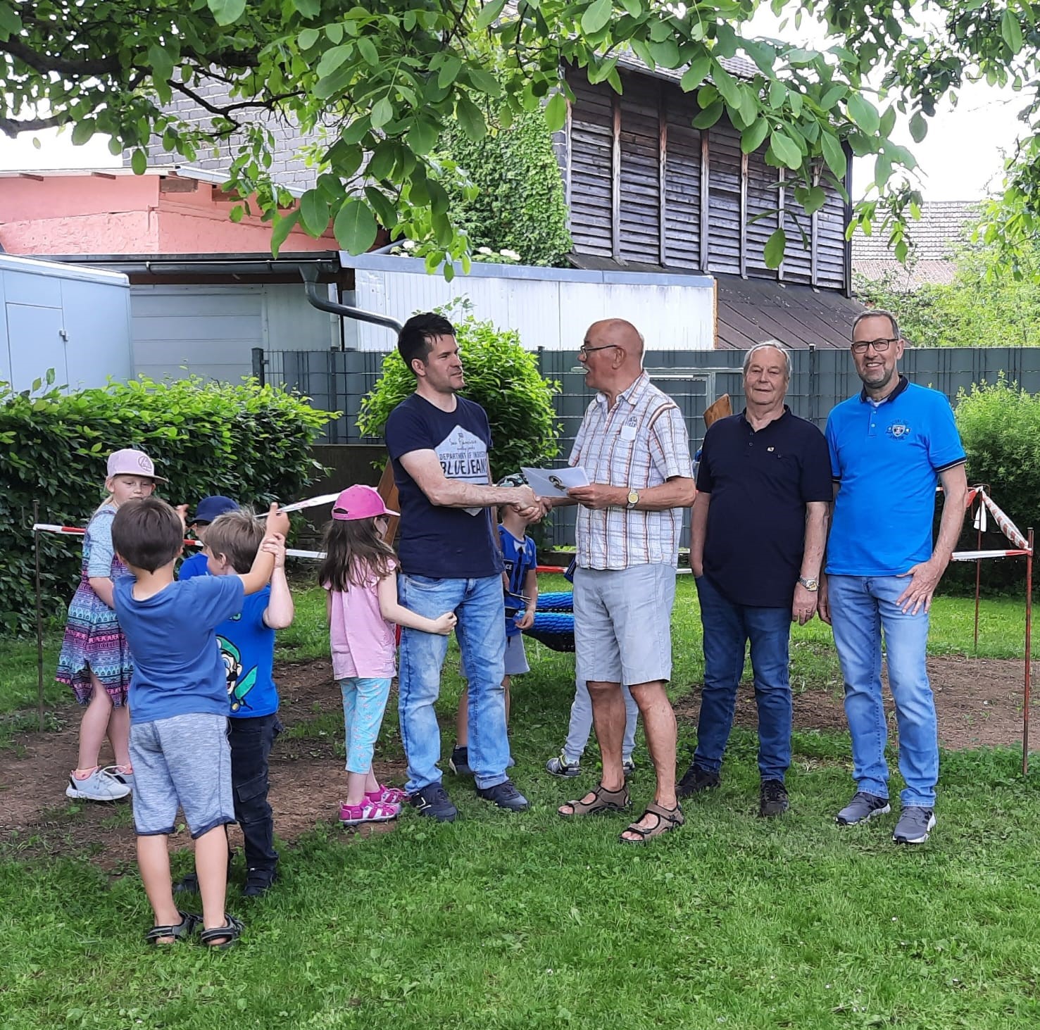 Am Samstag, den 21. Mai 2022, war es endlich soweit und die neue Nestschaukel am Itterplatz konnte eingeweiht werden. Hierzu hatte sich der Verein „Kinderspielplätze für Odenheim e.V.“ einiges einfallen lassen und ein tolles Programm zusammengestellt. In Anwesenheit von Vertretern aus Ortschafts- und Gemeindeverwaltung konnte unser Josef Bolich eine Spende in Höhe von 500 Euro zur Finanzierung dieses Projekts an den Vorstand Andreas Staudt übergeben. Diese tolle Spendensumme konnte durch den diesjährigen Holzverkauf während der Faschingszeit im Geschenkehaus Bolich sowie dem aufopferungsvollen Holzverkauf zweier Kienholzer (Vater und Sohn) am Rosenmontag erreicht werden. Andreas Staudt bedankte sich recht herzlich beim Kienholzclub für die Unterstützung und berichtete, dass mit der Gestaltung eines Spielplatzhügels bereits das nächste Projekt für den Sommer 2023 am Itterplatz geplant ist. (R.F.)
