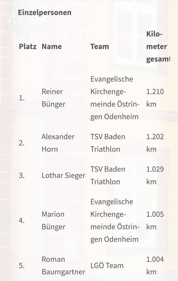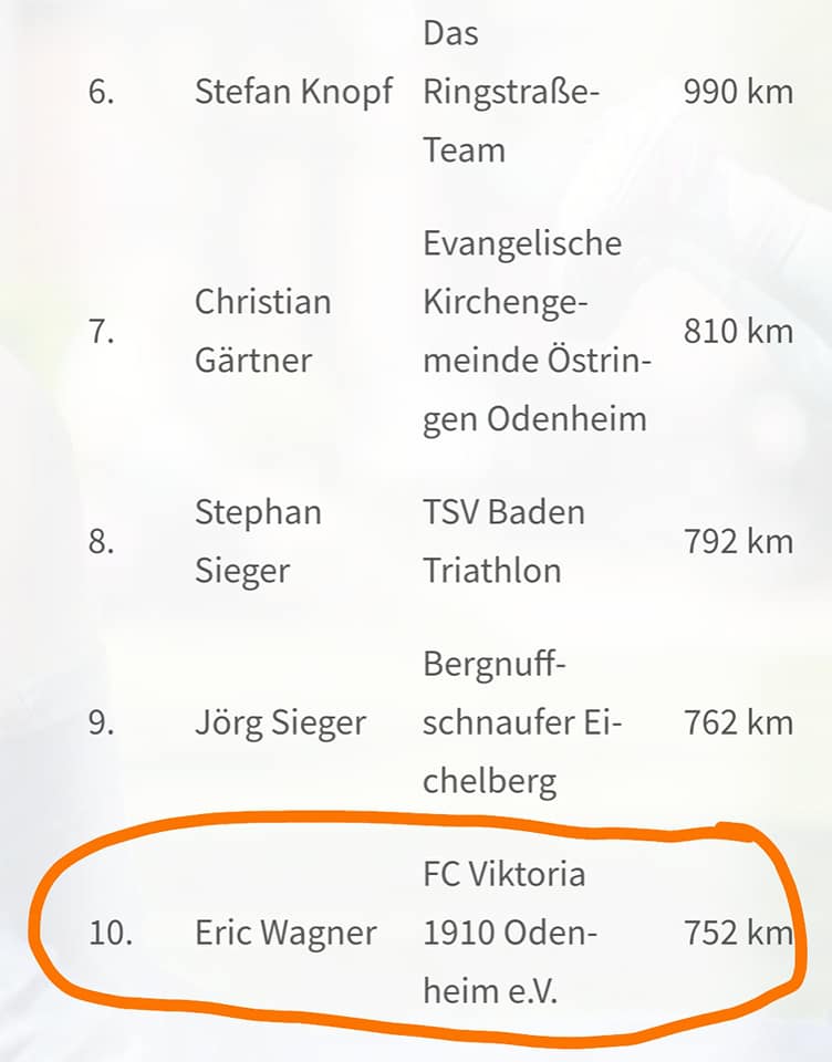 Unsere fleißigen 21 FCO-Radler*innen haben alles gegeben und am Ende sogar die 3.000-Kilometer-Grenze geknackt. Mit exakt 3.001 km belegt unser FCO damit von für Östringen 43 gemeldeten Gruppen einen starken 7. Platz. Super! Durchschnittlich ist jeder 143 km geradelt, wobei in unserem Team Eric Wagner mit 752,1 km den Bestwert erreichte und sich damit das „Gelbe FCO-Trikot“ verdiente. Unsere weiteren Teilnehmer*innen: Dieter und Dominik Schleweis, Rüdiger Frenzl, Tanja Schanzenbach, Herbert und Gabi Staudacker, Marius Wagner, Michael Keßler, Marcus und Daniela Schäfer, Andreas und Andrea May, Ursula Wagner, Berit Flächer, Florian Brenzinger, Tanja Sinibaldi, Michael Scherb, Roman und Viola Spitzer, Torsten Witte. Danke, dass ihr so fleißig „gedrebbelt“ habt.