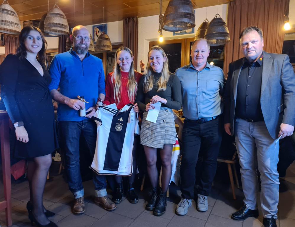 Der passende Anlass, unsere beiden FCO'lerinnen mit dieser Auszeichnung zu überraschen, bot sich bei der FCO-Weihnachtsfeier am Freitagabend. Im Zuge der an diesem Abend auch Ehrungen (weiterer Bericht folgt) wurden zunächst extra zusammengeschnittene Auszüge aus einem DFB-Film über die diesjährige Bildungsreise vorgespielt. Spannung im Clubhaus, trifft es etwa jemanden aus unserem Kreis? Vorstandsmitglied Torsten Witte löste das Geheimnis auf, bat Emily und Jenny nach vorne und überreichte diesen zusammen mit dem anwesenden Stellv. Kreisvorsitzenden Magnus Müller unter großem Applaus die Glückwunschschreiben des DFB und des Badischen Fußballverbandes sowie auch noch je ein Deutschlandtrikot.