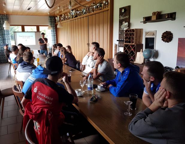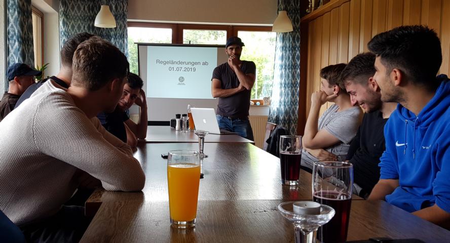 Am Sonntagnachmittag, den 14. Juli, im Anschluss an den mehrstündigen Trainingstag unserer Ersten, projizierte der Tageslichtprojektor im Nebenzimmer des FCO-Clubhauses die neuen Regeln an die Leinwand. Eingefunden hatten sich die Spieler unserer Ersten, mehrere Vereinsverantwortliche und auch einige Spielerinnen unseres Damenteams. Sie lauschten aufmerksam den Worten von Schiri Benni und immer wieder kam es auch zu Nachfragen und lebhaften Diskussionen.