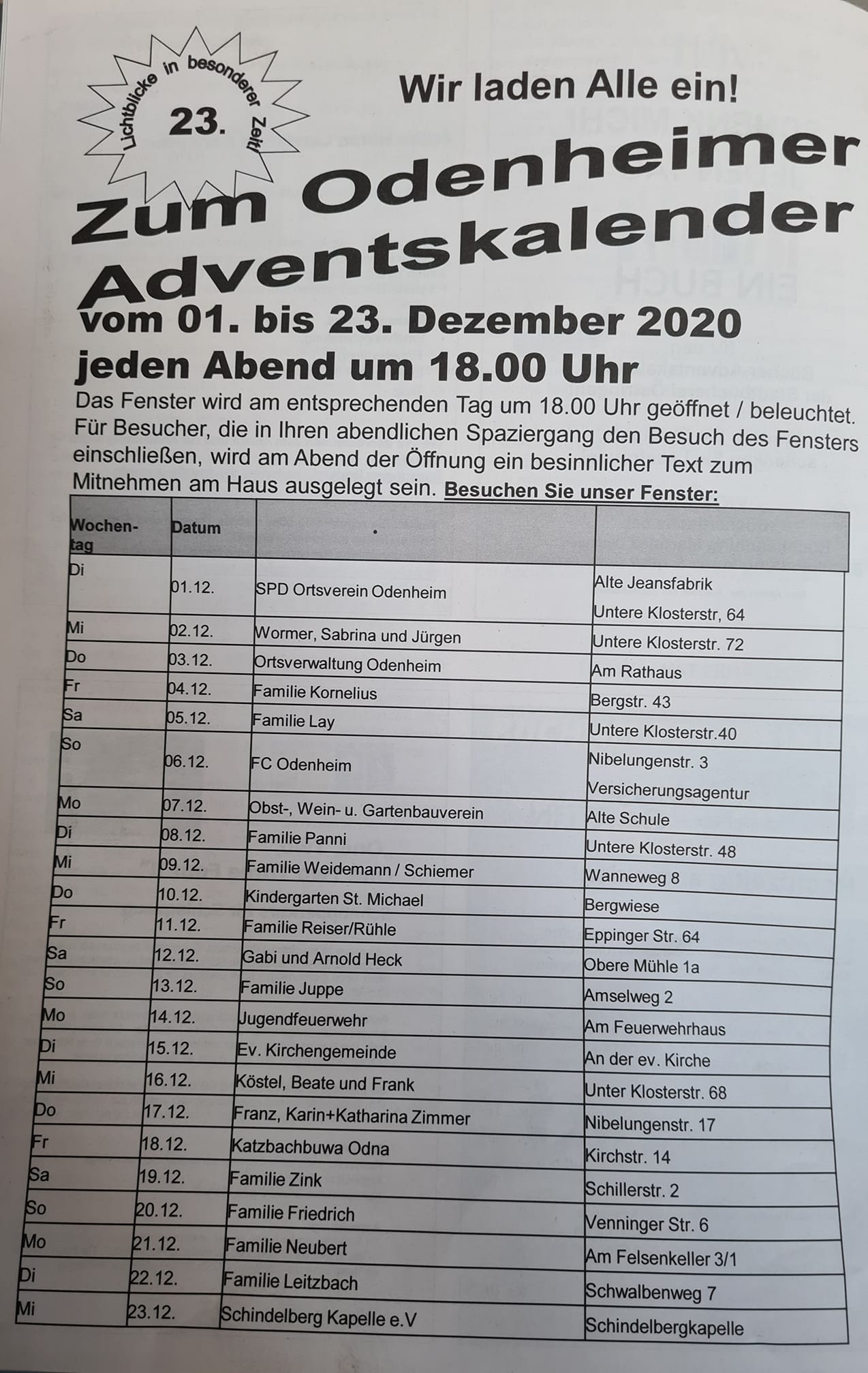 Vom 1. bis 23. Dezember 2020 wird in Odenheim jeden Abend um 18 Uhr an einem jeweils anderen Ort ein Adventsfenster geöffnet und beleuchtet.