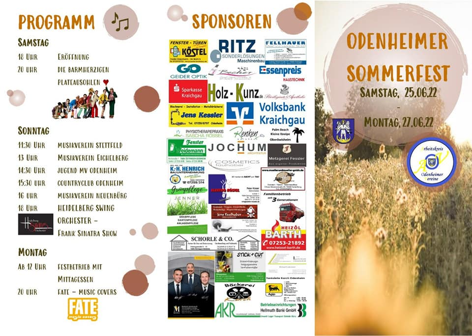 Nicht nur, dass damit nach der langen Corona-Auszeit das Kulturleben in Odenheim wiederbelebet werden konnte … nein, die Erwartungen wurden noch weit übertroffen. Alle drei Tage waren bestens besucht und die Musikbeiträge auf der Bühne ernteten viel Lob, insbesondere auch der Auftritt der Schlagerband „Die barmherzigen Plateausohlen” am Samstagabend. Die Helferinnen und Helfer der beteiligten Vereine waren im Dauereinsatz und das kulinarische Angebot wurde derart gut angenommen, dass pünktlich zum Festende am Montagabend bei allen Vereinen nahezu alle Speisen ausverkauft waren. Für Spaß und Unterhaltung für die Kleinen sorgten auch ein Stand zum Ballonwerfen und eine Schiffschaukel. Am Schnapsstand gab´s Leckeres für die Großen.