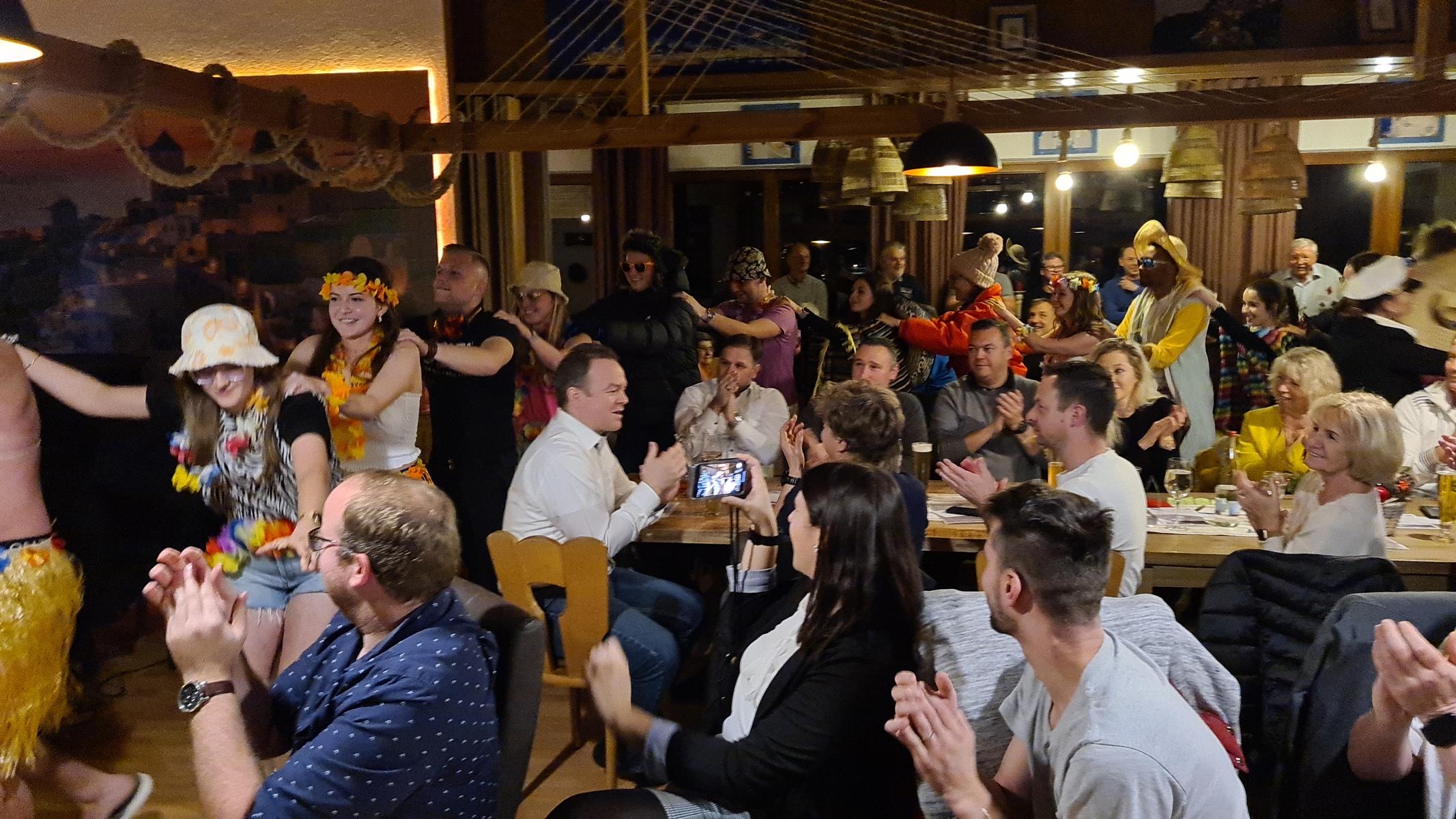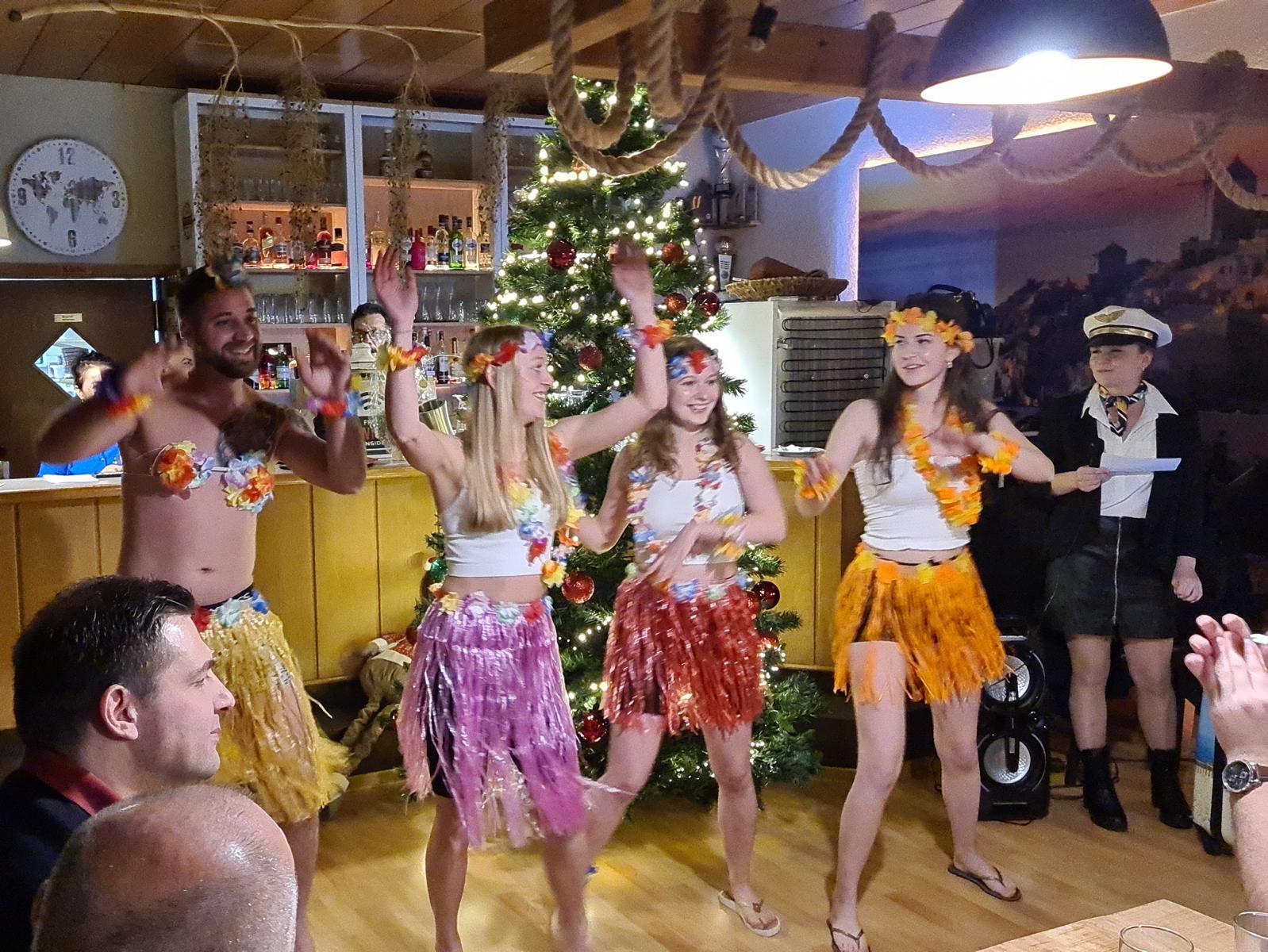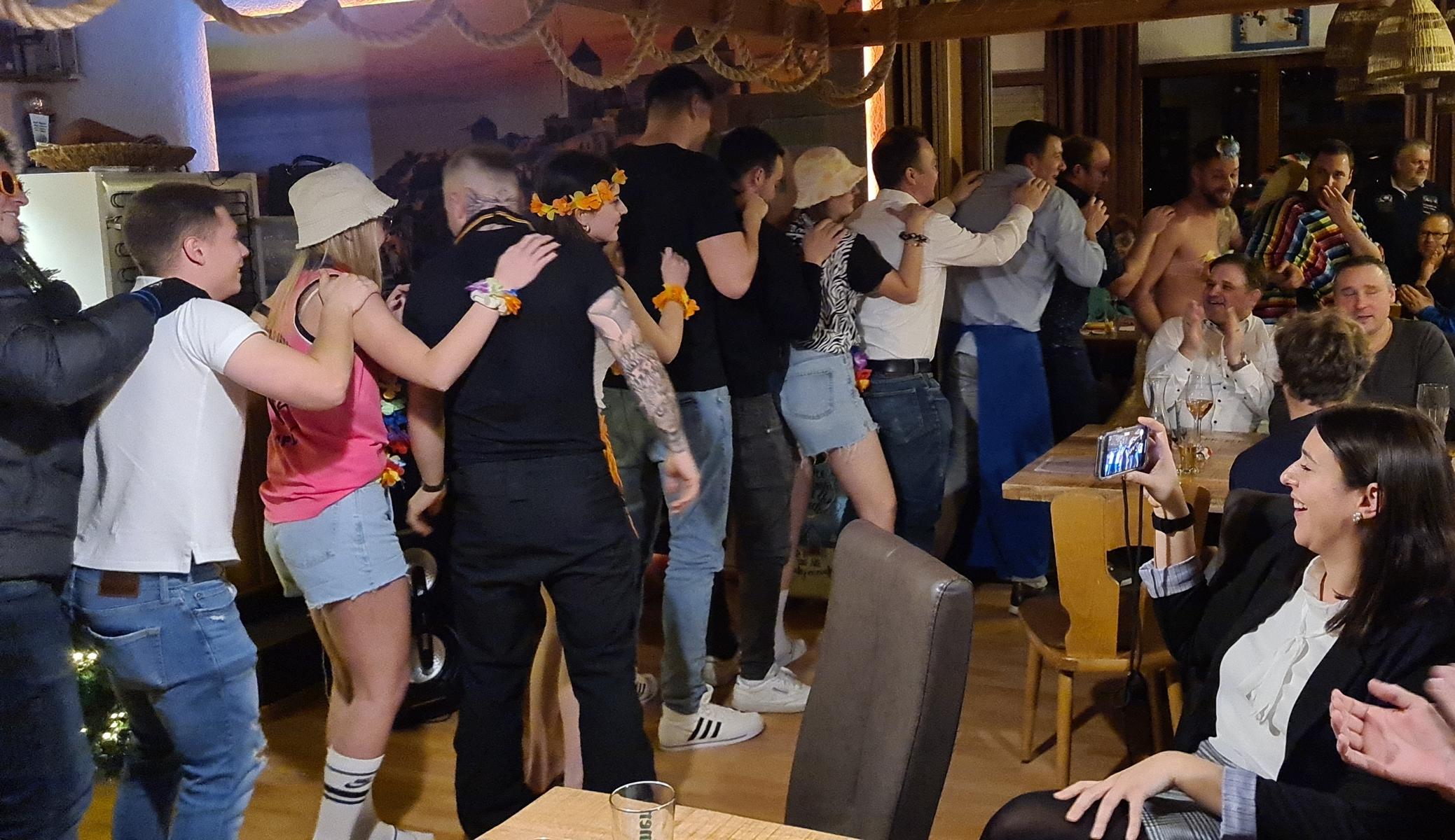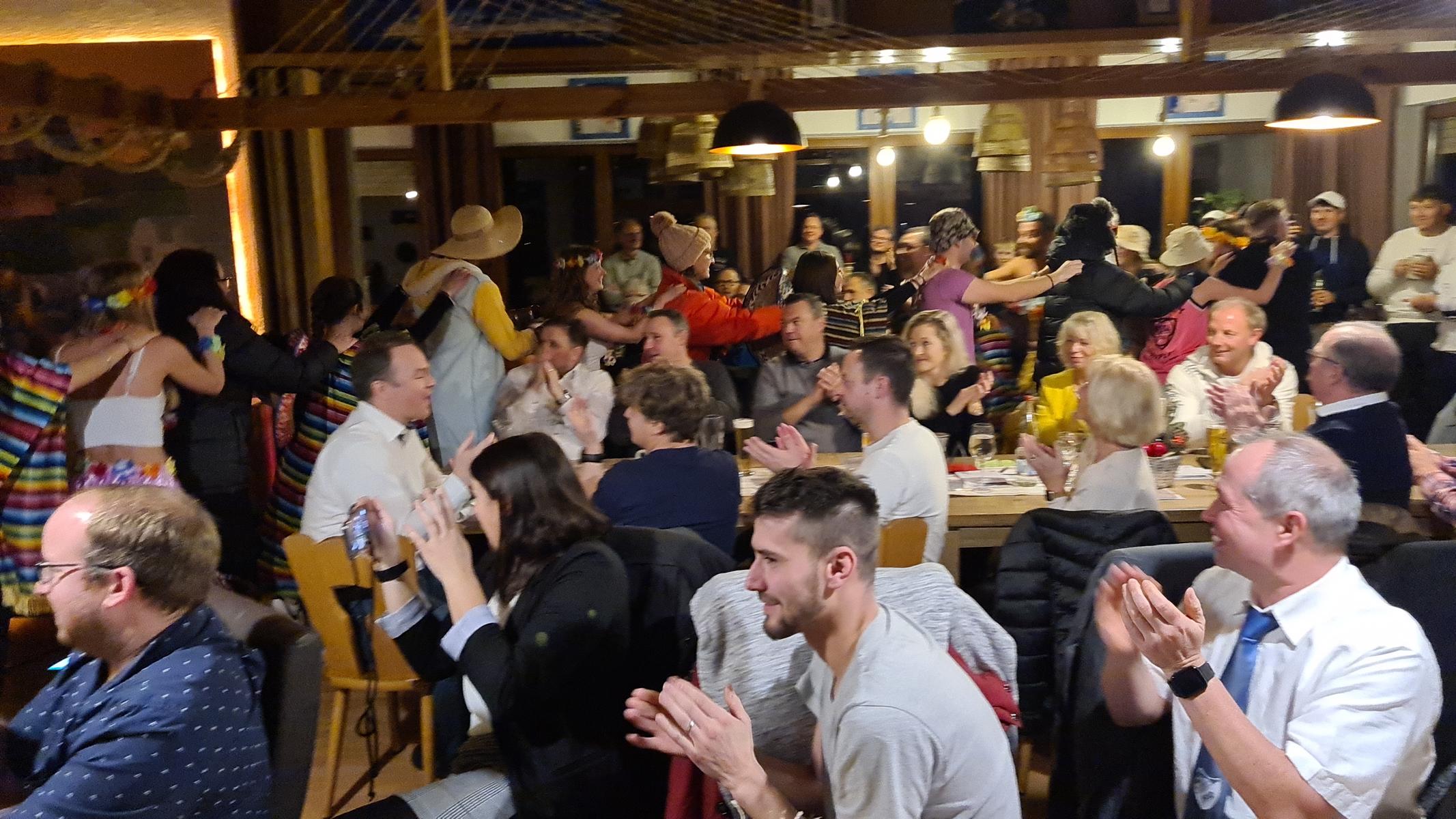 Es folgte der mit großer Vorfreude erwartete Beitrag unserer Damen- und 2. Herrenmannschaft, die mit ihrem gemeinsamen Aufritt den mannschaftsübergreifend großen Zusammenhalt unter Beweis stellten. Die Spielerinnen und Spieler nahmen uns tänzerisch auf eine kurzweilige und lustige „kulturelle und musikalische“ Weltreise mit. „Stewardess“ Anja begrüßte die Mitreisenden im Namen der „Amazonen-Airline“ und bat darum „die Sitze in eine aufrechte Position zu bringen sowie die Sicherheitsgurte anzulegen“. Auf der Reise rund um die Welt machten vier Gipfelstürmer/innen den Auftakt und entführten unter den Klängen von „Skifoan“ ins Skiparadies Österreich. Weiter ging der Flug ins „17. Bundesland“ nach Mallorca. Anja empfahl den Ausstieg nur den „erfahrenen Jägermeister- und Bierkrug-Veteranen“, alle Gäste durften aber am folgenden Ballermann-Auftritt teilhaben, den eine von „Helmut“ angeführte vierköpfige Gruppe vorführte. Besondere und unvergessene Pointe war dabei zum exakt Beginn des Auftritts, der Miteinmarsch von zwei erfahrenen Partyherren. Ob dies so geplant war? ;-) Für lauthalses Lachen sorgte dies auf jeden Fall. Anschließend konnte man die Flugreise über den großen Teich „zur Ausnüchterung“ nutzen. Drei „braungebrannte“ hübsche Damen betraten in Hawaii-Röckchen die Tanzfläche, ehe ihnen ein weiteres Weibchen (oder war es etwa ein Kerl?) hinterhereilte und den gemeinsamen Tanz auch noch mit einem umjubelten Handstand krönte. Unsere Gäste blieben im Flieger und erreichten nun das Reiseziel Amerika, wo sie bei „Viva la Mexico“ vier „Mexikaner/innen“ in Ponchos mit ihrer Kultur vertraut machten. „Weil´s awer dähom immer noch äm allerallerscheenschder isch, hämmä uns gedenkt, jetzt machä mär noch ä Woch in Balkonien!“ Damit rief Anja den Höhepunkt des Auftritts aus und es steuerte mit der Partymusik „Jetzt ist der Teufel los“ minutenlang eine riesige Polonäse durch das Clubhaus-Restaurant. Unseren Spielerinnen und Spielern schlossen sich dabei viele weitere FCO´ler/innen an, darunter auch unser seine Schürze schwingender Wirt Dimi. Schee war´s!