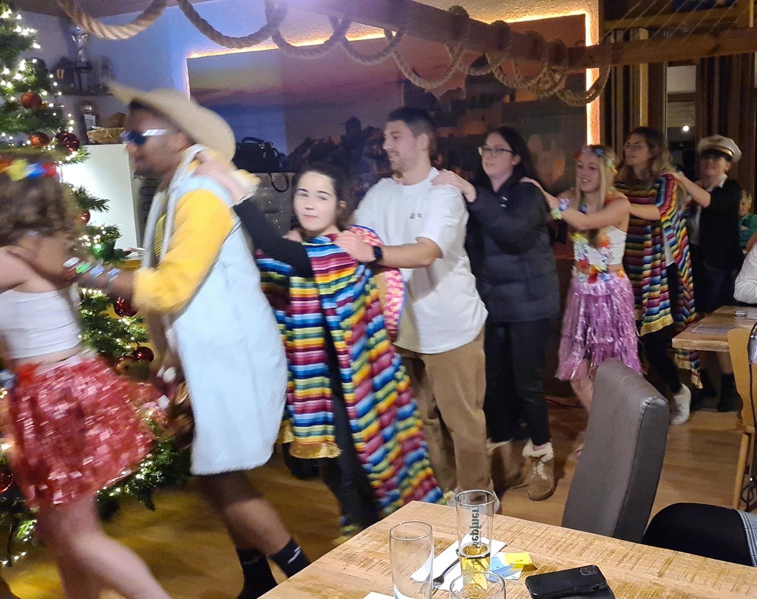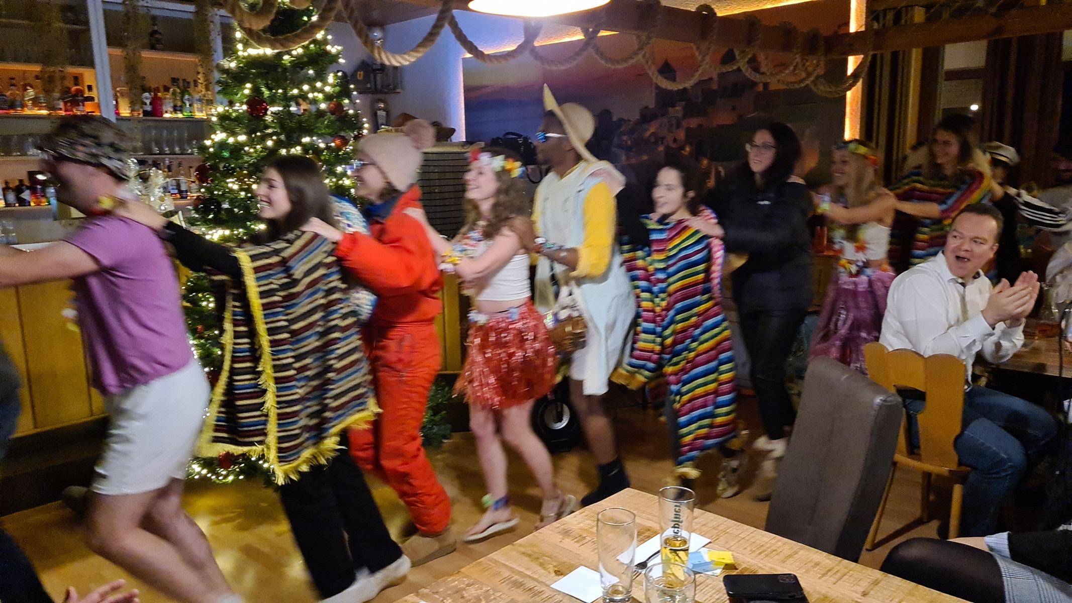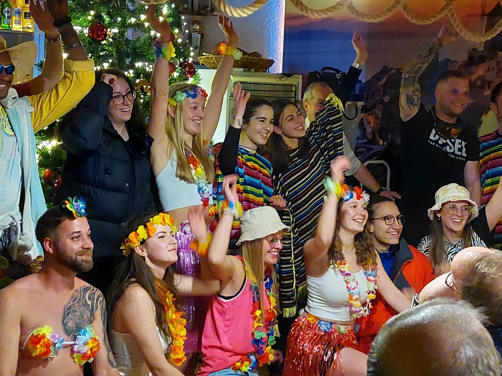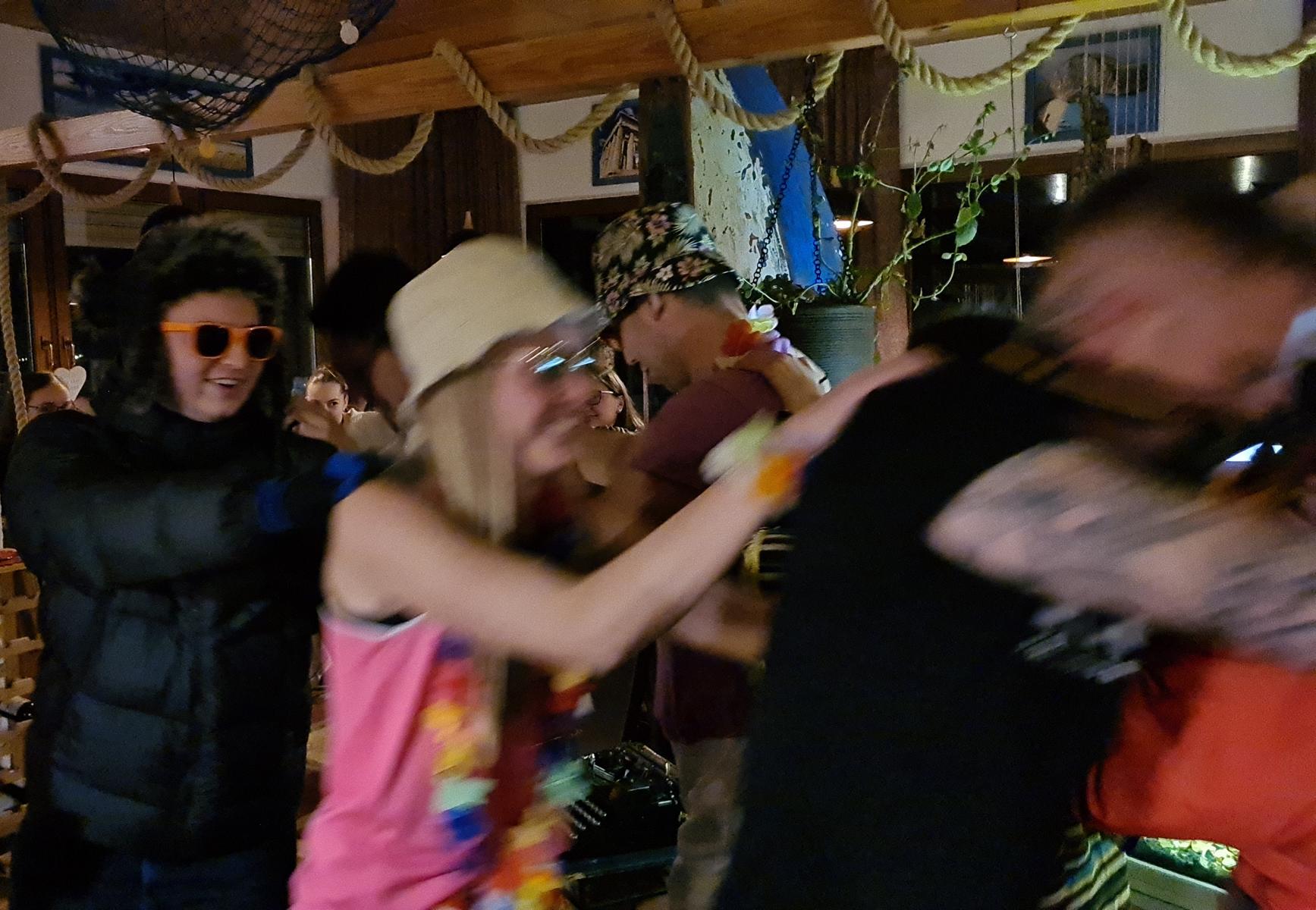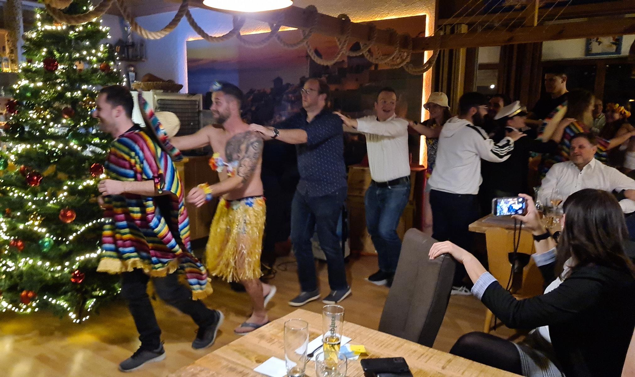 Es folgte der mit großer Vorfreude erwartete Beitrag unserer Damen- und 2. Herrenmannschaft, die mit ihrem gemeinsamen Aufritt den mannschaftsübergreifend großen Zusammenhalt unter Beweis stellten. Die Spielerinnen und Spieler nahmen uns tänzerisch auf eine kurzweilige und lustige „kulturelle und musikalische“ Weltreise mit. „Stewardess“ Anja begrüßte die Mitreisenden im Namen der „Amazonen-Airline“ und bat darum „die Sitze in eine aufrechte Position zu bringen sowie die Sicherheitsgurte anzulegen“. Auf der Reise rund um die Welt machten vier Gipfelstürmer/innen den Auftakt und entführten unter den Klängen von „Skifoan“ ins Skiparadies Österreich. Weiter ging der Flug ins „17. Bundesland“ nach Mallorca. Anja empfahl den Ausstieg nur den „erfahrenen Jägermeister- und Bierkrug-Veteranen“, alle Gäste durften aber am folgenden Ballermann-Auftritt teilhaben, den eine von „Helmut“ angeführte vierköpfige Gruppe vorführte. Besondere und unvergessene Pointe war dabei zum exakt Beginn des Auftritts, der Miteinmarsch von zwei erfahrenen Partyherren. Ob dies so geplant war? ;-) Für lauthalses Lachen sorgte dies auf jeden Fall. Anschließend konnte man die Flugreise über den großen Teich „zur Ausnüchterung“ nutzen. Drei „braungebrannte“ hübsche Damen betraten in Hawaii-Röckchen die Tanzfläche, ehe ihnen ein weiteres Weibchen (oder war es etwa ein Kerl?) hinterhereilte und den gemeinsamen Tanz auch noch mit einem umjubelten Handstand krönte. Unsere Gäste blieben im Flieger und erreichten nun das Reiseziel Amerika, wo sie bei „Viva la Mexico“ vier „Mexikaner/innen“ in Ponchos mit ihrer Kultur vertraut machten. „Weil´s awer dähom immer noch äm allerallerscheenschder isch, hämmä uns gedenkt, jetzt machä mär noch ä Woch in Balkonien!“ Damit rief Anja den Höhepunkt des Auftritts aus und es steuerte mit der Partymusik „Jetzt ist der Teufel los“ minutenlang eine riesige Polonäse durch das Clubhaus-Restaurant. Unseren Spielerinnen und Spielern schlossen sich dabei viele weitere FCO´ler/innen an, darunter auch unser seine Schürze schwingender Wirt Dimi. Schee war´s!