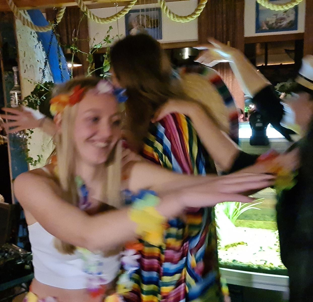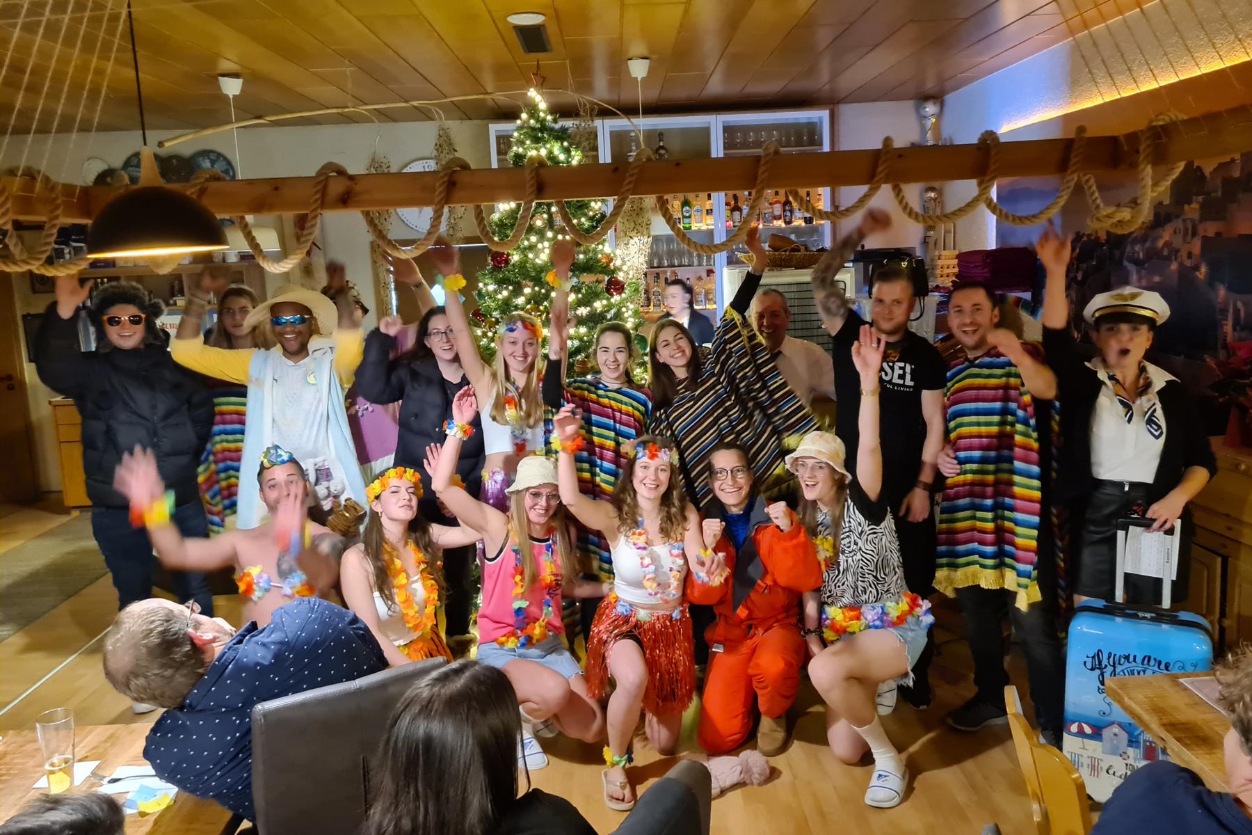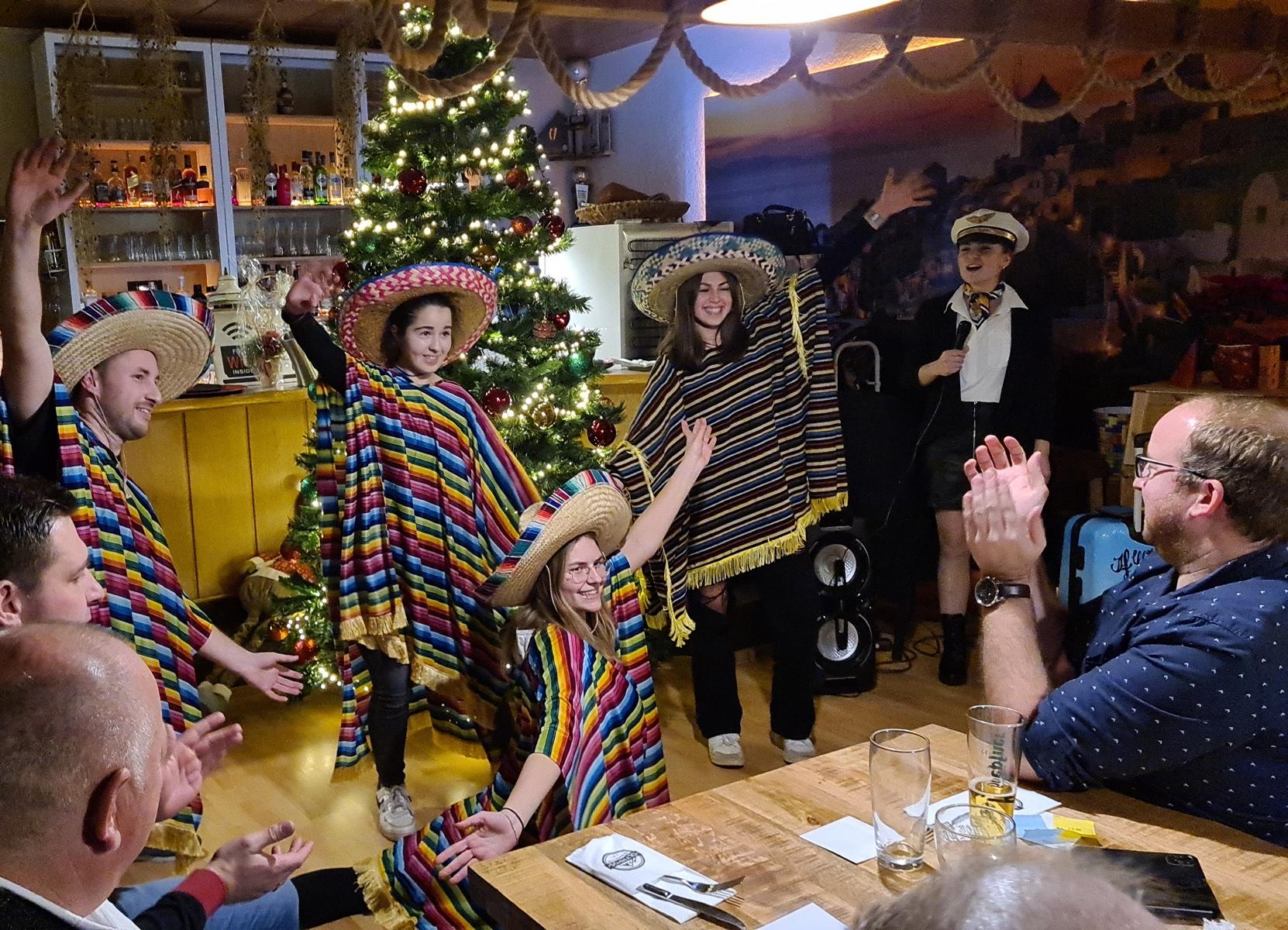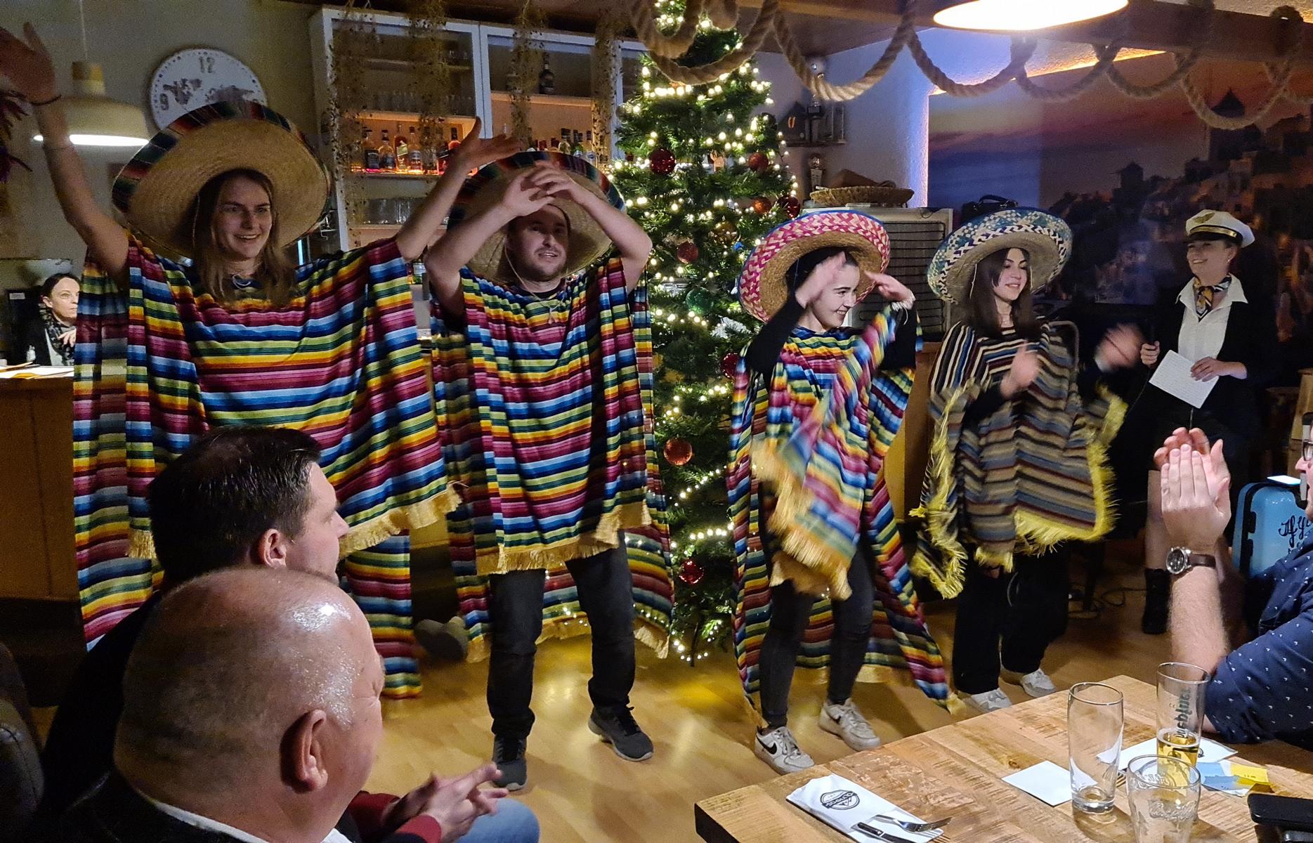 Es folgte der mit großer Vorfreude erwartete Beitrag unserer Damen- und 2. Herrenmannschaft, die mit ihrem gemeinsamen Aufritt den mannschaftsübergreifend großen Zusammenhalt unter Beweis stellten. Die Spielerinnen und Spieler nahmen uns tänzerisch auf eine kurzweilige und lustige „kulturelle und musikalische“ Weltreise mit. „Stewardess“ Anja begrüßte die Mitreisenden im Namen der „Amazonen-Airline“ und bat darum „die Sitze in eine aufrechte Position zu bringen sowie die Sicherheitsgurte anzulegen“. Auf der Reise rund um die Welt machten vier Gipfelstürmer/innen den Auftakt und entführten unter den Klängen von „Skifoan“ ins Skiparadies Österreich. Weiter ging der Flug ins „17. Bundesland“ nach Mallorca. Anja empfahl den Ausstieg nur den „erfahrenen Jägermeister- und Bierkrug-Veteranen“, alle Gäste durften aber am folgenden Ballermann-Auftritt teilhaben, den eine von „Helmut“ angeführte vierköpfige Gruppe vorführte. Besondere und unvergessene Pointe war dabei zum exakt Beginn des Auftritts, der Miteinmarsch von zwei erfahrenen Partyherren. Ob dies so geplant war? ;-) Für lauthalses Lachen sorgte dies auf jeden Fall. Anschließend konnte man die Flugreise über den großen Teich „zur Ausnüchterung“ nutzen. Drei „braungebrannte“ hübsche Damen betraten in Hawaii-Röckchen die Tanzfläche, ehe ihnen ein weiteres Weibchen (oder war es etwa ein Kerl?) hinterhereilte und den gemeinsamen Tanz auch noch mit einem umjubelten Handstand krönte. Unsere Gäste blieben im Flieger und erreichten nun das Reiseziel Amerika, wo sie bei „Viva la Mexico“ vier „Mexikaner/innen“ in Ponchos mit ihrer Kultur vertraut machten. „Weil´s awer dähom immer noch äm allerallerscheenschder isch, hämmä uns gedenkt, jetzt machä mär noch ä Woch in Balkonien!“ Damit rief Anja den Höhepunkt des Auftritts aus und es steuerte mit der Partymusik „Jetzt ist der Teufel los“ minutenlang eine riesige Polonäse durch das Clubhaus-Restaurant. Unseren Spielerinnen und Spielern schlossen sich dabei viele weitere FCO´ler/innen an, darunter auch unser seine Schürze schwingender Wirt Dimi. Schee war´s!