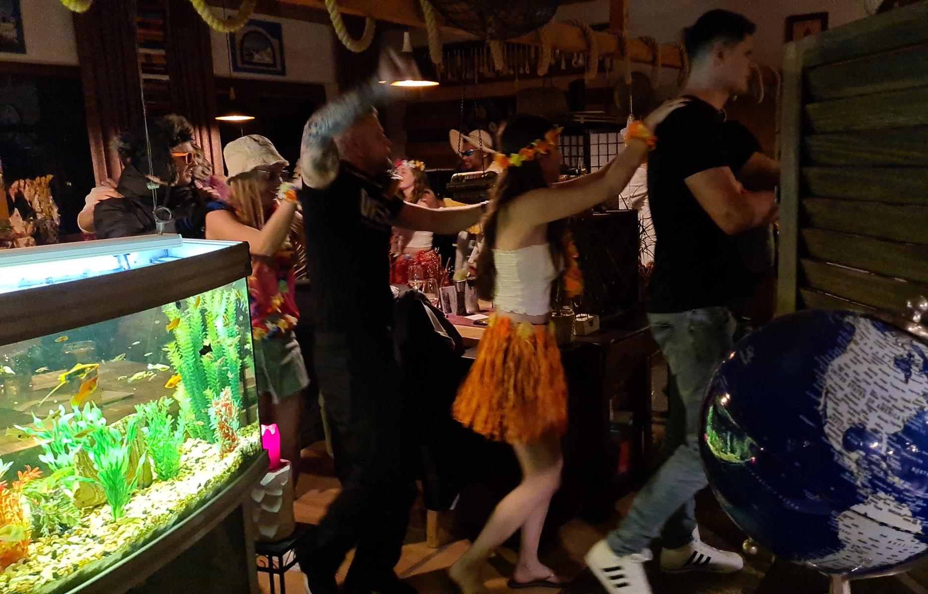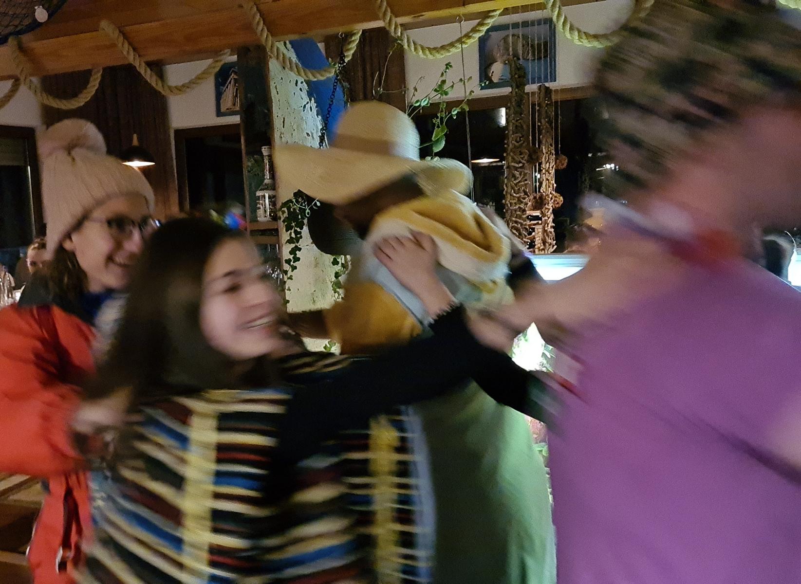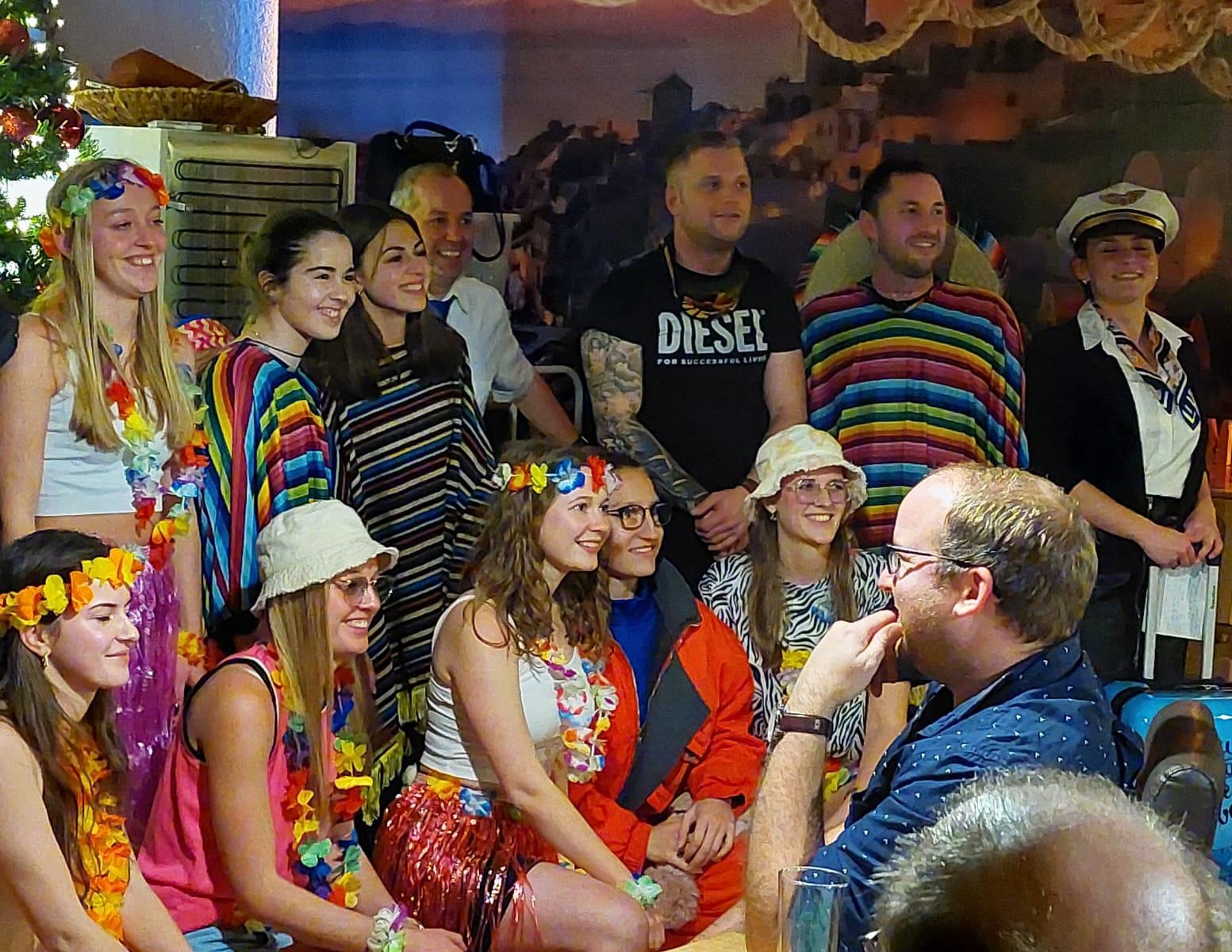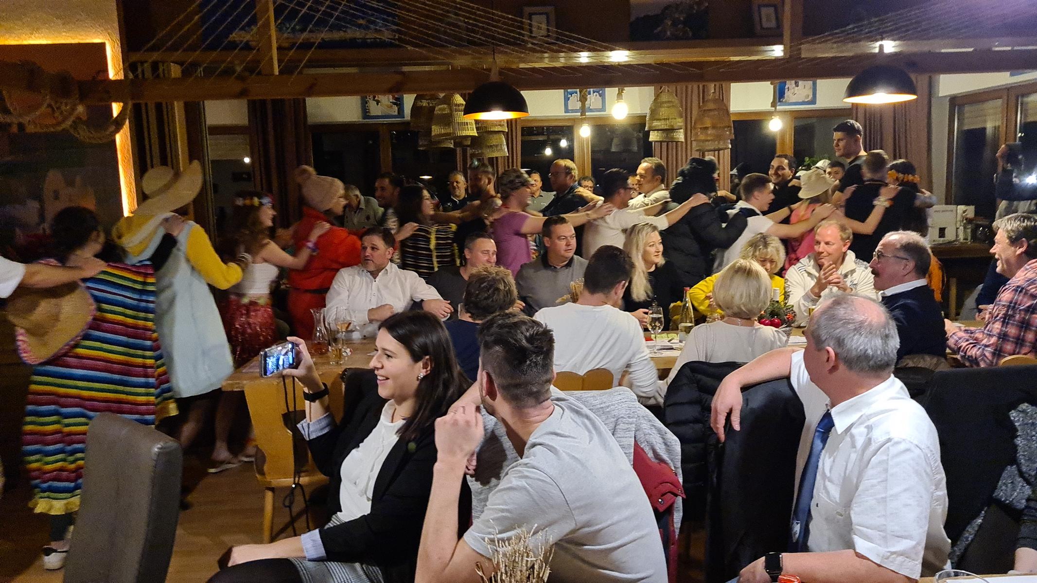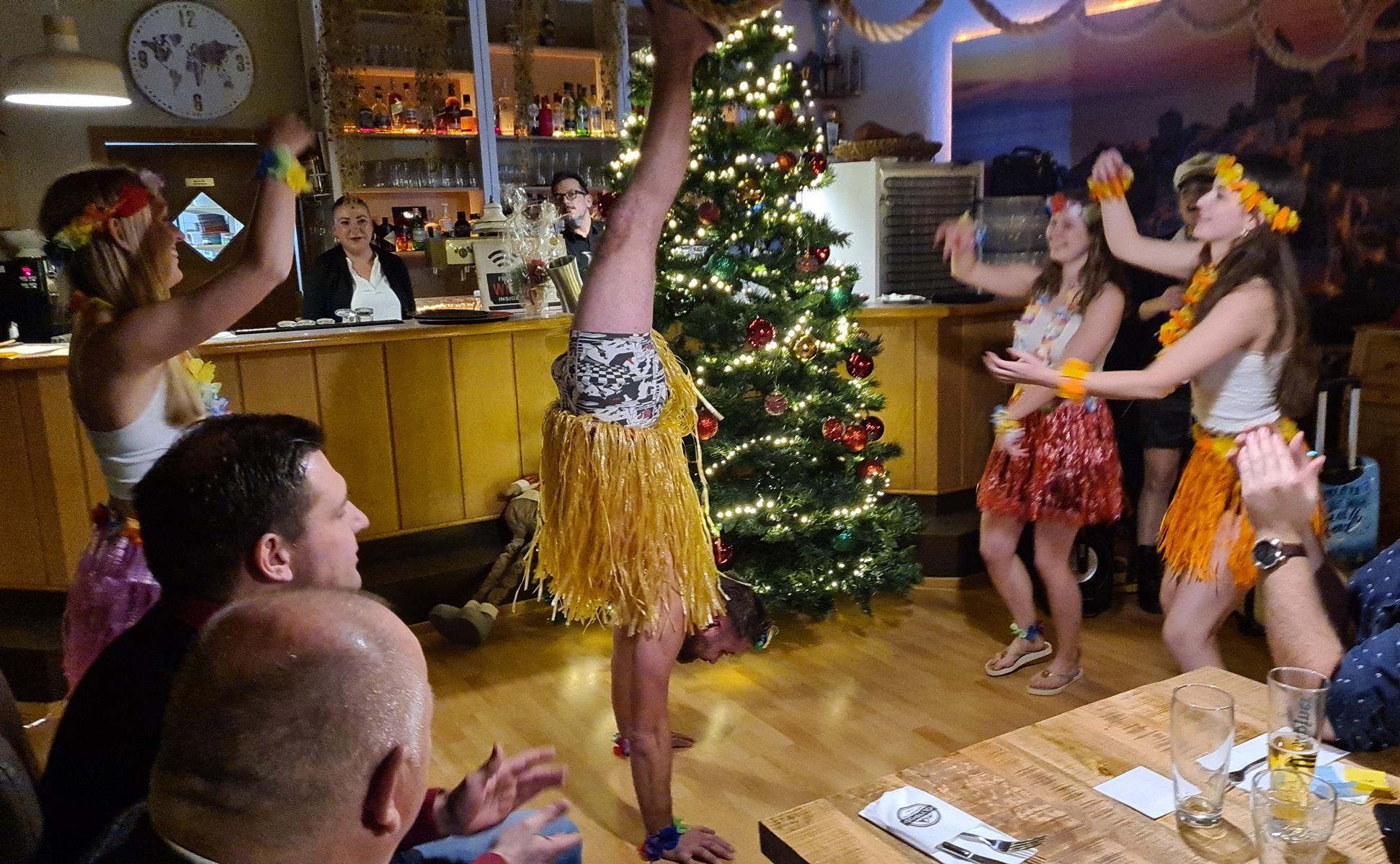 Es folgte der mit großer Vorfreude erwartete Beitrag unserer Damen- und 2. Herrenmannschaft, die mit ihrem gemeinsamen Aufritt den mannschaftsübergreifend großen Zusammenhalt unter Beweis stellten. Die Spielerinnen und Spieler nahmen uns tänzerisch auf eine kurzweilige und lustige „kulturelle und musikalische“ Weltreise mit. „Stewardess“ Anja begrüßte die Mitreisenden im Namen der „Amazonen-Airline“ und bat darum „die Sitze in eine aufrechte Position zu bringen sowie die Sicherheitsgurte anzulegen“. Auf der Reise rund um die Welt machten vier Gipfelstürmer/innen den Auftakt und entführten unter den Klängen von „Skifoan“ ins Skiparadies Österreich. Weiter ging der Flug ins „17. Bundesland“ nach Mallorca. Anja empfahl den Ausstieg nur den „erfahrenen Jägermeister- und Bierkrug-Veteranen“, alle Gäste durften aber am folgenden Ballermann-Auftritt teilhaben, den eine von „Helmut“ angeführte vierköpfige Gruppe vorführte. Besondere und unvergessene Pointe war dabei zum exakt Beginn des Auftritts, der Miteinmarsch von zwei erfahrenen Partyherren. Ob dies so geplant war? ;-) Für lauthalses Lachen sorgte dies auf jeden Fall. Anschließend konnte man die Flugreise über den großen Teich „zur Ausnüchterung“ nutzen. Drei „braungebrannte“ hübsche Damen betraten in Hawaii-Röckchen die Tanzfläche, ehe ihnen ein weiteres Weibchen (oder war es etwa ein Kerl?) hinterhereilte und den gemeinsamen Tanz auch noch mit einem umjubelten Handstand krönte. Unsere Gäste blieben im Flieger und erreichten nun das Reiseziel Amerika, wo sie bei „Viva la Mexico“ vier „Mexikaner/innen“ in Ponchos mit ihrer Kultur vertraut machten. „Weil´s awer dähom immer noch äm allerallerscheenschder isch, hämmä uns gedenkt, jetzt machä mär noch ä Woch in Balkonien!“ Damit rief Anja den Höhepunkt des Auftritts aus und es steuerte mit der Partymusik „Jetzt ist der Teufel los“ minutenlang eine riesige Polonäse durch das Clubhaus-Restaurant. Unseren Spielerinnen und Spielern schlossen sich dabei viele weitere FCO´ler/innen an, darunter auch unser seine Schürze schwingender Wirt Dimi. Schee war´s!