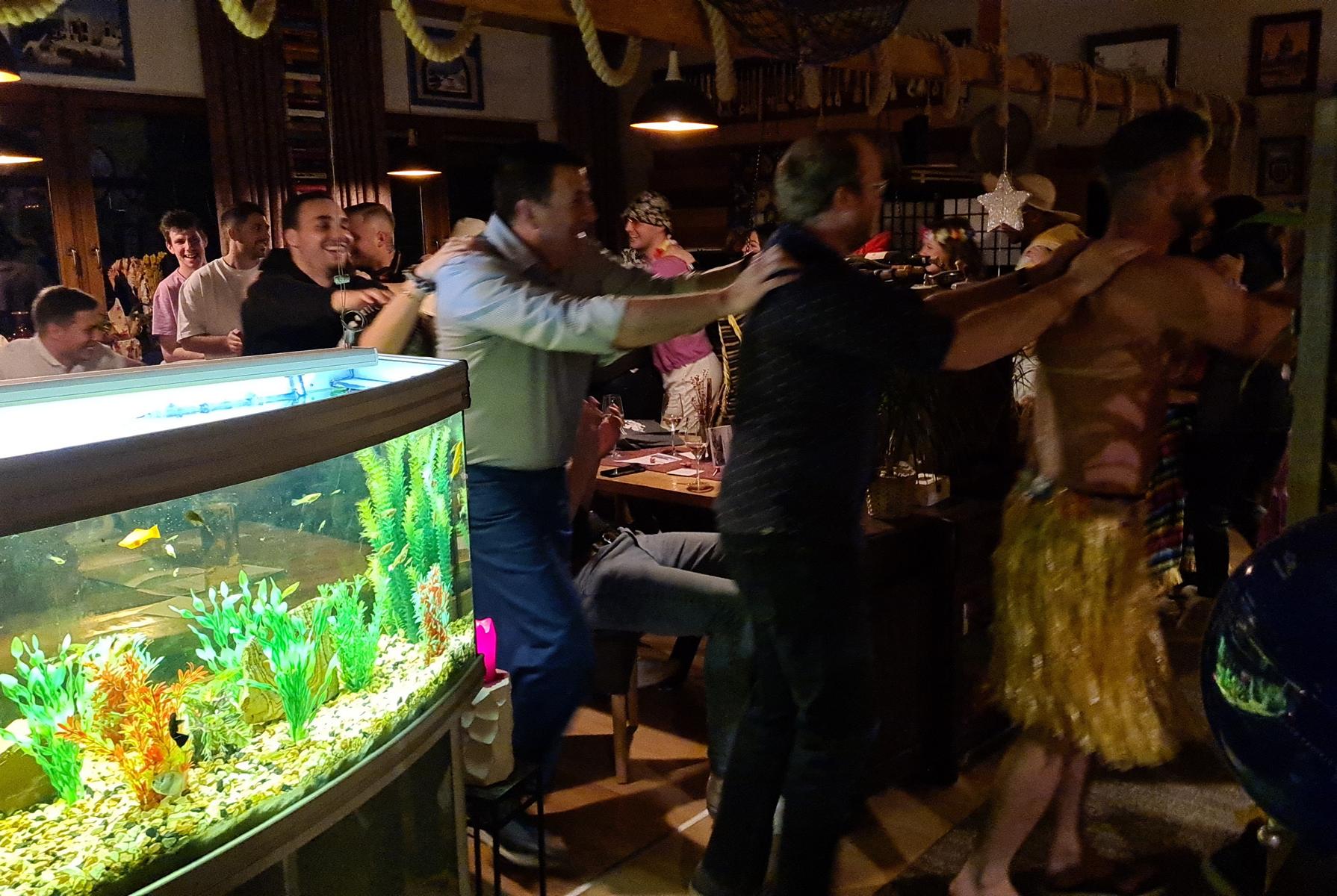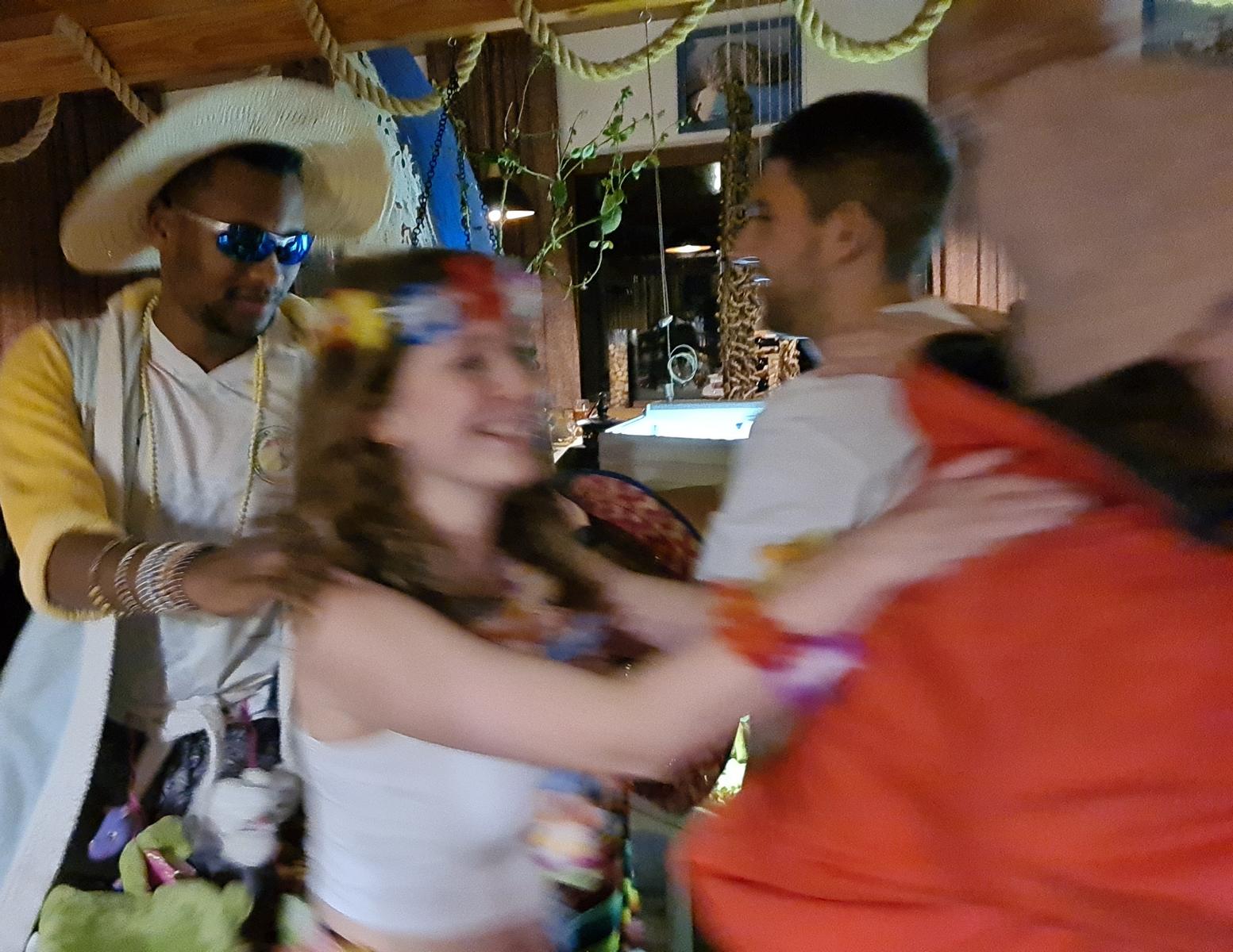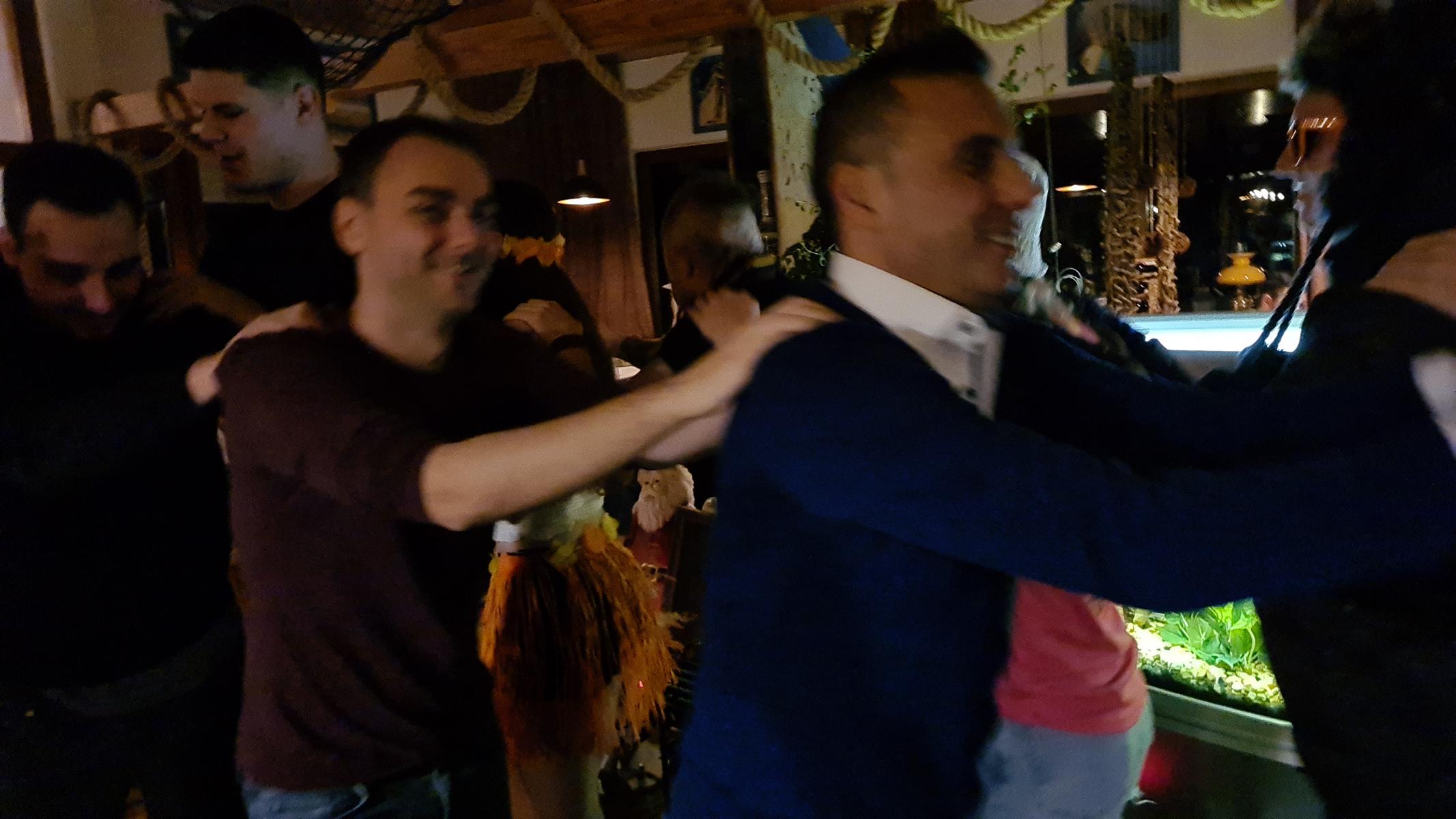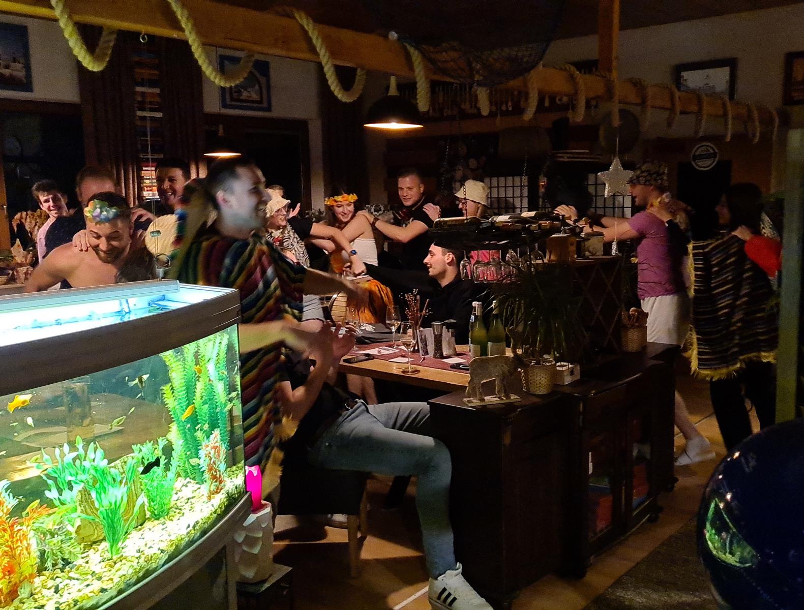 Es folgte der mit großer Vorfreude erwartete Beitrag unserer Damen- und 2. Herrenmannschaft, die mit ihrem gemeinsamen Aufritt den mannschaftsübergreifend großen Zusammenhalt unter Beweis stellten. Die Spielerinnen und Spieler nahmen uns tänzerisch auf eine kurzweilige und lustige „kulturelle und musikalische“ Weltreise mit. „Stewardess“ Anja begrüßte die Mitreisenden im Namen der „Amazonen-Airline“ und bat darum „die Sitze in eine aufrechte Position zu bringen sowie die Sicherheitsgurte anzulegen“. Auf der Reise rund um die Welt machten vier Gipfelstürmer/innen den Auftakt und entführten unter den Klängen von „Skifoan“ ins Skiparadies Österreich. Weiter ging der Flug ins „17. Bundesland“ nach Mallorca. Anja empfahl den Ausstieg nur den „erfahrenen Jägermeister- und Bierkrug-Veteranen“, alle Gäste durften aber am folgenden Ballermann-Auftritt teilhaben, den eine von „Helmut“ angeführte vierköpfige Gruppe vorführte. Besondere und unvergessene Pointe war dabei zum exakt Beginn des Auftritts, der Miteinmarsch von zwei erfahrenen Partyherren. Ob dies so geplant war? ;-) Für lauthalses Lachen sorgte dies auf jeden Fall. Anschließend konnte man die Flugreise über den großen Teich „zur Ausnüchterung“ nutzen. Drei „braungebrannte“ hübsche Damen betraten in Hawaii-Röckchen die Tanzfläche, ehe ihnen ein weiteres Weibchen (oder war es etwa ein Kerl?) hinterhereilte und den gemeinsamen Tanz auch noch mit einem umjubelten Handstand krönte. Unsere Gäste blieben im Flieger und erreichten nun das Reiseziel Amerika, wo sie bei „Viva la Mexico“ vier „Mexikaner/innen“ in Ponchos mit ihrer Kultur vertraut machten. „Weil´s awer dähom immer noch äm allerallerscheenschder isch, hämmä uns gedenkt, jetzt machä mär noch ä Woch in Balkonien!“ Damit rief Anja den Höhepunkt des Auftritts aus und es steuerte mit der Partymusik „Jetzt ist der Teufel los“ minutenlang eine riesige Polonäse durch das Clubhaus-Restaurant. Unseren Spielerinnen und Spielern schlossen sich dabei viele weitere FCO´ler/innen an, darunter auch unser seine Schürze schwingender Wirt Dimi. Schee war´s!