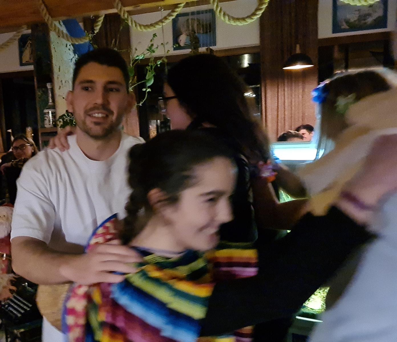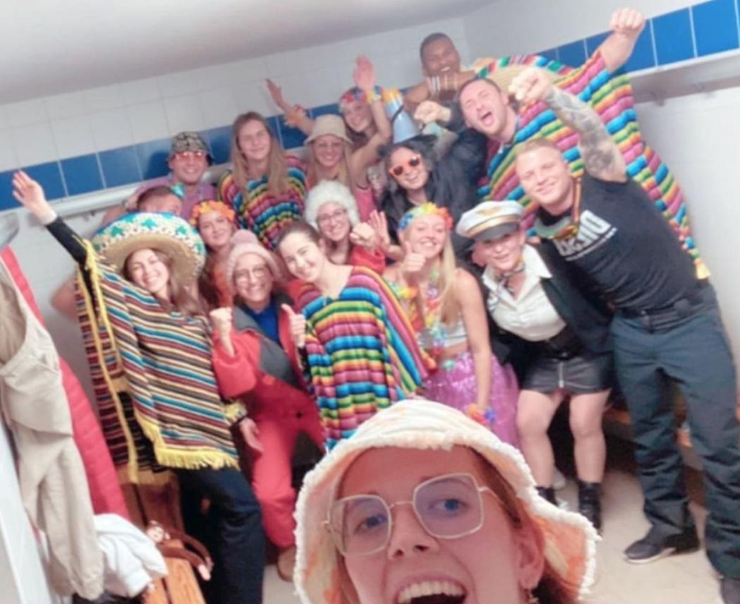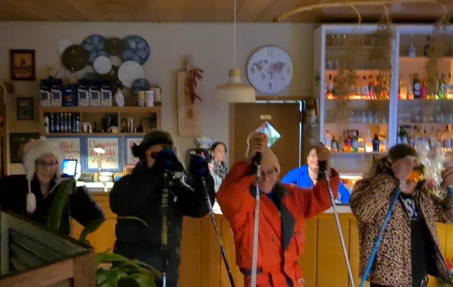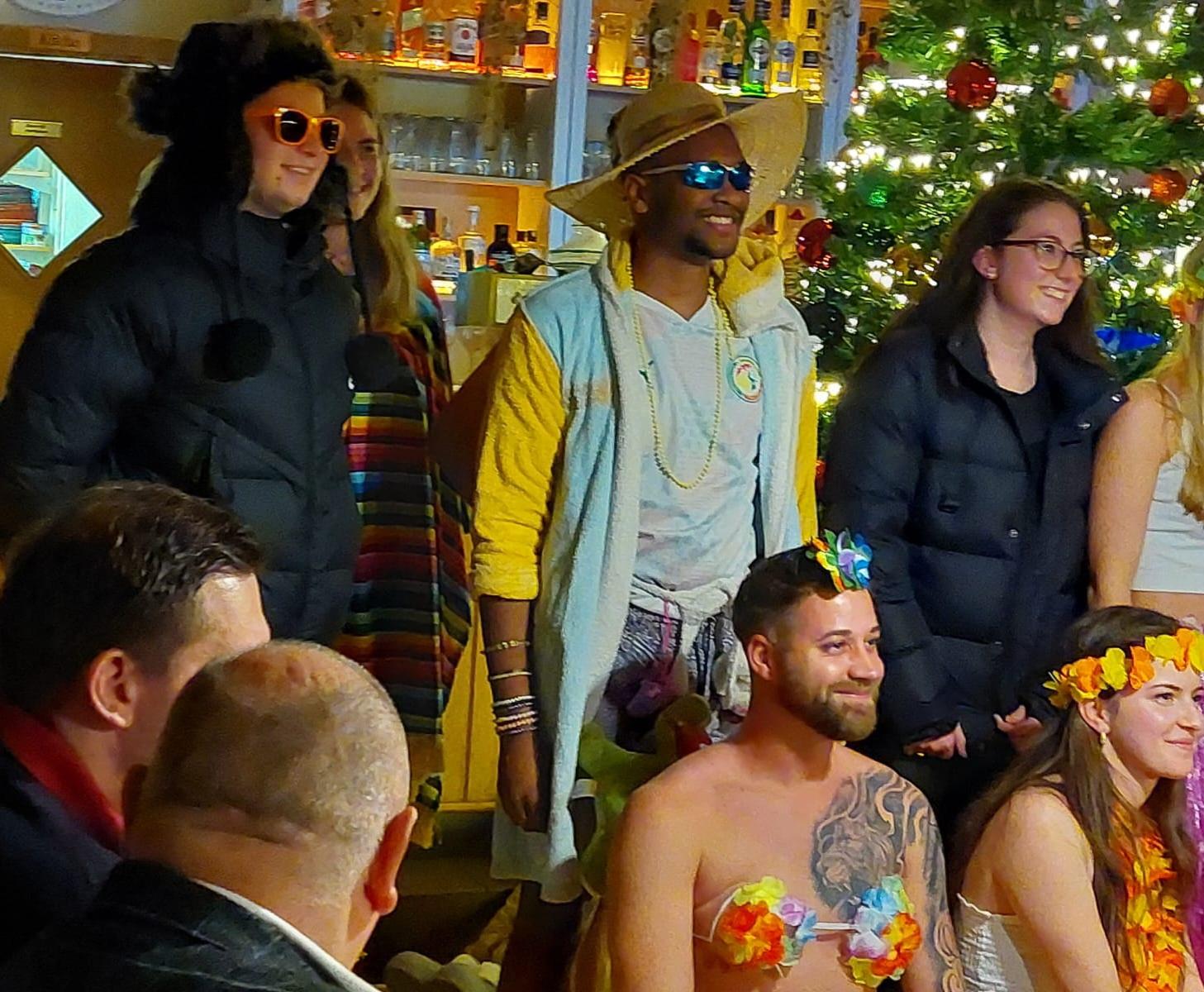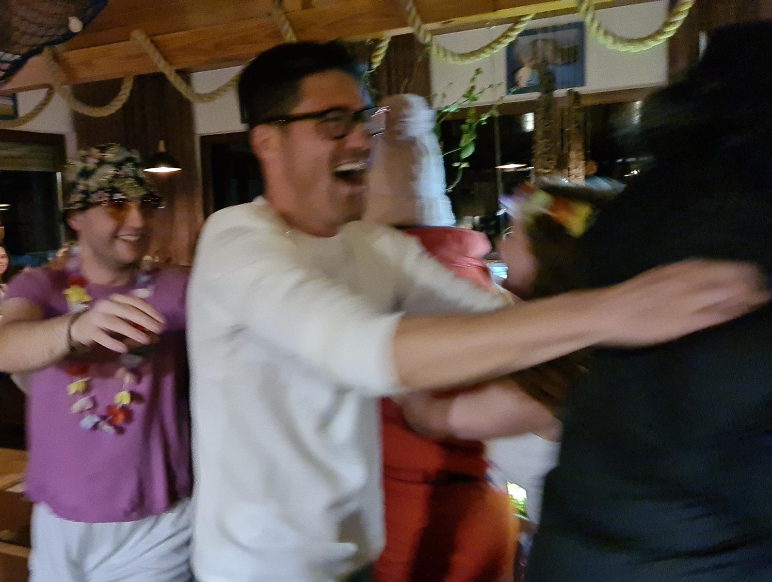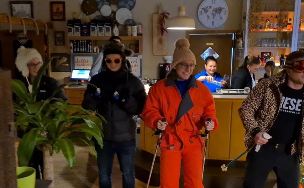 Es folgte der mit großer Vorfreude erwartete Beitrag unserer Damen- und 2. Herrenmannschaft, die mit ihrem gemeinsamen Aufritt den mannschaftsübergreifend großen Zusammenhalt unter Beweis stellten. Die Spielerinnen und Spieler nahmen uns tänzerisch auf eine kurzweilige und lustige „kulturelle und musikalische“ Weltreise mit. „Stewardess“ Anja begrüßte die Mitreisenden im Namen der „Amazonen-Airline“ und bat darum „die Sitze in eine aufrechte Position zu bringen sowie die Sicherheitsgurte anzulegen“. Auf der Reise rund um die Welt machten vier Gipfelstürmer/innen den Auftakt und entführten unter den Klängen von „Skifoan“ ins Skiparadies Österreich. Weiter ging der Flug ins „17. Bundesland“ nach Mallorca. Anja empfahl den Ausstieg nur den „erfahrenen Jägermeister- und Bierkrug-Veteranen“, alle Gäste durften aber am folgenden Ballermann-Auftritt teilhaben, den eine von „Helmut“ angeführte vierköpfige Gruppe vorführte. Besondere und unvergessene Pointe war dabei zum exakt Beginn des Auftritts, der Miteinmarsch von zwei erfahrenen Partyherren. Ob dies so geplant war? ;-) Für lauthalses Lachen sorgte dies auf jeden Fall. Anschließend konnte man die Flugreise über den großen Teich „zur Ausnüchterung“ nutzen. Drei „braungebrannte“ hübsche Damen betraten in Hawaii-Röckchen die Tanzfläche, ehe ihnen ein weiteres Weibchen (oder war es etwa ein Kerl?) hinterhereilte und den gemeinsamen Tanz auch noch mit einem umjubelten Handstand krönte. Unsere Gäste blieben im Flieger und erreichten nun das Reiseziel Amerika, wo sie bei „Viva la Mexico“ vier „Mexikaner/innen“ in Ponchos mit ihrer Kultur vertraut machten. „Weil´s awer dähom immer noch äm allerallerscheenschder isch, hämmä uns gedenkt, jetzt machä mär noch ä Woch in Balkonien!“ Damit rief Anja den Höhepunkt des Auftritts aus und es steuerte mit der Partymusik „Jetzt ist der Teufel los“ minutenlang eine riesige Polonäse durch das Clubhaus-Restaurant. Unseren Spielerinnen und Spielern schlossen sich dabei viele weitere FCO´ler/innen an, darunter auch unser seine Schürze schwingender Wirt Dimi. Schee war´s!