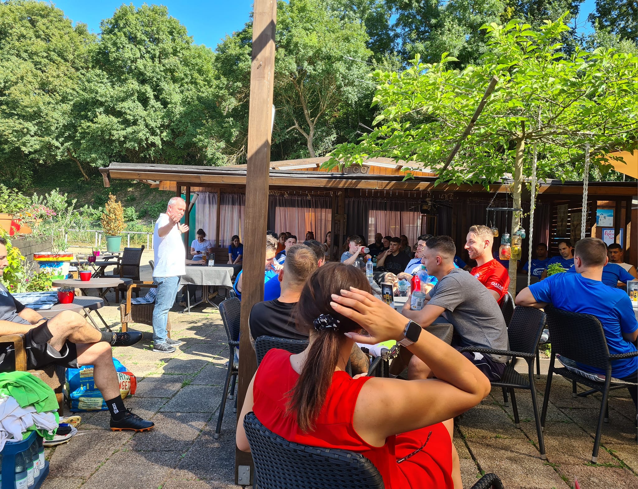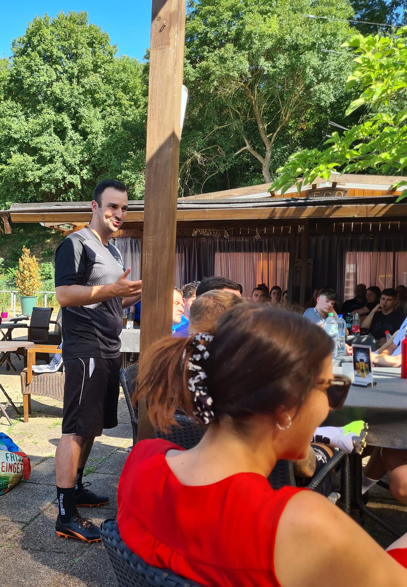Nach den Fotos der 1. Herrenmannschaft (Mannschaftsfoto und Einzelportraits) trafen sich Spielerinnen und Spieler, Trainer, Betreuer, Vorstandsmitglieder sowie auch interessierte Fans im Pavillon zur offiziellen Begrüßung und Vorstellung der drei Mannschaften Herren I (Kreisklasse A), Herren II (Kreisklasse C) und Damen (Landesliga, Staffel 3). Vorstand Sport, Marcus Schäfer begrüßte alle Anwesenden und gab einen ersten Ausblick auf die kommende Spielzeit. Anschließend ergriffen jeweils die Trainer der drei Mannschaften, Alexander Runne (Erste), Markus Wagner (Zweite) und Joachim Reichert (Damen, Trainerduo mit Nicolas Manz) das Wort und wünschten insbesondere allen einen guten und harmonischen Saisonverlauf.
