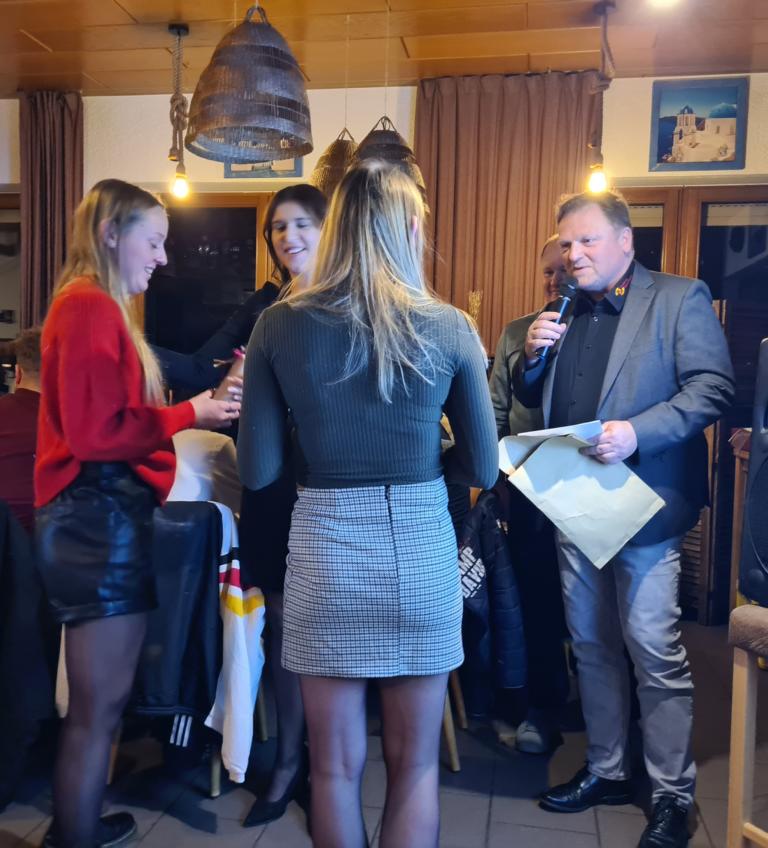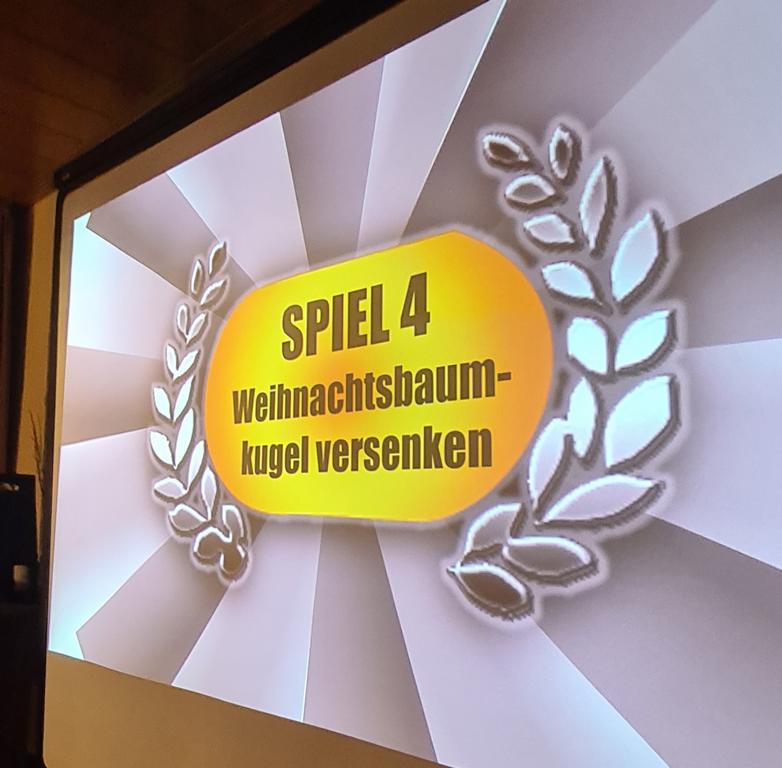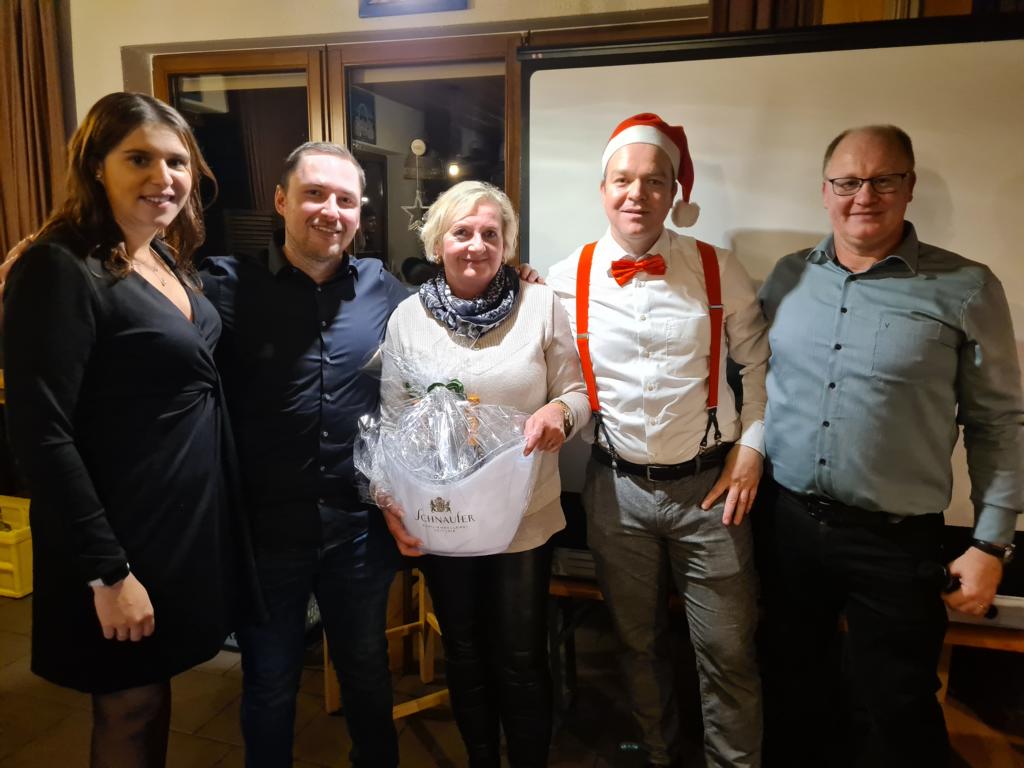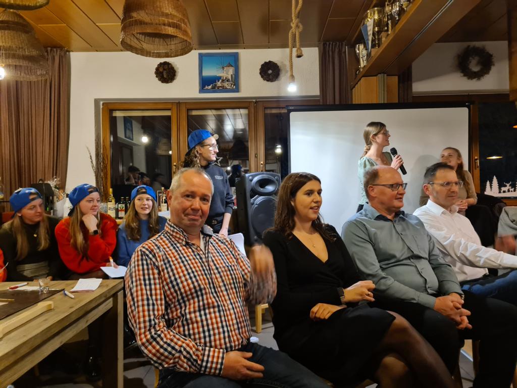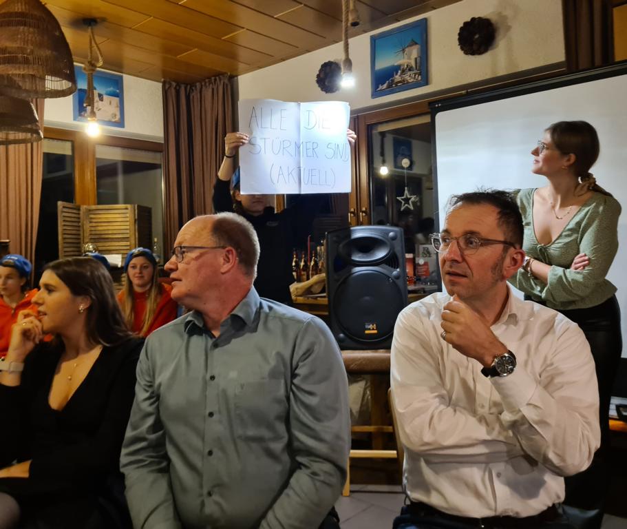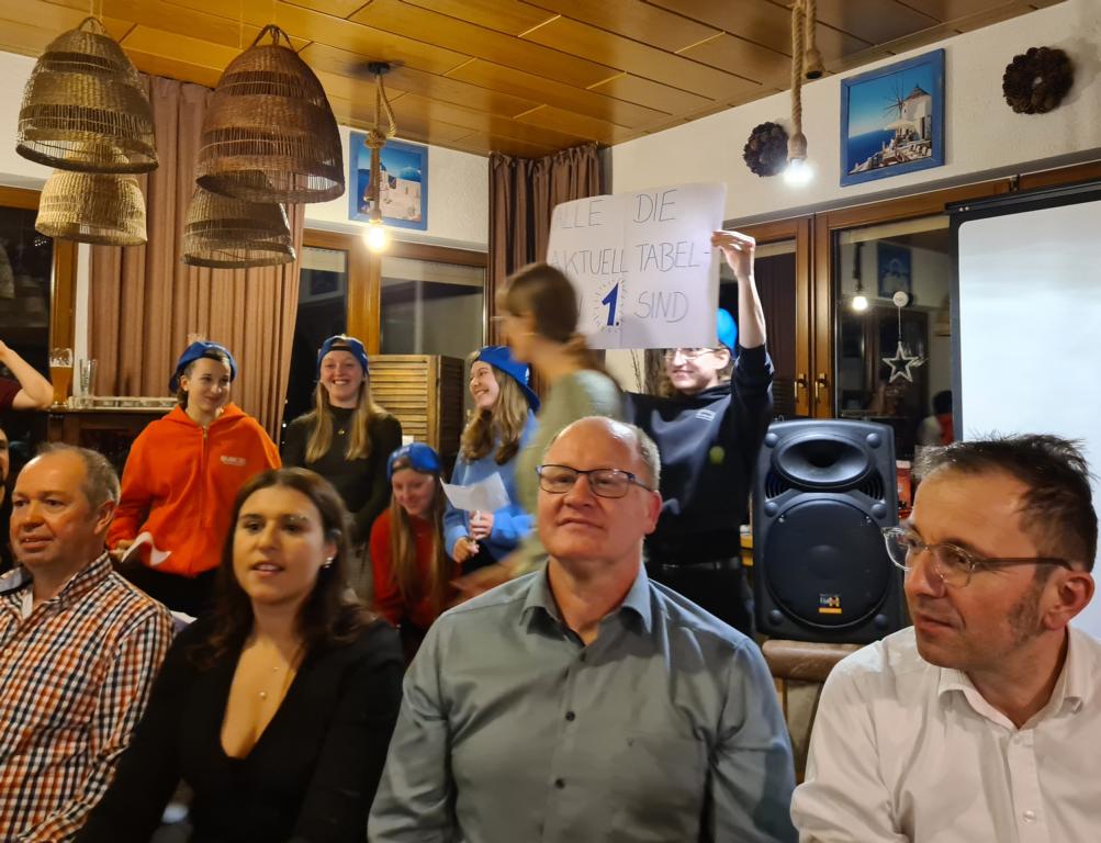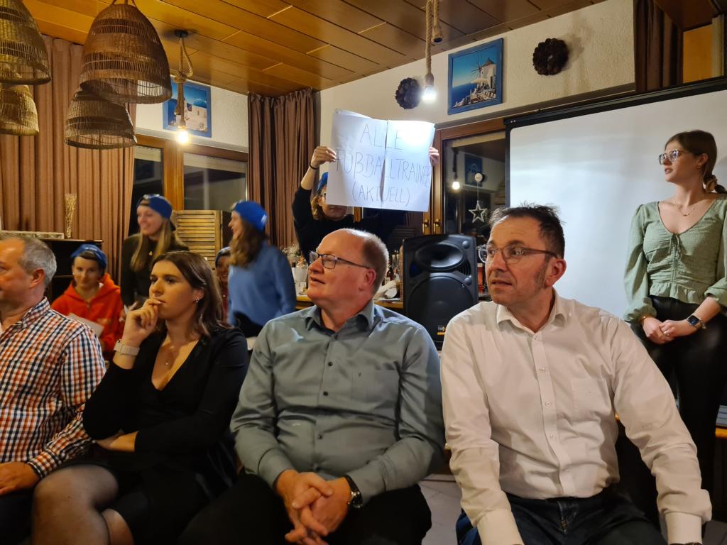 Es folgte der Beitrag unserer Damenmannschaft. Diese besteht seit 2017 und hat sich seither bei jeder Weihnachtsfeier toll eingebracht, so auch dieses Mal. Es war eine tolle Idee, die vierköpfige Vorstandschaft in den Mittelpunkt zu rücken. Viola Spitzer, Marcus Schäfer, Torsten Witte und Andreas Mikisek (Vorstand Jugend) setzten sich mit dem Rücken zu einer Jury (aus Teilen unseres Damenteams), den vortragenden Kapitänin Annalena May und Anja Fielenbach sowie Jacky Hertl, auf vier Stühle mit Blick in die Festrunde. Jacky hielt abwechselnd Plakate mit Fragen wie u. a. „Alle aufstehen, die in Odenheim wohnen“, „Alle, die schon einmal in Odenheims Jugend gekickt haben“, „Alle Trainer“ oder „Alle, die aktuell Tabellenerster sind“ hoch und unsere Vorstände mussten an den sich jeweils vor ihnen von ihren Plätzen erhebenden Personen erkennen, welche Frage dahinterstecken könnte. Bei falschen Antworten kamen unsere Ratefüchse in den Genuss eines leckeren Berentzen. Am Ende kamen da schon einige zusammen. Bejubelter Sieger wurde schließlich Marcus, der ein Präsent erhielt. Auch seine Mitstreiter/innen gingen nicht leer aus und bekamen jeweils eine Dauerkarte für die Spiele unserer Damenelf.