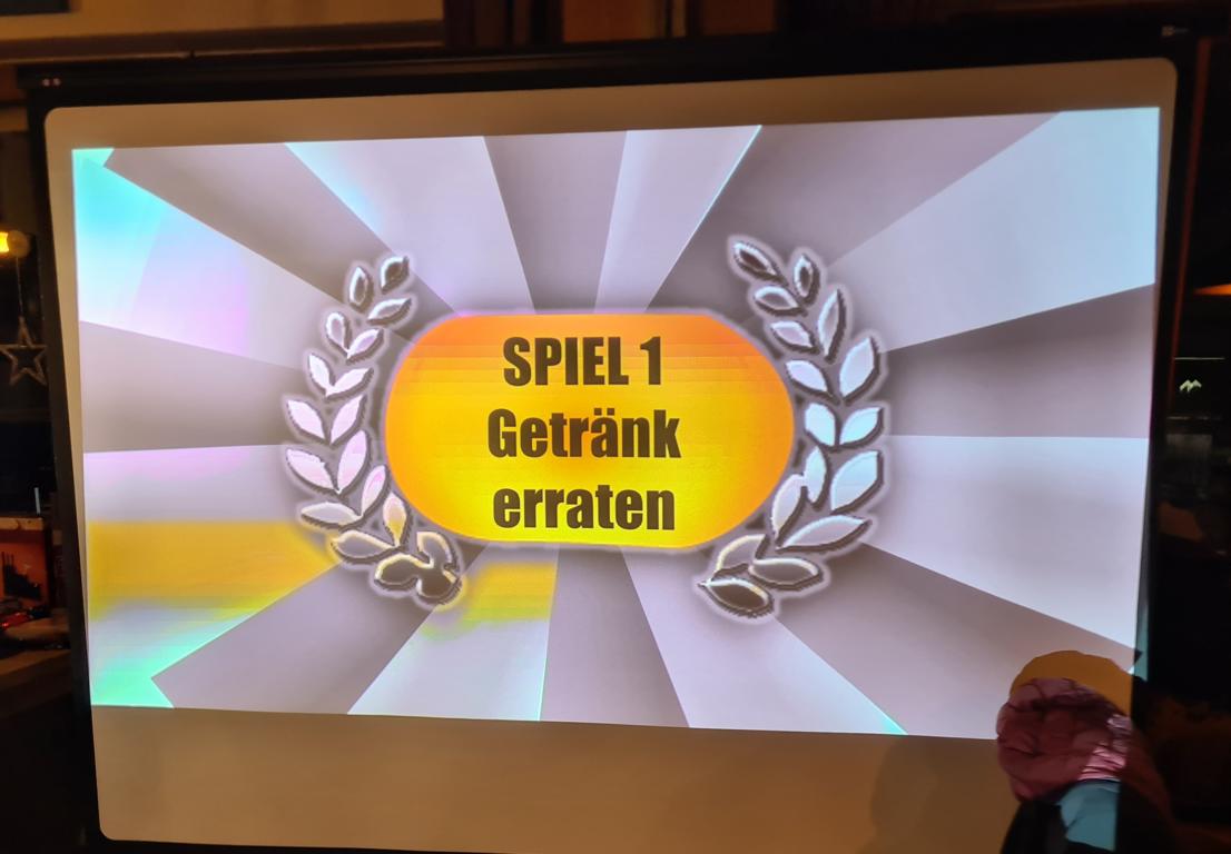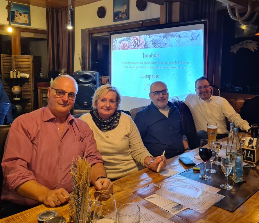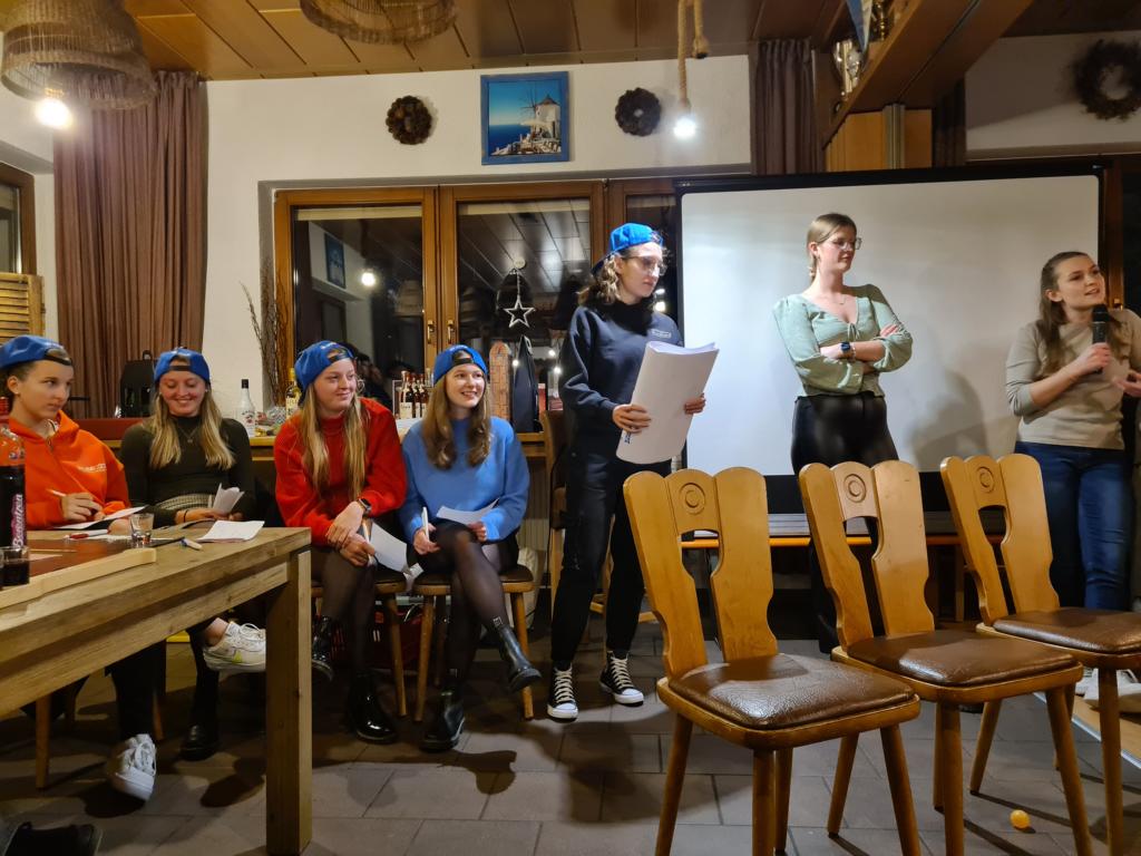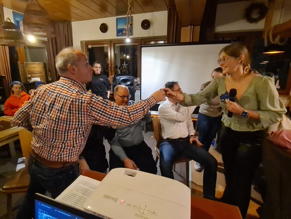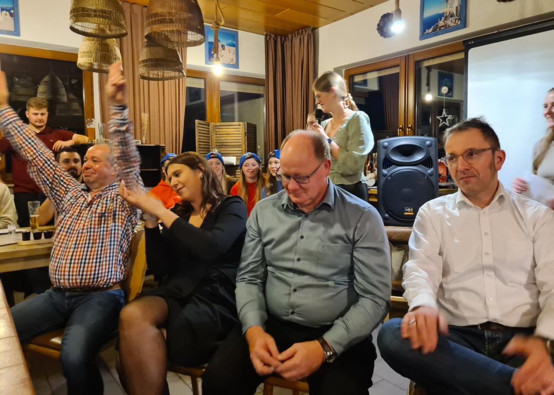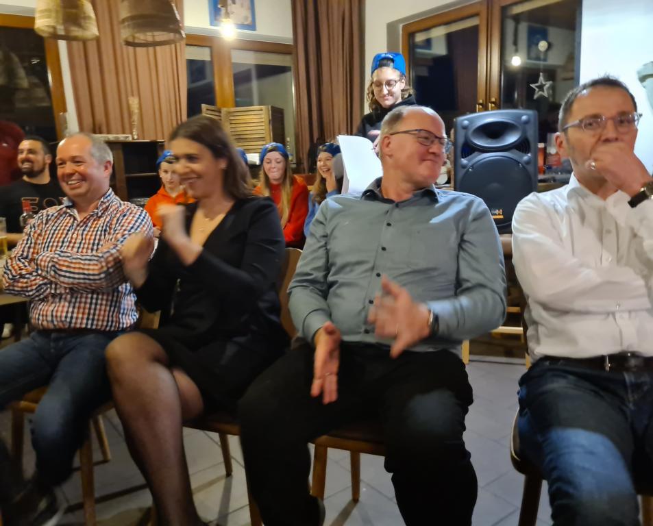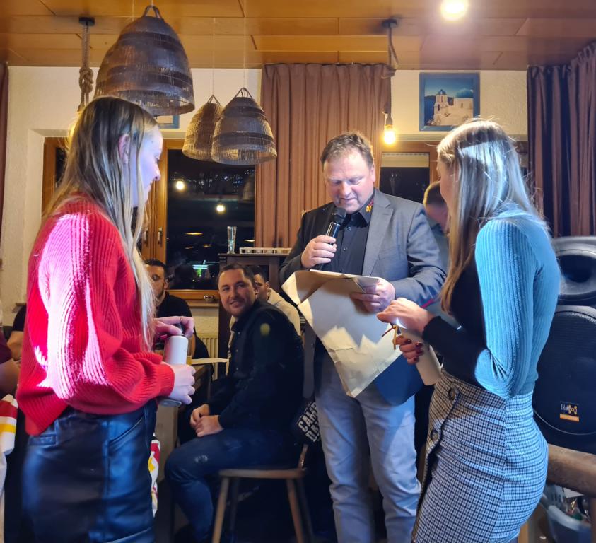Es folgte der Beitrag unserer Damenmannschaft. Diese besteht seit 2017 und hat sich seither bei jeder Weihnachtsfeier toll eingebracht, so auch dieses Mal. Es war eine tolle Idee, die vierköpfige Vorstandschaft in den Mittelpunkt zu rücken. Viola Spitzer, Marcus Schäfer, Torsten Witte und Andreas Mikisek (Vorstand Jugend) setzten sich mit dem Rücken zu einer Jury (aus Teilen unseres Damenteams), den vortragenden Kapitänin Annalena May und Anja Fielenbach sowie Jacky Hertl, auf vier Stühle mit Blick in die Festrunde. Jacky hielt abwechselnd Plakate mit Fragen wie u. a. „Alle aufstehen, die in Odenheim wohnen“, „Alle, die schon einmal in Odenheims Jugend gekickt haben“, „Alle Trainer“ oder „Alle, die aktuell Tabellenerster sind“ hoch und unsere Vorstände mussten an den sich jeweils vor ihnen von ihren Plätzen erhebenden Personen erkennen, welche Frage dahinterstecken könnte. Bei falschen Antworten kamen unsere Ratefüchse in den Genuss eines leckeren Berentzen. Am Ende kamen da schon einige zusammen. Bejubelter Sieger wurde schließlich Marcus, der ein Präsent erhielt. Auch seine Mitstreiter/innen gingen nicht leer aus und bekamen jeweils eine Dauerkarte für die Spiele unserer Damenelf.
