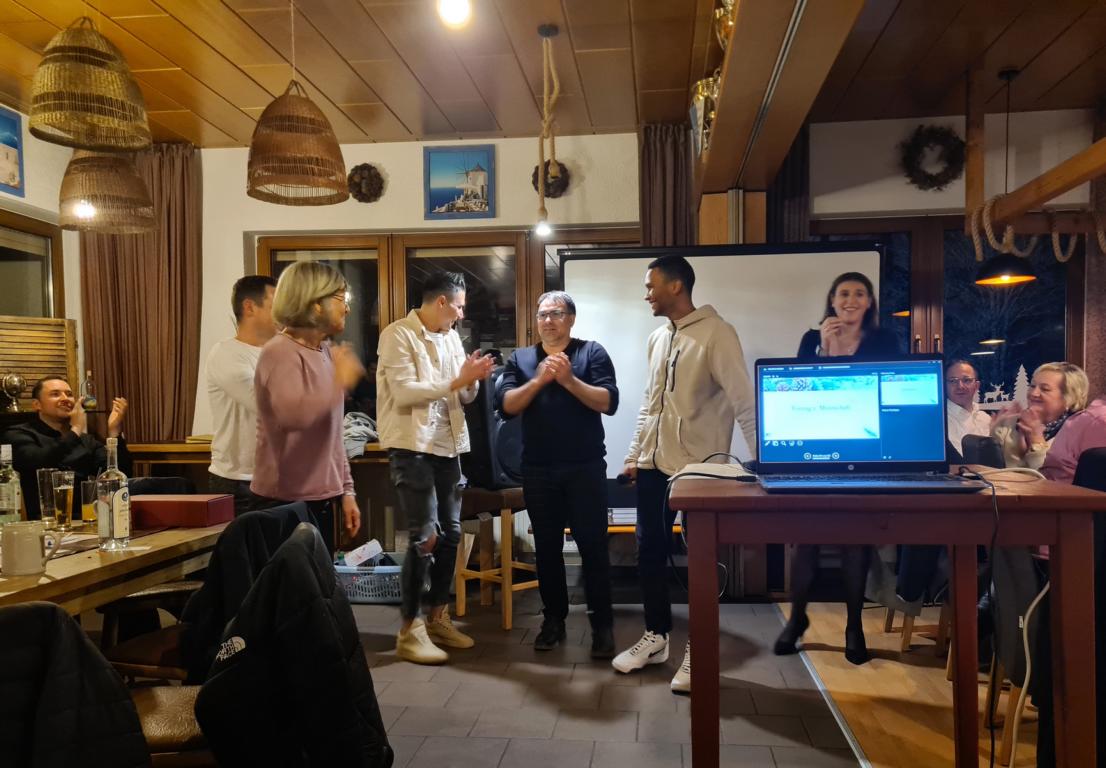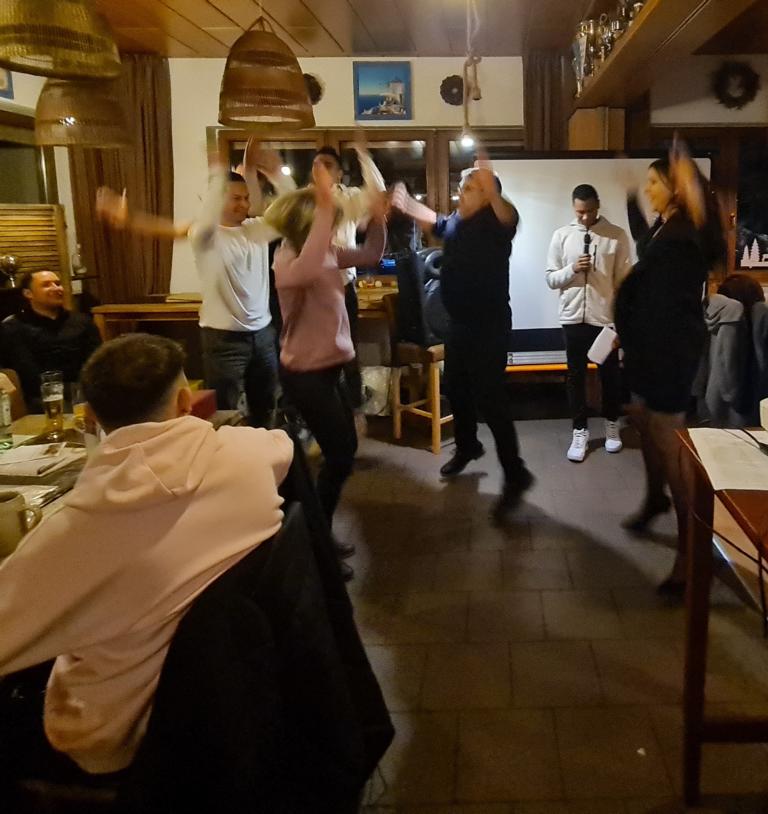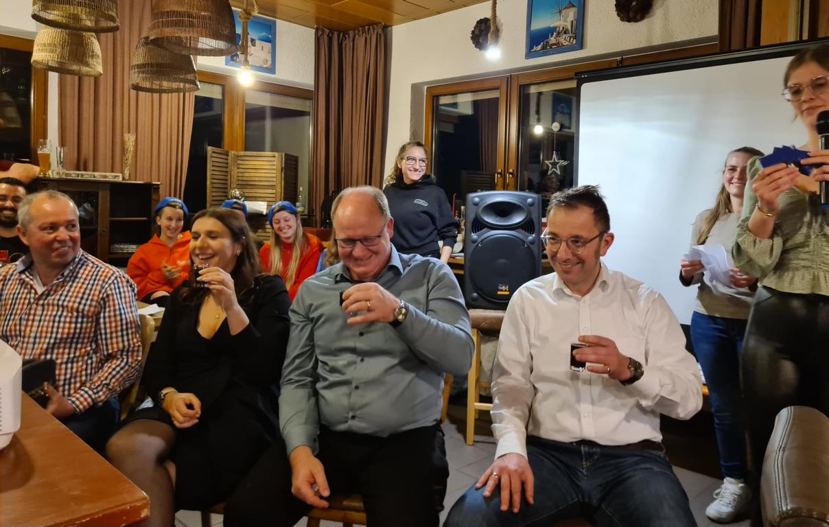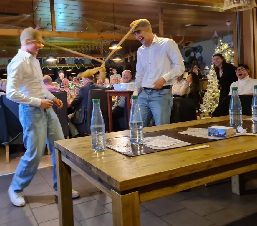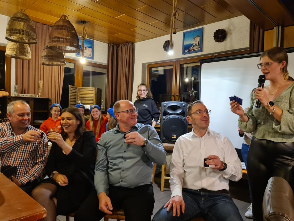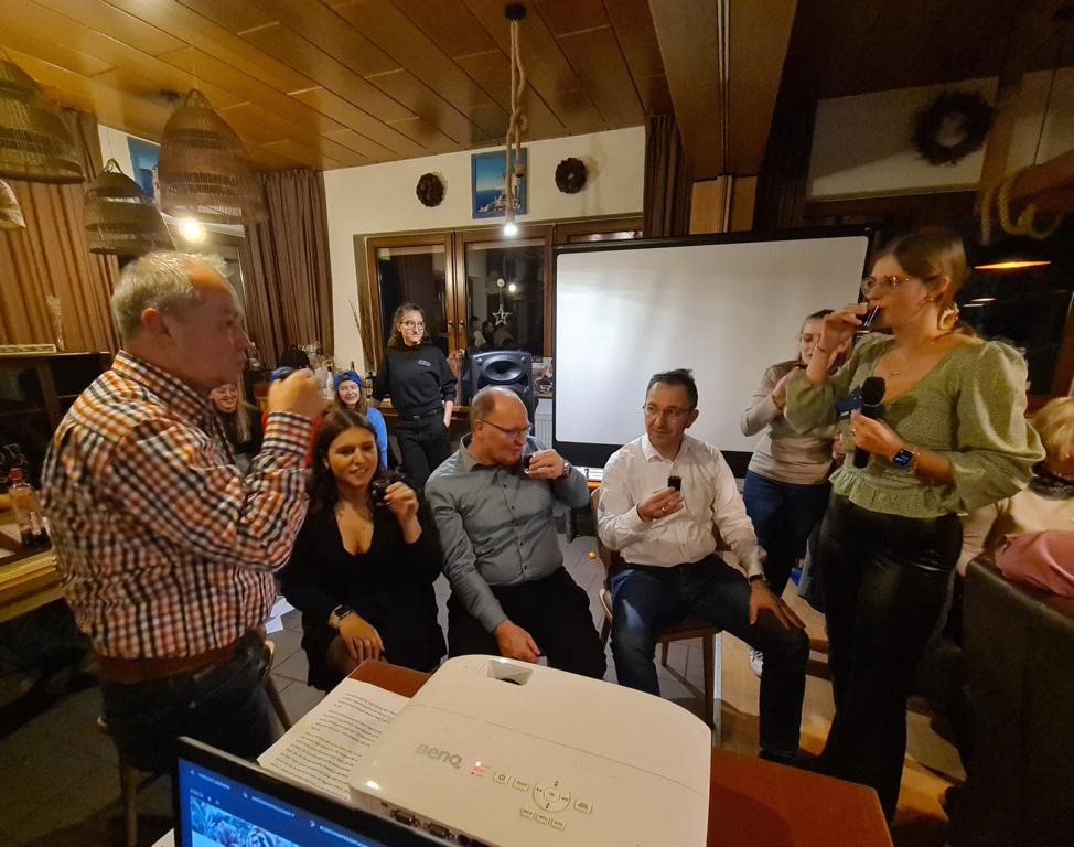 Es folgte der Beitrag unserer Damenmannschaft. Diese besteht seit 2017 und hat sich seither bei jeder Weihnachtsfeier toll eingebracht, so auch dieses Mal. Es war eine tolle Idee, die vierköpfige Vorstandschaft in den Mittelpunkt zu rücken. Viola Spitzer, Marcus Schäfer, Torsten Witte und Andreas Mikisek (Vorstand Jugend) setzten sich mit dem Rücken zu einer Jury (aus Teilen unseres Damenteams), den vortragenden Kapitänin Annalena May und Anja Fielenbach sowie Jacky Hertl, auf vier Stühle mit Blick in die Festrunde. Jacky hielt abwechselnd Plakate mit Fragen wie u. a. „Alle aufstehen, die in Odenheim wohnen“, „Alle, die schon einmal in Odenheims Jugend gekickt haben“, „Alle Trainer“ oder „Alle, die aktuell Tabellenerster sind“ hoch und unsere Vorstände mussten an den sich jeweils vor ihnen von ihren Plätzen erhebenden Personen erkennen, welche Frage dahinterstecken könnte. Bei falschen Antworten kamen unsere Ratefüchse in den Genuss eines leckeren Berentzen. Am Ende kamen da schon einige zusammen. Bejubelter Sieger wurde schließlich Marcus, der ein Präsent erhielt. Auch seine Mitstreiter/innen gingen nicht leer aus und bekamen jeweils eine Dauerkarte für die Spiele unserer Damenelf.