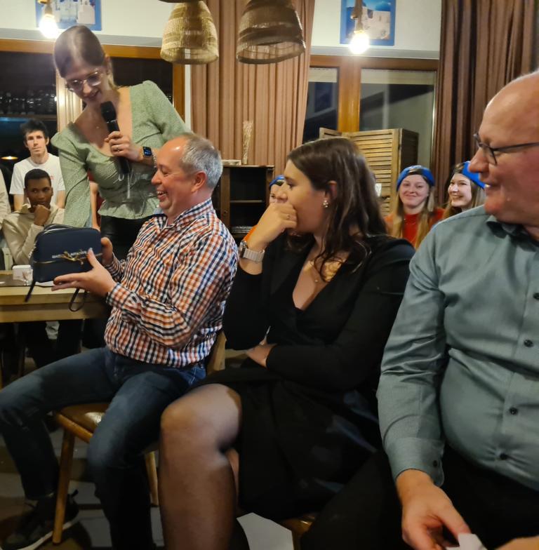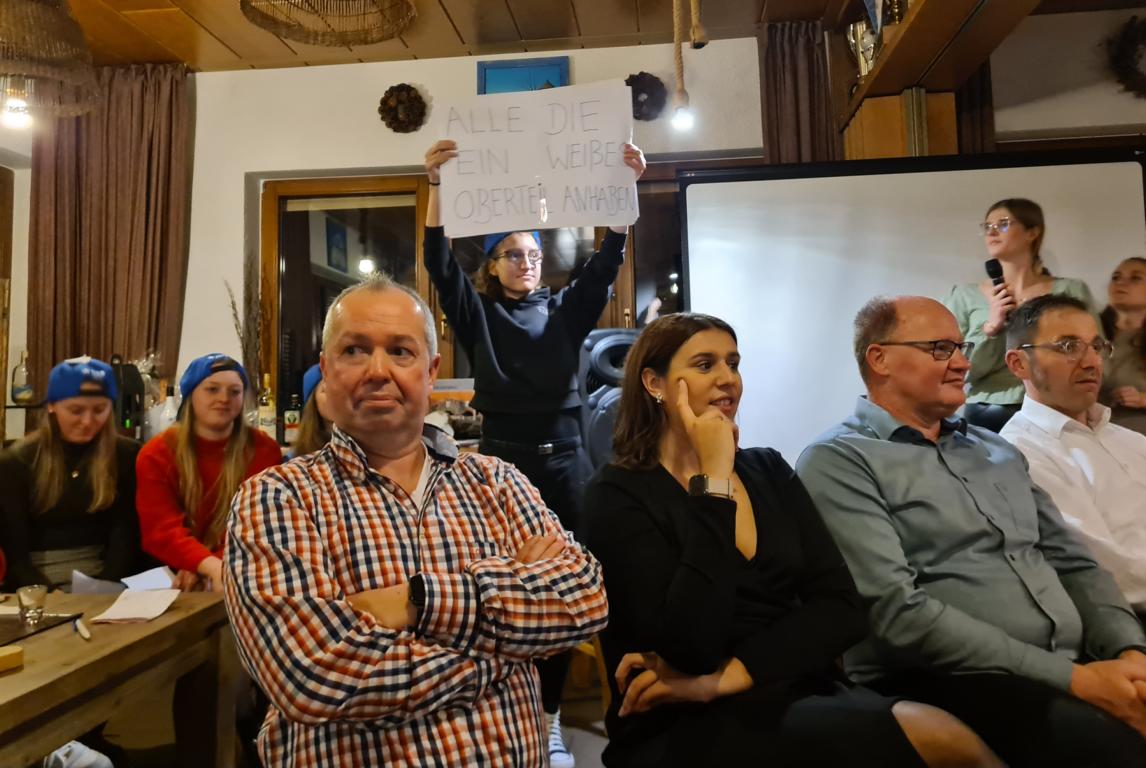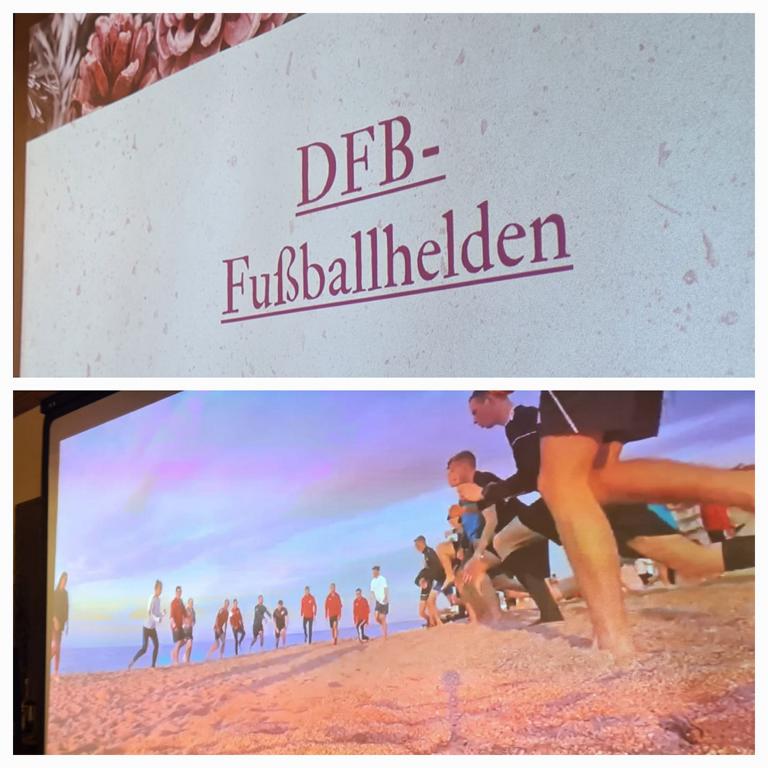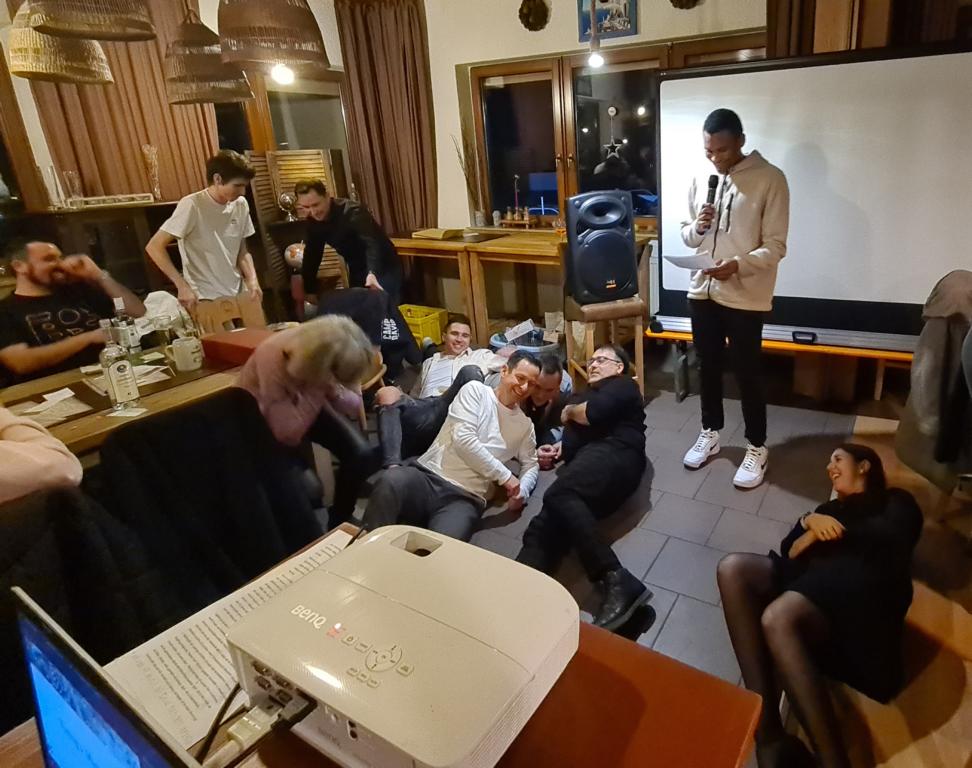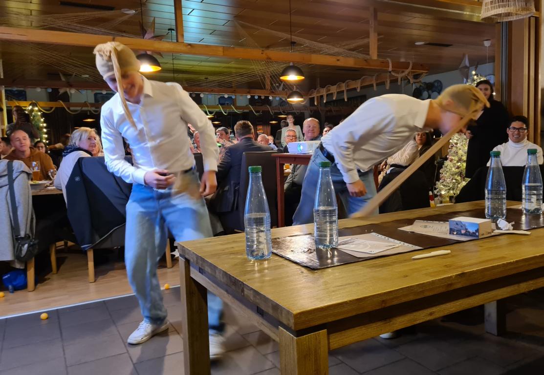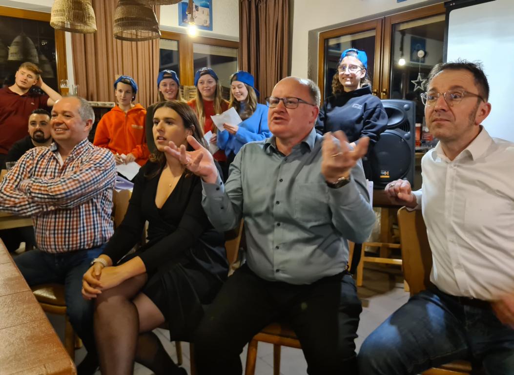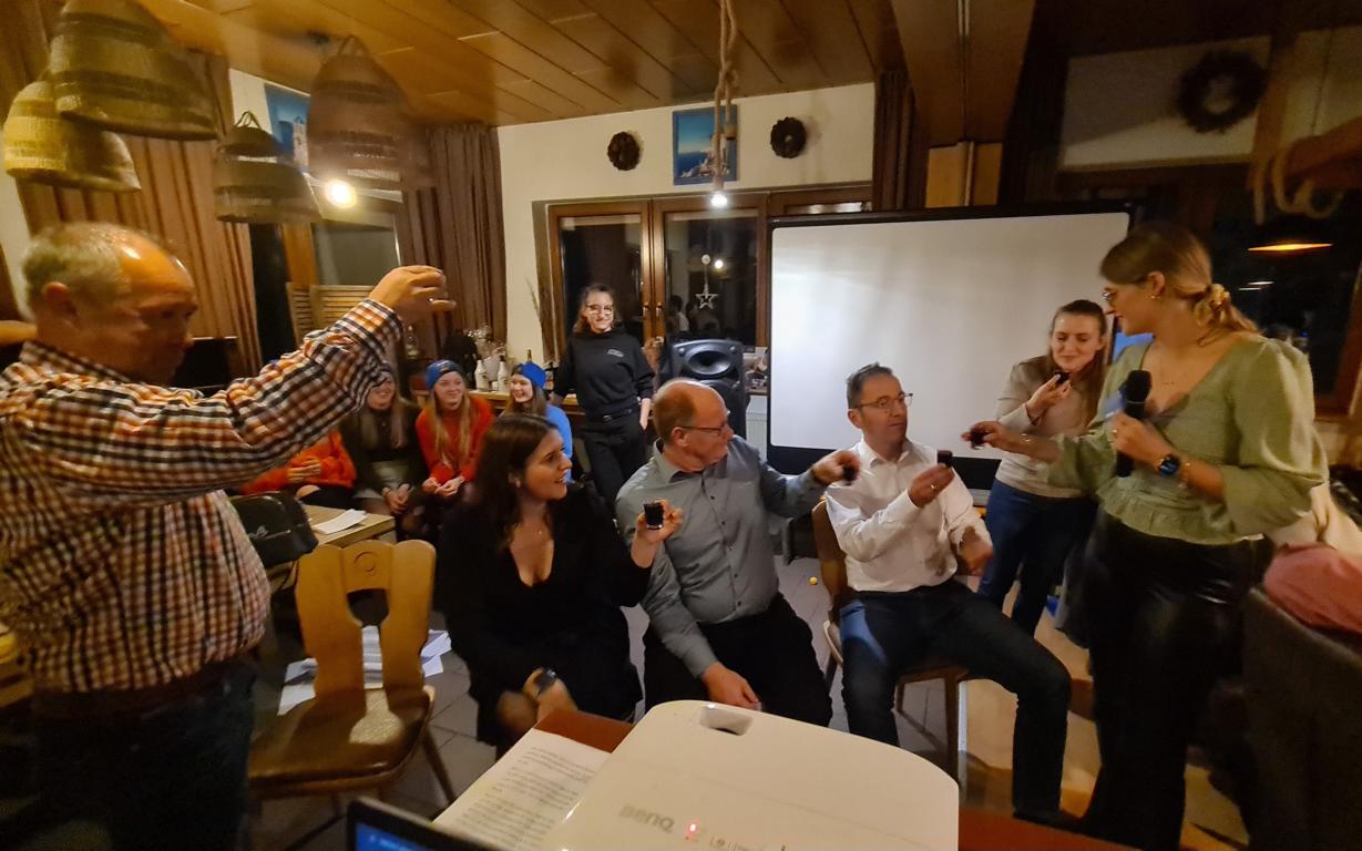Es folgte der Beitrag unserer Damenmannschaft. Diese besteht seit 2017 und hat sich seither bei jeder Weihnachtsfeier toll eingebracht, so auch dieses Mal. Es war eine tolle Idee, die vierköpfige Vorstandschaft in den Mittelpunkt zu rücken. Viola Spitzer, Marcus Schäfer, Torsten Witte und Andreas Mikisek (Vorstand Jugend) setzten sich mit dem Rücken zu einer Jury (aus Teilen unseres Damenteams), den vortragenden Kapitänin Annalena May und Anja Fielenbach sowie Jacky Hertl, auf vier Stühle mit Blick in die Festrunde. Jacky hielt abwechselnd Plakate mit Fragen wie u. a. „Alle aufstehen, die in Odenheim wohnen“, „Alle, die schon einmal in Odenheims Jugend gekickt haben“, „Alle Trainer“ oder „Alle, die aktuell Tabellenerster sind“ hoch und unsere Vorstände mussten an den sich jeweils vor ihnen von ihren Plätzen erhebenden Personen erkennen, welche Frage dahinterstecken könnte. Bei falschen Antworten kamen unsere Ratefüchse in den Genuss eines leckeren Berentzen. Am Ende kamen da schon einige zusammen. Bejubelter Sieger wurde schließlich Marcus, der ein Präsent erhielt. Auch seine Mitstreiter/innen gingen nicht leer aus und bekamen jeweils eine Dauerkarte für die Spiele unserer Damenelf.