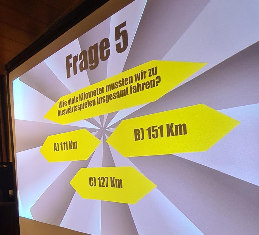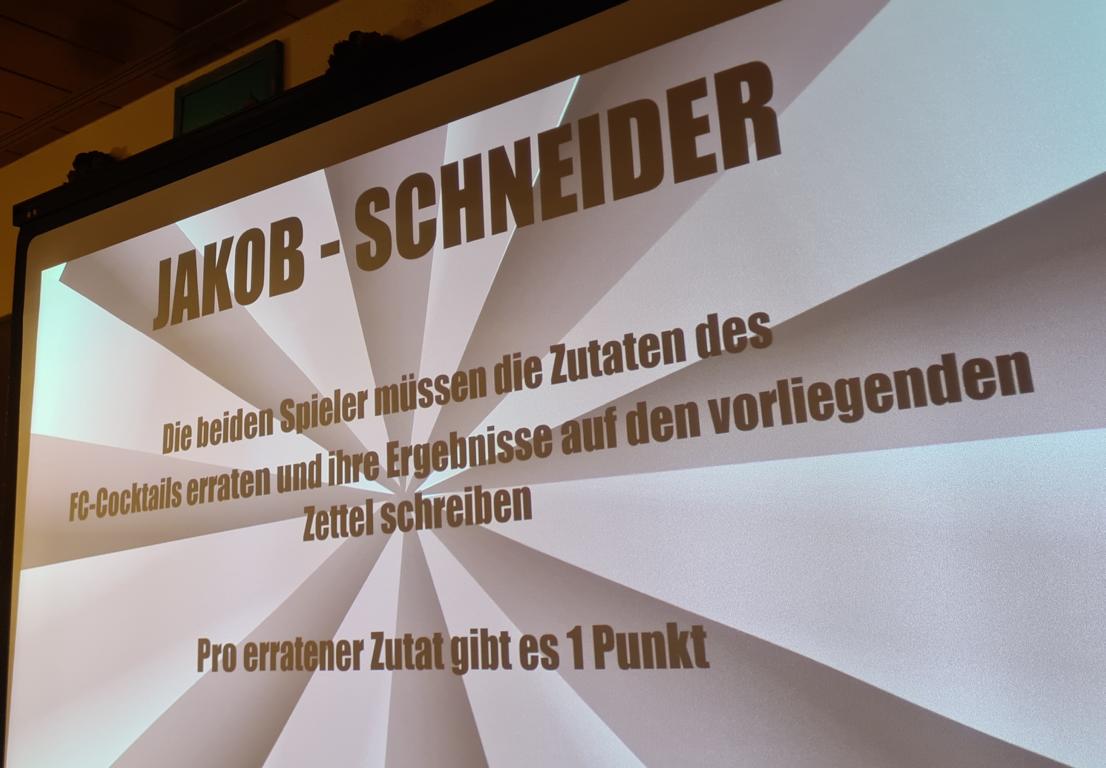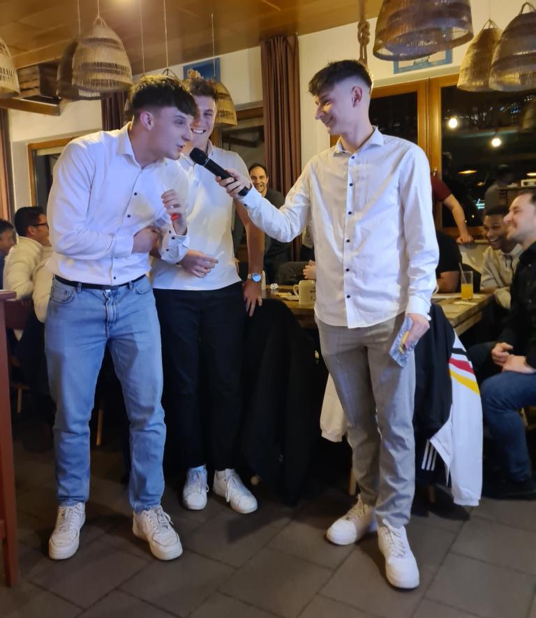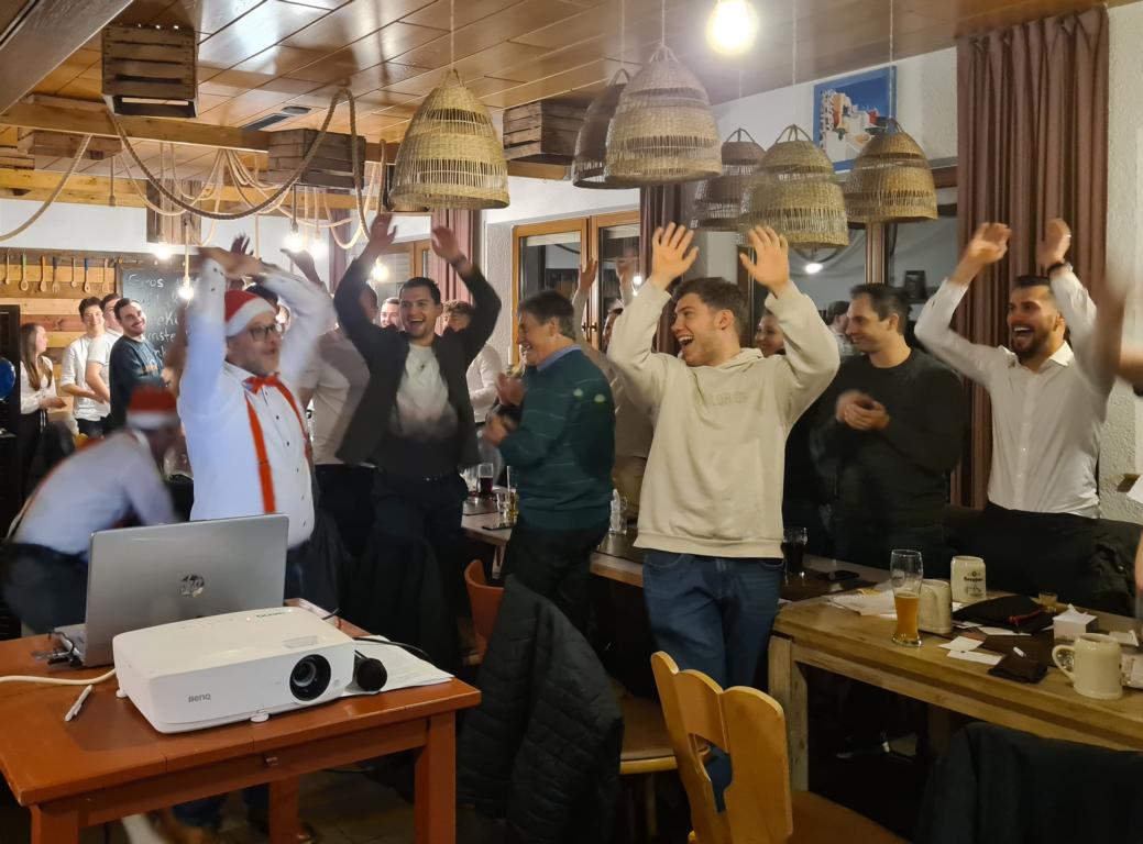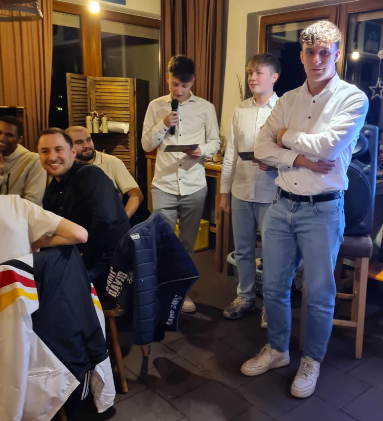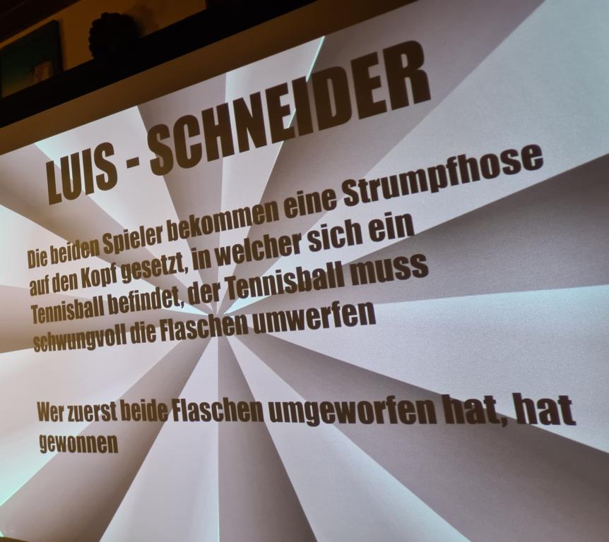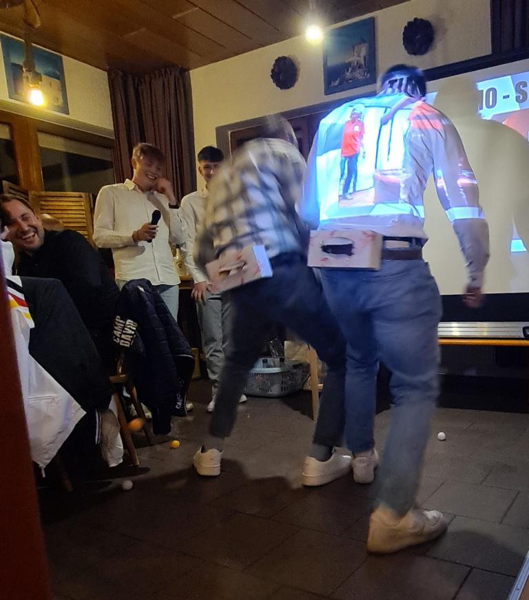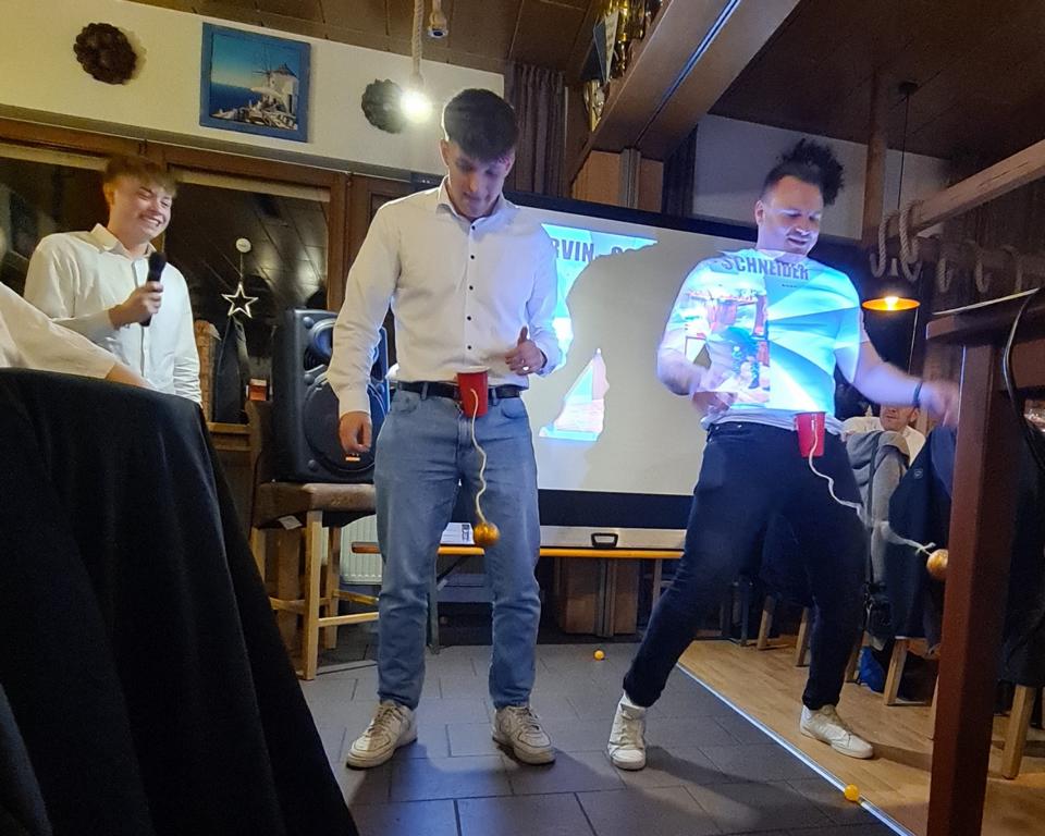 Als 2. Programmpunkt folgte bereits der Vortrag unserer 1. Herrenmannschaft. Gerade unsere Nachwuchskräfte im Team hatten sich mit der Challenge „Schlag den Schneider“ etwas ganz Besonderes einfallen lassen und viel Vorbereitungszeit hineingesteckt. Was war und ist im TV schon das Format „Schlag den Raab“ oder „Schlag den Star“, wenn sich die Herausforderer gegen einen Kevin Schneider beweisen müssen! Dessen Mannschaftskameraden Lenny Knapp und Tizian Last moderierten den Wettbewerb und stellten ihren Mannschaftskameraden als „unser Wunderkind“ vor, „das im härtesten Dschungel der Welt, dem Ulrichsbruch, aufgewachsen ist“. In 7 Spielen wie „Getränk erraten“ (Mix-Cocktail aus Kaltem Pfefferminztee, Multivitaminsaft, Gurkenwasser und Tabasco), „Junk in the Trunk“, „FC-Quiz“, „Weihnachtsbaumkugel versenken“, „Rechenquiz“, „Liedersingen“ und „Kopfbowling“ forderten Jakob Schorr, Timo Teufel, Samuele Di Lisa, der Sportliche Leiter Marvin Keller, Noah Zorn, Nikolas Wagner und Luis Benz den Star Schneider heraus. Wieder einmal sollte sich bewahrheiten: Wenn der Kevin das 1:0 macht, dann gewinnt er auch. So auch diesmal, indem er 5 der 7 Wettbewerbe für sich entschied. Einer der Höhepunkte war sicherlich Kevins lieblicher Gesang bei Spiel #6. Ein echt toller Vortrag unserer „Ersten“, der nicht nur den Zuschauer/innen, sondern vor allem auch den Protagonisten selbst, riesigen Spaß bereitet hat.