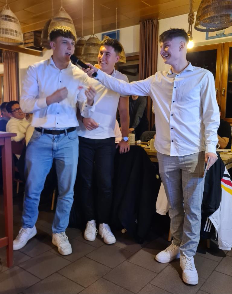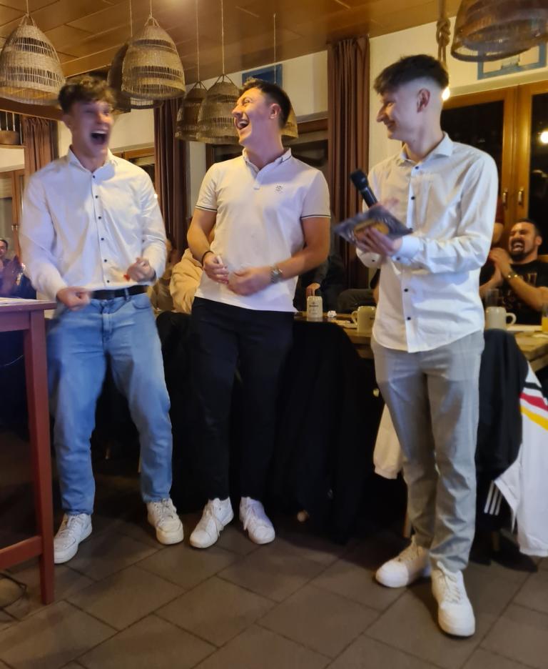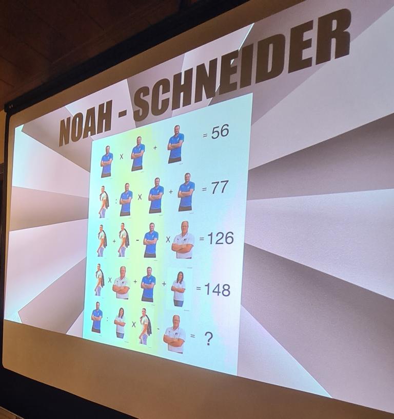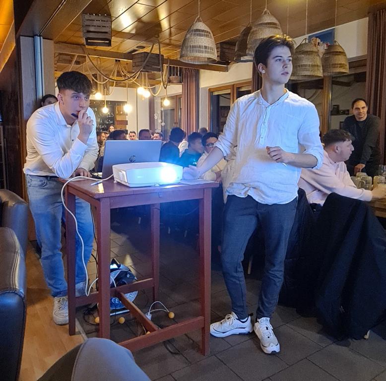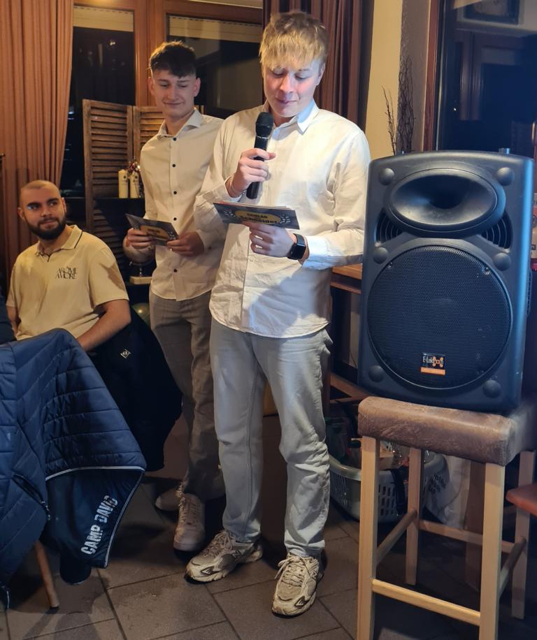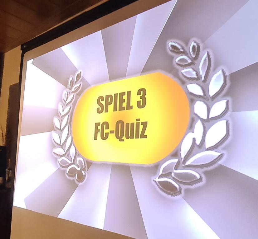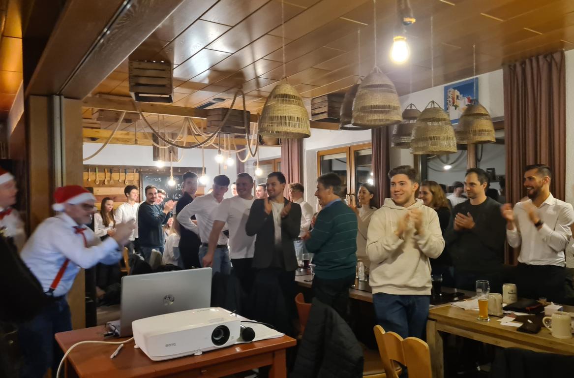 Als 2. Programmpunkt folgte bereits der Vortrag unserer 1. Herrenmannschaft. Gerade unsere Nachwuchskräfte im Team hatten sich mit der Challenge „Schlag den Schneider“ etwas ganz Besonderes einfallen lassen und viel Vorbereitungszeit hineingesteckt. Was war und ist im TV schon das Format „Schlag den Raab“ oder „Schlag den Star“, wenn sich die Herausforderer gegen einen Kevin Schneider beweisen müssen! Dessen Mannschaftskameraden Lenny Knapp und Tizian Last moderierten den Wettbewerb und stellten ihren Mannschaftskameraden als „unser Wunderkind“ vor, „das im härtesten Dschungel der Welt, dem Ulrichsbruch, aufgewachsen ist“. In 7 Spielen wie „Getränk erraten“ (Mix-Cocktail aus Kaltem Pfefferminztee, Multivitaminsaft, Gurkenwasser und Tabasco), „Junk in the Trunk“, „FC-Quiz“, „Weihnachtsbaumkugel versenken“, „Rechenquiz“, „Liedersingen“ und „Kopfbowling“ forderten Jakob Schorr, Timo Teufel, Samuele Di Lisa, der Sportliche Leiter Marvin Keller, Noah Zorn, Nikolas Wagner und Luis Benz den Star Schneider heraus. Wieder einmal sollte sich bewahrheiten: Wenn der Kevin das 1:0 macht, dann gewinnt er auch. So auch diesmal, indem er 5 der 7 Wettbewerbe für sich entschied. Einer der Höhepunkte war sicherlich Kevins lieblicher Gesang bei Spiel #6. Ein echt toller Vortrag unserer „Ersten“, der nicht nur den Zuschauer/innen, sondern vor allem auch den Protagonisten selbst, riesigen Spaß bereitet hat.