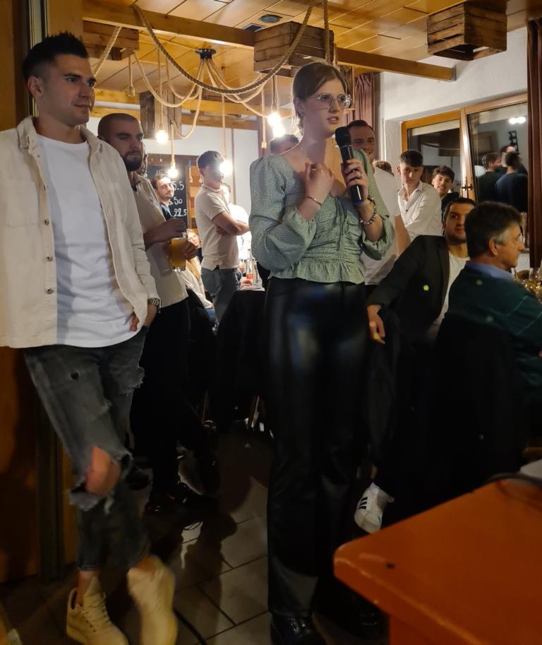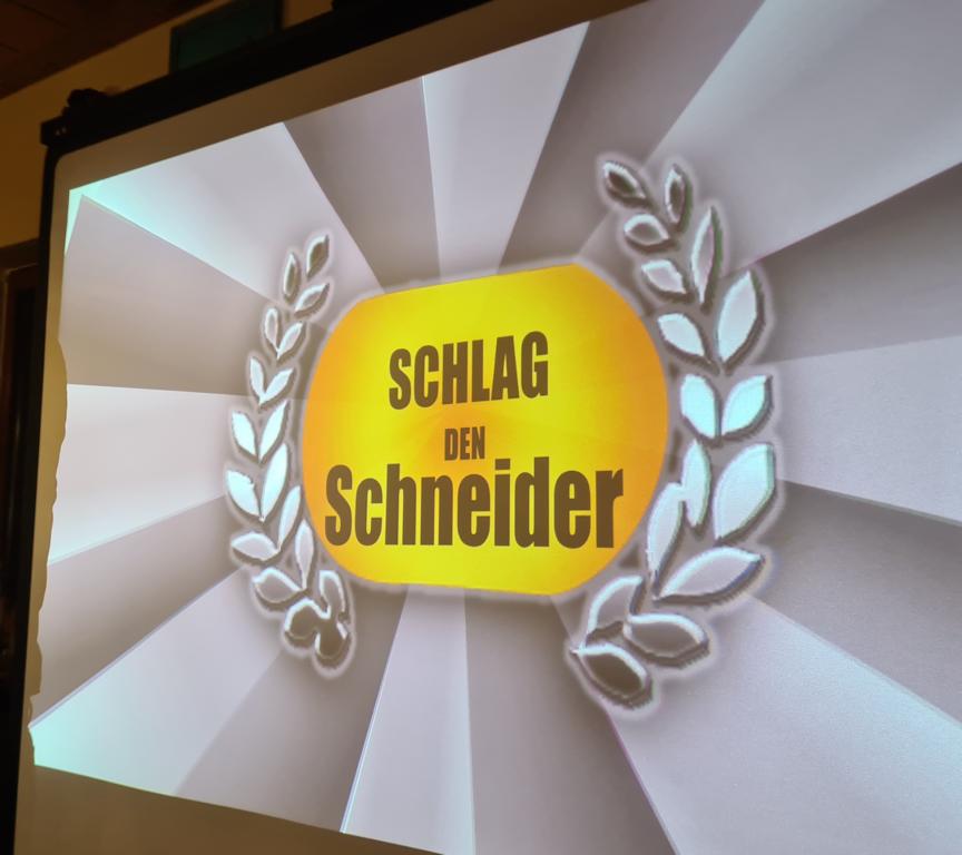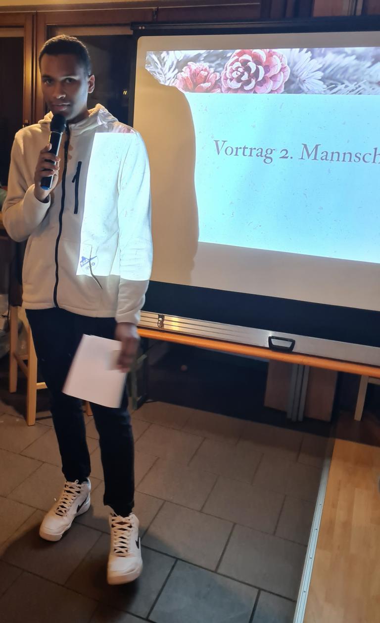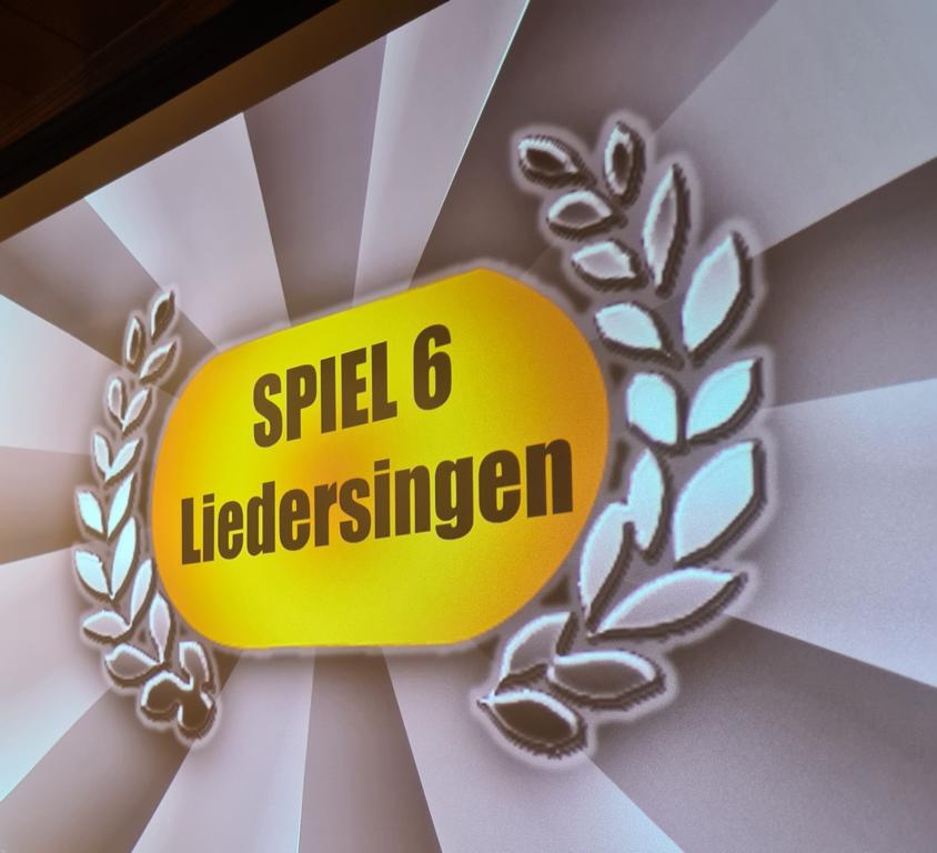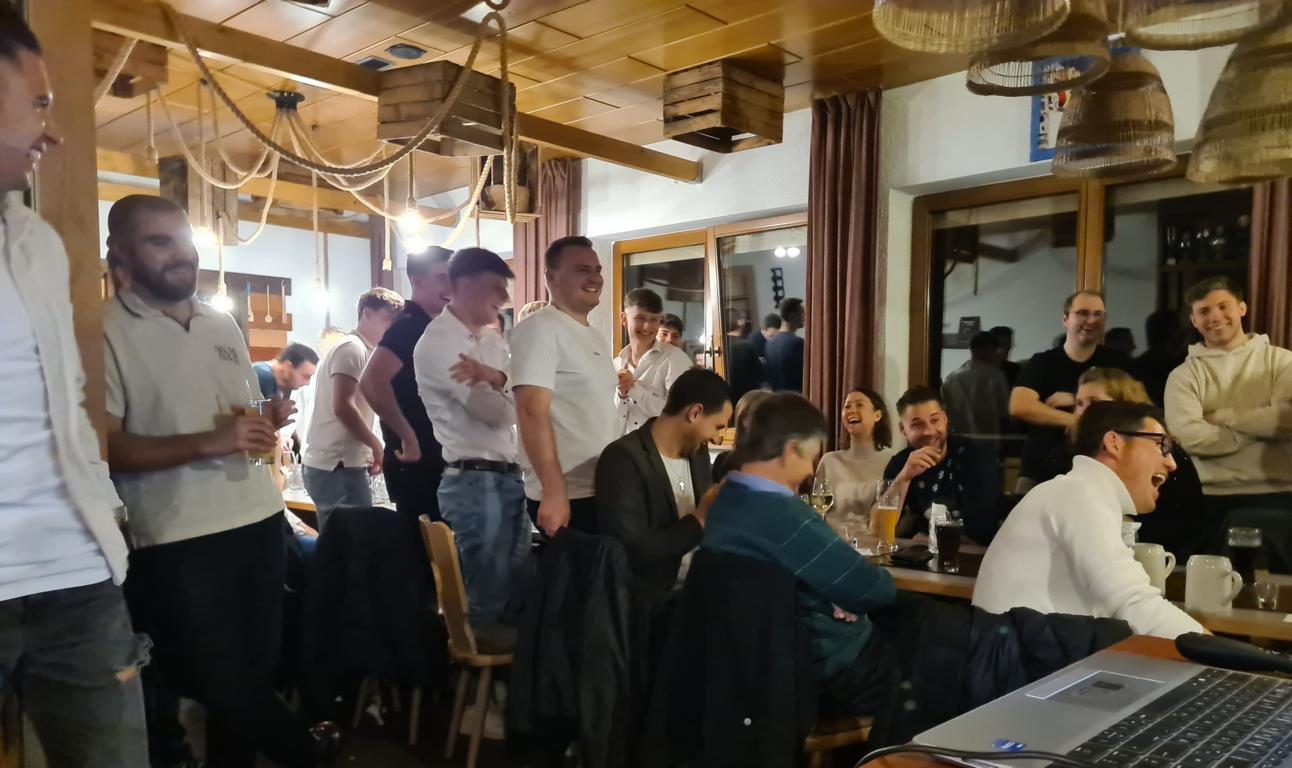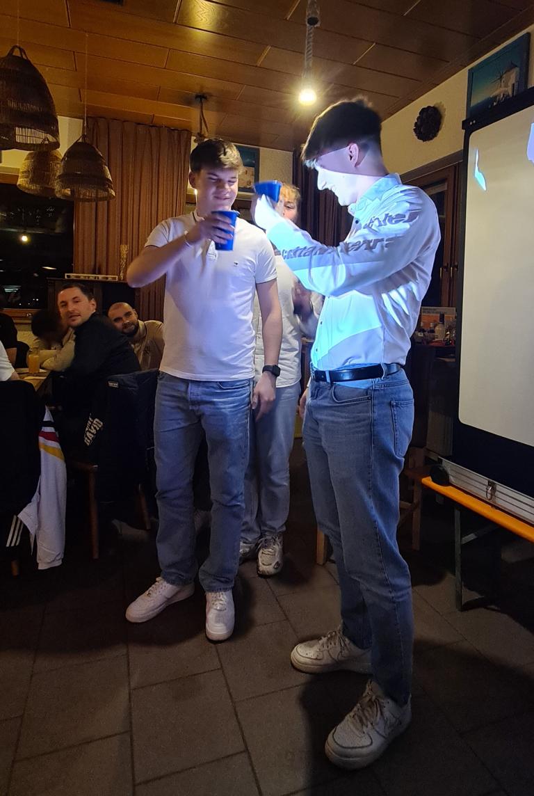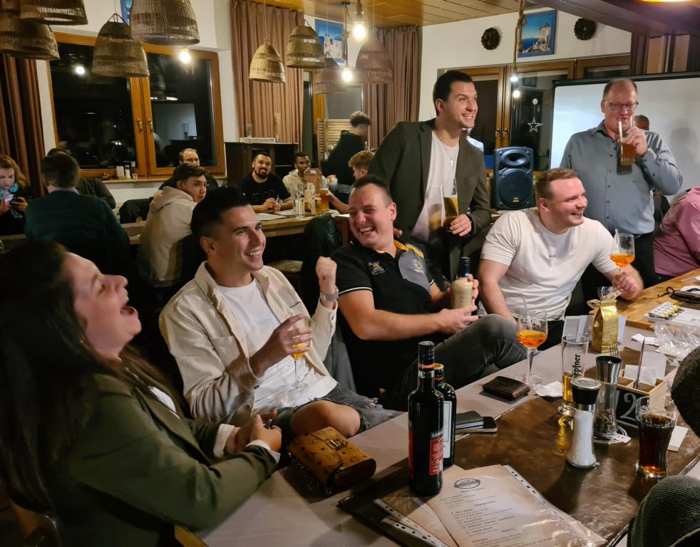 Als 2. Programmpunkt folgte bereits der Vortrag unserer 1. Herrenmannschaft. Gerade unsere Nachwuchskräfte im Team hatten sich mit der Challenge „Schlag den Schneider“ etwas ganz Besonderes einfallen lassen und viel Vorbereitungszeit hineingesteckt. Was war und ist im TV schon das Format „Schlag den Raab“ oder „Schlag den Star“, wenn sich die Herausforderer gegen einen Kevin Schneider beweisen müssen! Dessen Mannschaftskameraden Lenny Knapp und Tizian Last moderierten den Wettbewerb und stellten ihren Mannschaftskameraden als „unser Wunderkind“ vor, „das im härtesten Dschungel der Welt, dem Ulrichsbruch, aufgewachsen ist“. In 7 Spielen wie „Getränk erraten“ (Mix-Cocktail aus Kaltem Pfefferminztee, Multivitaminsaft, Gurkenwasser und Tabasco), „Junk in the Trunk“, „FC-Quiz“, „Weihnachtsbaumkugel versenken“, „Rechenquiz“, „Liedersingen“ und „Kopfbowling“ forderten Jakob Schorr, Timo Teufel, Samuele Di Lisa, der Sportliche Leiter Marvin Keller, Noah Zorn, Nikolas Wagner und Luis Benz den Star Schneider heraus. Wieder einmal sollte sich bewahrheiten: Wenn der Kevin das 1:0 macht, dann gewinnt er auch. So auch diesmal, indem er 5 der 7 Wettbewerbe für sich entschied. Einer der Höhepunkte war sicherlich Kevins lieblicher Gesang bei Spiel #6. Ein echt toller Vortrag unserer „Ersten“, der nicht nur den Zuschauer/innen, sondern vor allem auch den Protagonisten selbst, riesigen Spaß bereitet hat.