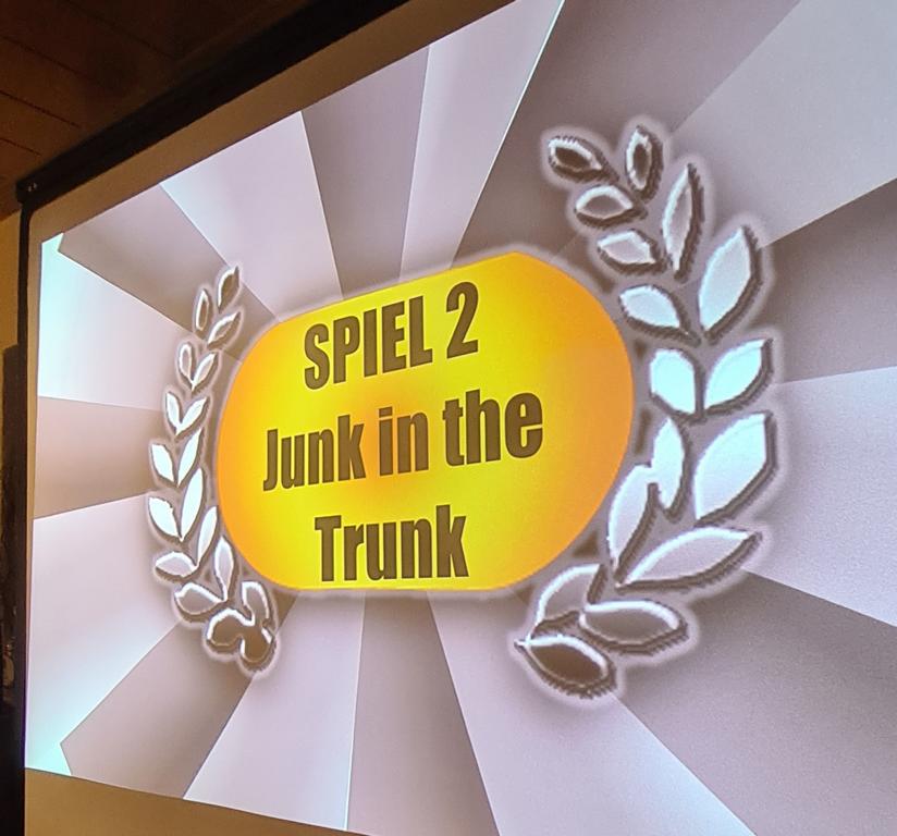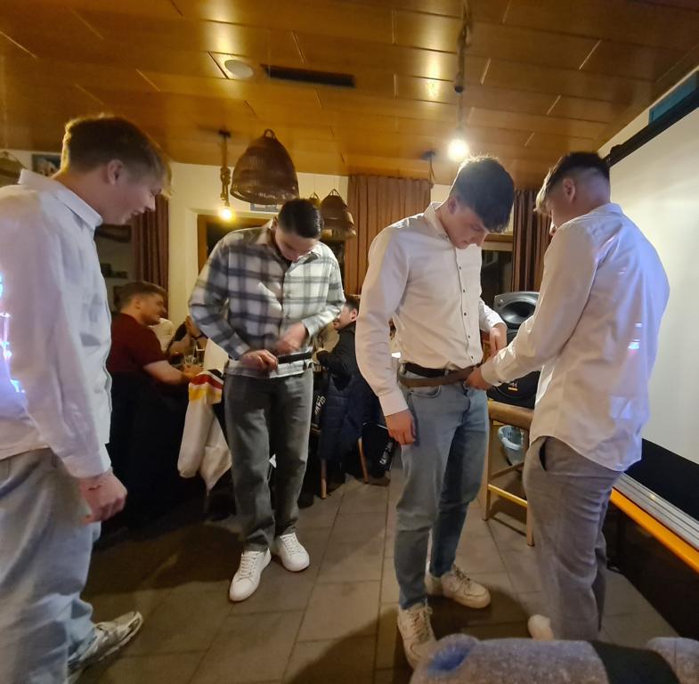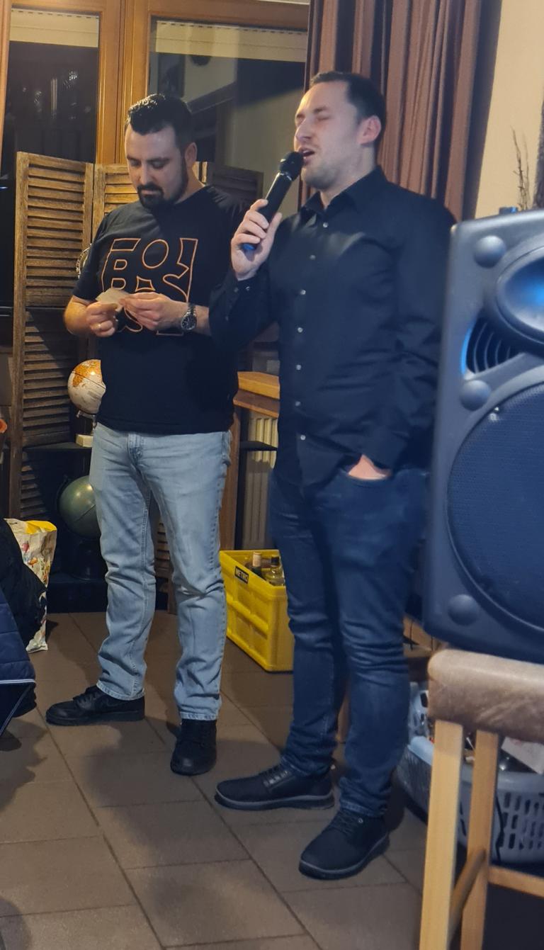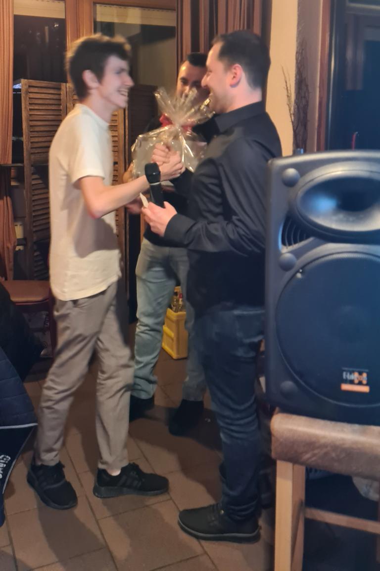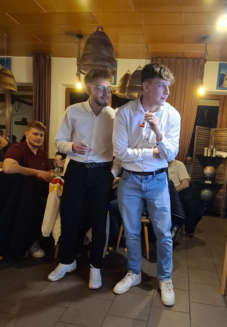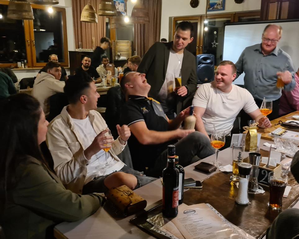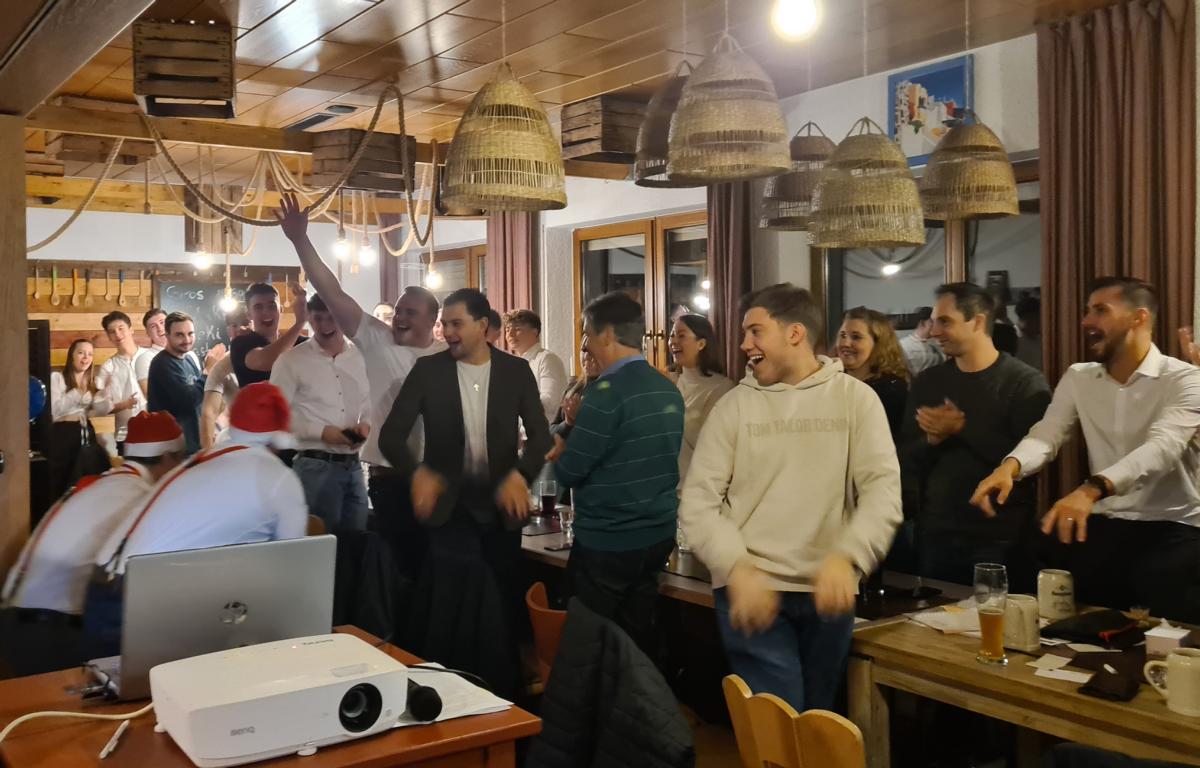 Als 2. Programmpunkt folgte bereits der Vortrag unserer 1. Herrenmannschaft. Gerade unsere Nachwuchskräfte im Team hatten sich mit der Challenge „Schlag den Schneider“ etwas ganz Besonderes einfallen lassen und viel Vorbereitungszeit hineingesteckt. Was war und ist im TV schon das Format „Schlag den Raab“ oder „Schlag den Star“, wenn sich die Herausforderer gegen einen Kevin Schneider beweisen müssen! Dessen Mannschaftskameraden Lenny Knapp und Tizian Last moderierten den Wettbewerb und stellten ihren Mannschaftskameraden als „unser Wunderkind“ vor, „das im härtesten Dschungel der Welt, dem Ulrichsbruch, aufgewachsen ist“. In 7 Spielen wie „Getränk erraten“ (Mix-Cocktail aus Kaltem Pfefferminztee, Multivitaminsaft, Gurkenwasser und Tabasco), „Junk in the Trunk“, „FC-Quiz“, „Weihnachtsbaumkugel versenken“, „Rechenquiz“, „Liedersingen“ und „Kopfbowling“ forderten Jakob Schorr, Timo Teufel, Samuele Di Lisa, der Sportliche Leiter Marvin Keller, Noah Zorn, Nikolas Wagner und Luis Benz den Star Schneider heraus. Wieder einmal sollte sich bewahrheiten: Wenn der Kevin das 1:0 macht, dann gewinnt er auch. So auch diesmal, indem er 5 der 7 Wettbewerbe für sich entschied. Einer der Höhepunkte war sicherlich Kevins lieblicher Gesang bei Spiel #6. Ein echt toller Vortrag unserer „Ersten“, der nicht nur den Zuschauer/innen, sondern vor allem auch den Protagonisten selbst, riesigen Spaß bereitet hat.