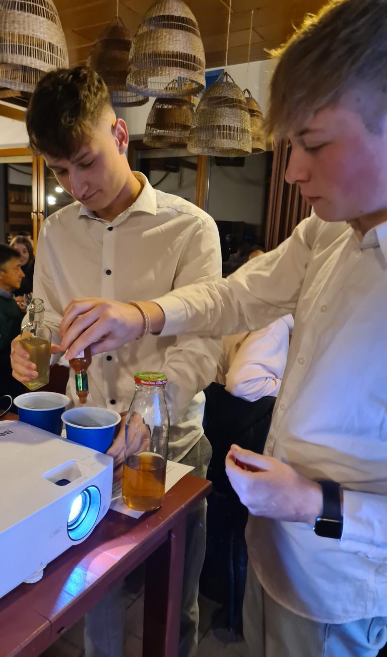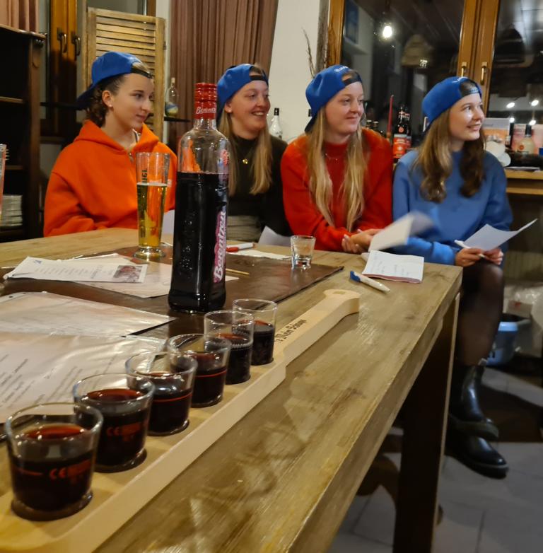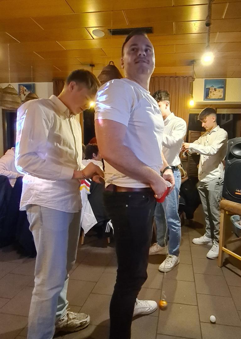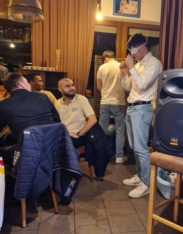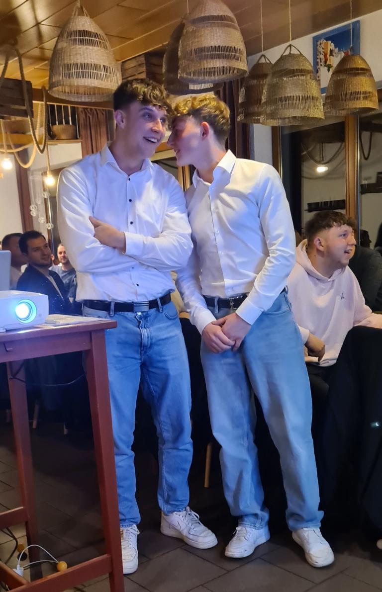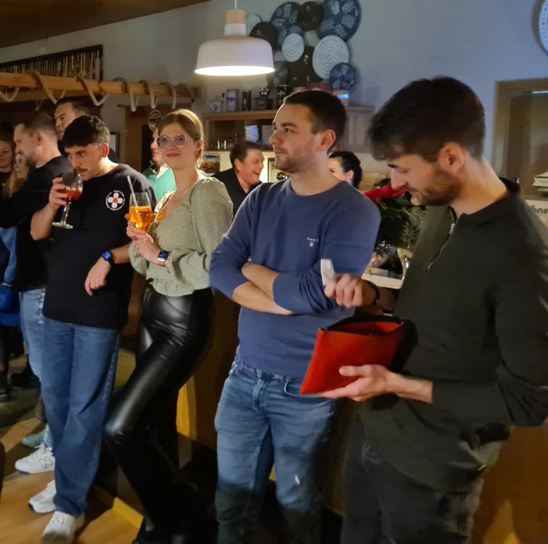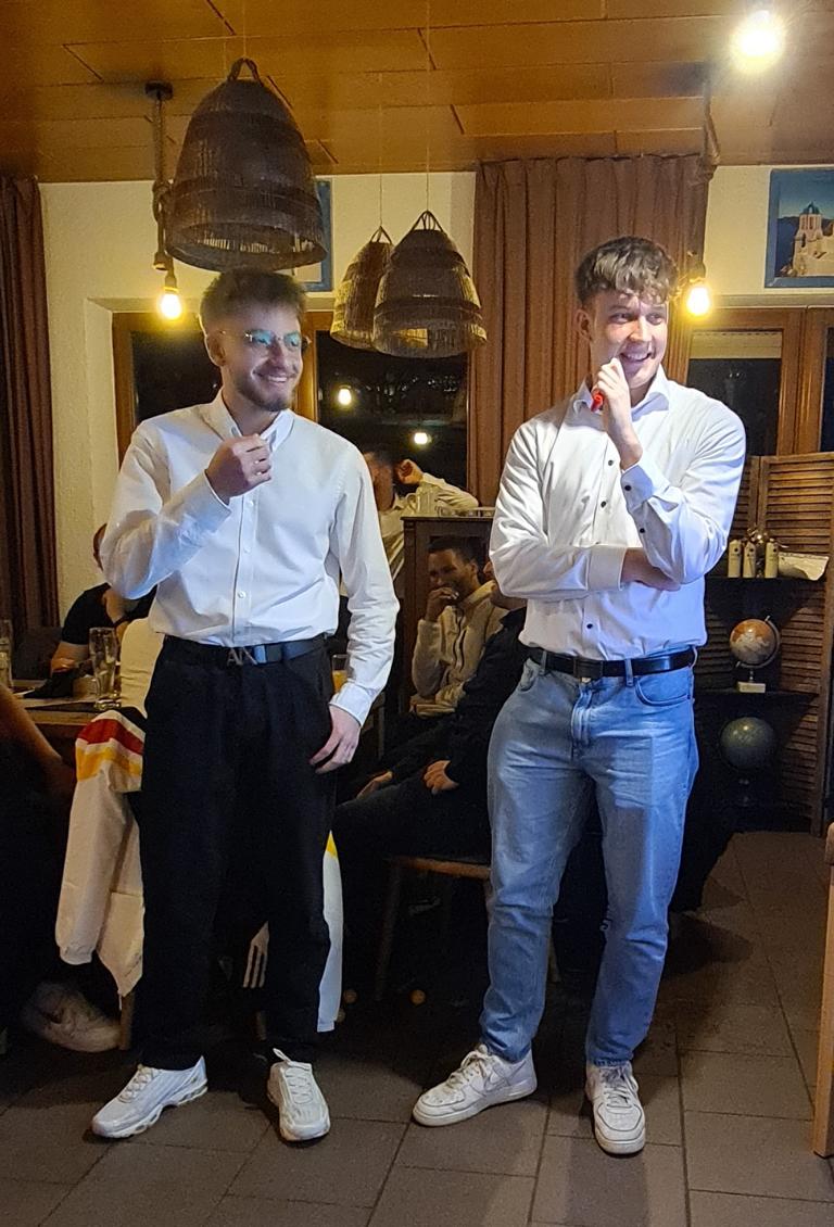 Als 2. Programmpunkt folgte bereits der Vortrag unserer 1. Herrenmannschaft. Gerade unsere Nachwuchskräfte im Team hatten sich mit der Challenge „Schlag den Schneider“ etwas ganz Besonderes einfallen lassen und viel Vorbereitungszeit hineingesteckt. Was war und ist im TV schon das Format „Schlag den Raab“ oder „Schlag den Star“, wenn sich die Herausforderer gegen einen Kevin Schneider beweisen müssen! Dessen Mannschaftskameraden Lenny Knapp und Tizian Last moderierten den Wettbewerb und stellten ihren Mannschaftskameraden als „unser Wunderkind“ vor, „das im härtesten Dschungel der Welt, dem Ulrichsbruch, aufgewachsen ist“. In 7 Spielen wie „Getränk erraten“ (Mix-Cocktail aus Kaltem Pfefferminztee, Multivitaminsaft, Gurkenwasser und Tabasco), „Junk in the Trunk“, „FC-Quiz“, „Weihnachtsbaumkugel versenken“, „Rechenquiz“, „Liedersingen“ und „Kopfbowling“ forderten Jakob Schorr, Timo Teufel, Samuele Di Lisa, der Sportliche Leiter Marvin Keller, Noah Zorn, Nikolas Wagner und Luis Benz den Star Schneider heraus. Wieder einmal sollte sich bewahrheiten: Wenn der Kevin das 1:0 macht, dann gewinnt er auch. So auch diesmal, indem er 5 der 7 Wettbewerbe für sich entschied. Einer der Höhepunkte war sicherlich Kevins lieblicher Gesang bei Spiel #6. Ein echt toller Vortrag unserer „Ersten“, der nicht nur den Zuschauer/innen, sondern vor allem auch den Protagonisten selbst, riesigen Spaß bereitet hat.