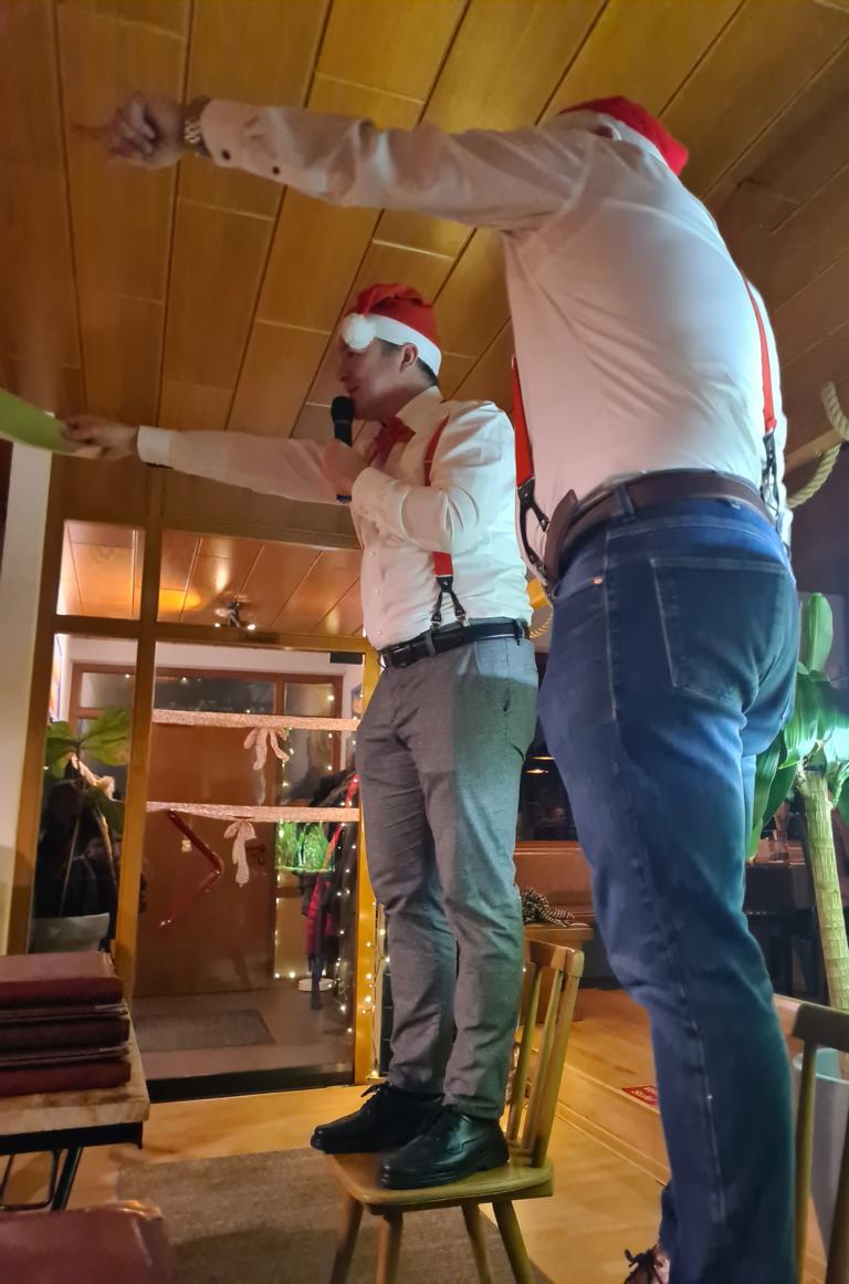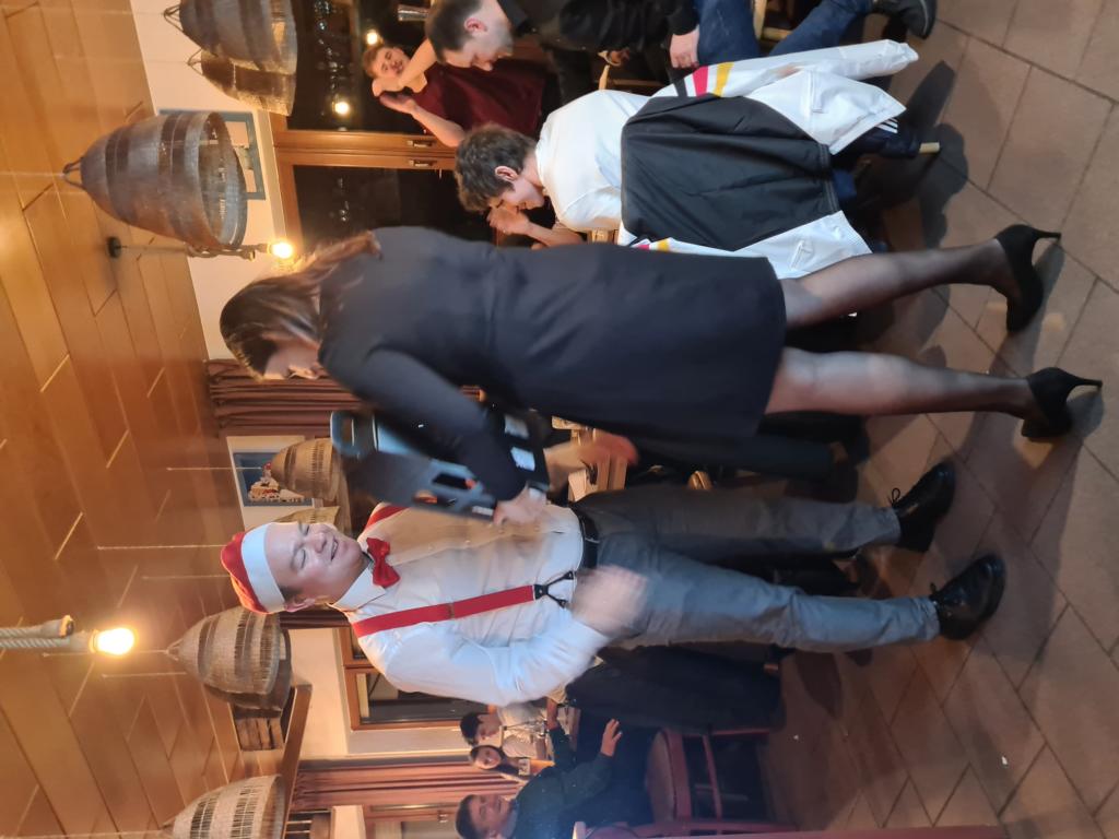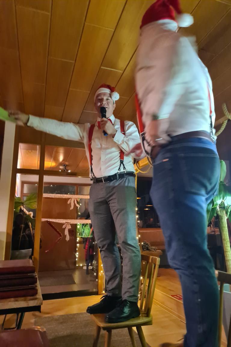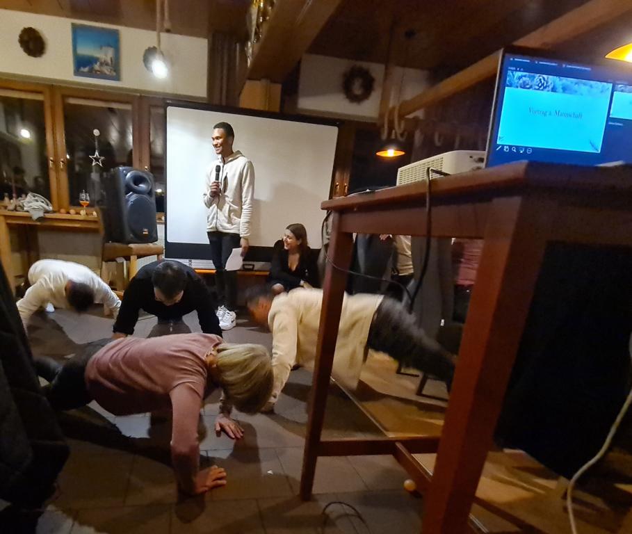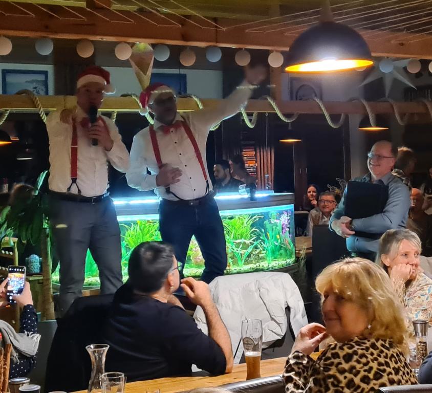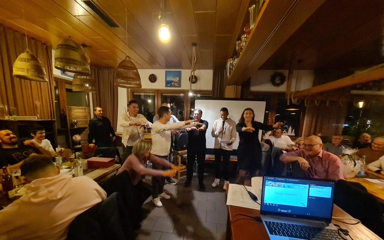 Danach wartete auch unsere 2. Herrenmannschaft mit ihrem Vortrag auf. Dafür suchten sie zunächst 6 Freiwillige. Vorgeschlagen wurde als Erste unsere Viola, die sich mit Monika Bauer, Dennis Braun, Acacio „Katz“ Da Silva, Luca Hodecker und Manuel Würtz 5 Partner/innen aussuchen durfte. Der Capitano der Zweiten Patrick Mann verlas eine Weihnachtsgeschichte, bei der die sechs Vorgenannten zu Schauspieler/innen wurden, diese bildlich vorstellten und dabei auch mit ihrer körperlichen Fitness beeindruckten. Es sei hier öffentlich verraten: „Katz“ wischte sich dabei im Geheimen den einen oder anderen Schweißtropfen von der Stirn.