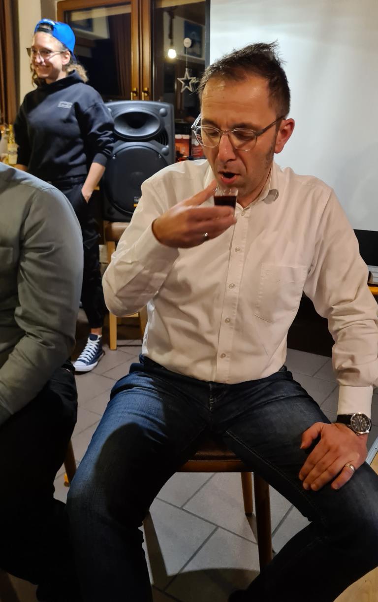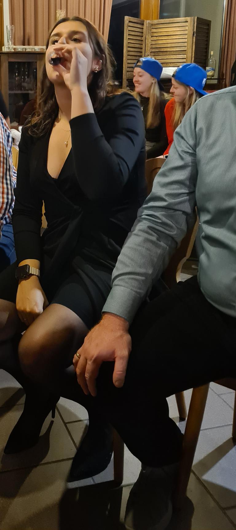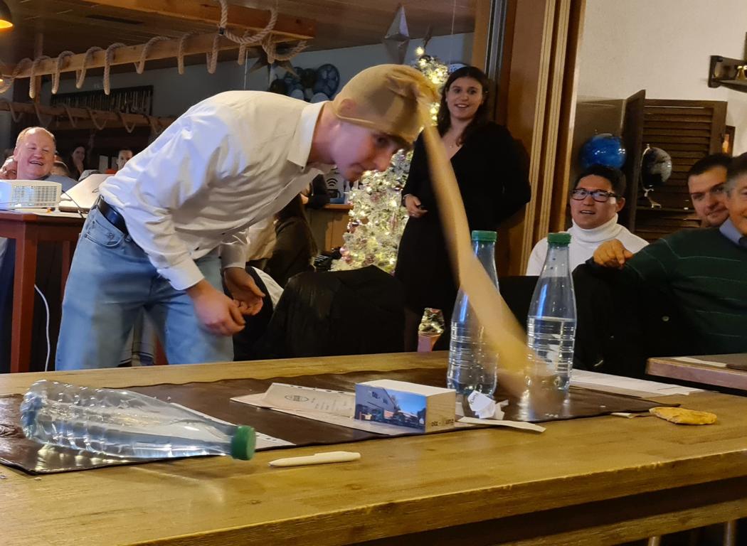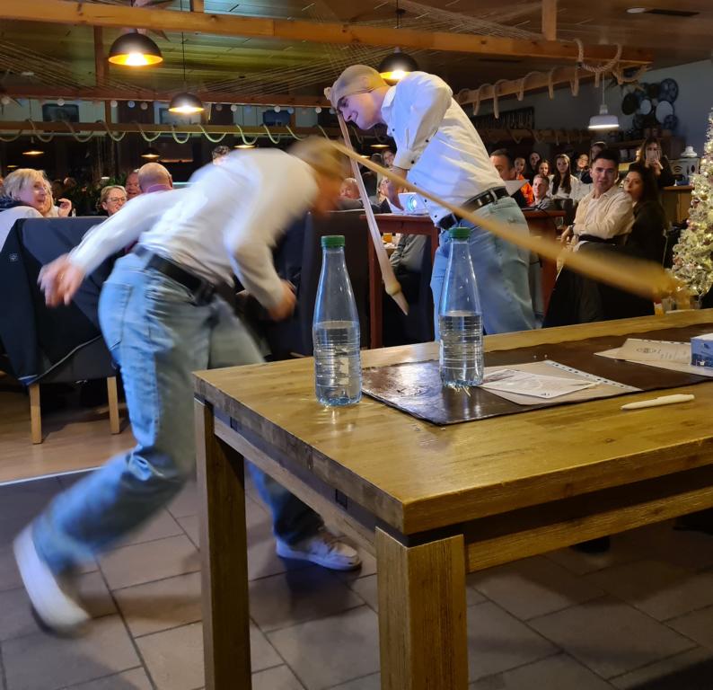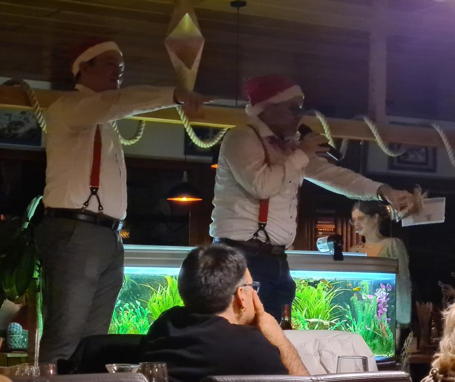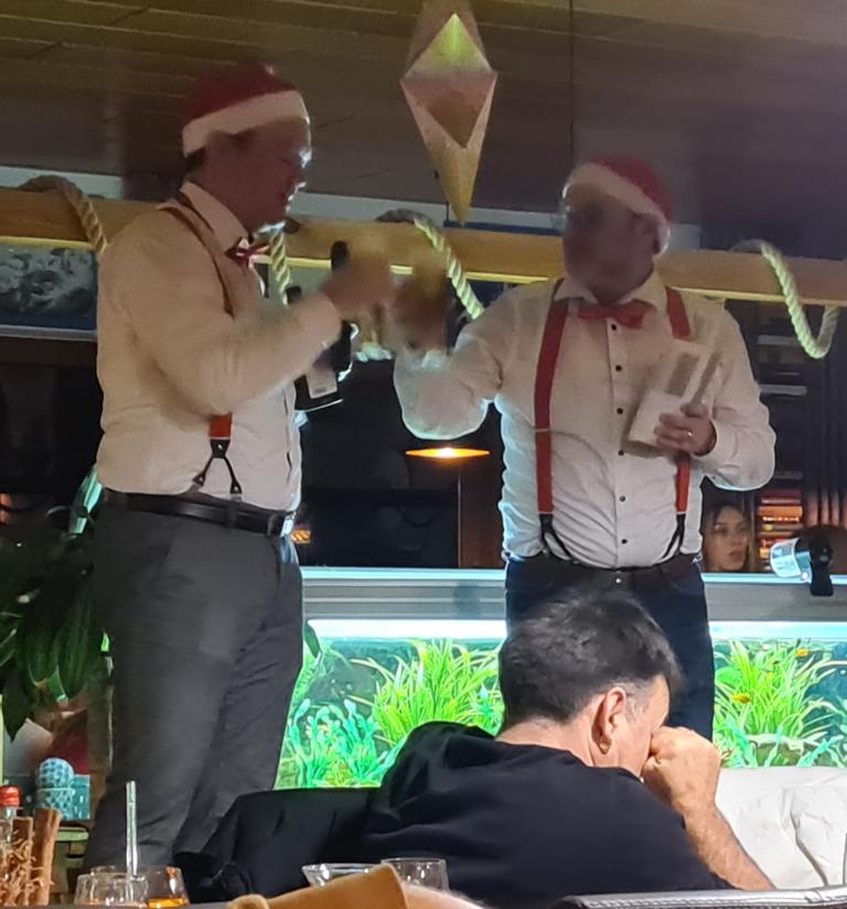 Danach wartete auch unsere 2. Herrenmannschaft mit ihrem Vortrag auf. Dafür suchten sie zunächst 6 Freiwillige. Vorgeschlagen wurde als Erste unsere Viola, die sich mit Monika Bauer, Dennis Braun, Acacio „Katz“ Da Silva, Luca Hodecker und Manuel Würtz 5 Partner/innen aussuchen durfte. Der Capitano der Zweiten Patrick Mann verlas eine Weihnachtsgeschichte, bei der die sechs Vorgenannten zu Schauspieler/innen wurden, diese bildlich vorstellten und dabei auch mit ihrer körperlichen Fitness beeindruckten. Es sei hier öffentlich verraten: „Katz“ wischte sich dabei im Geheimen den einen oder anderen Schweißtropfen von der Stirn.