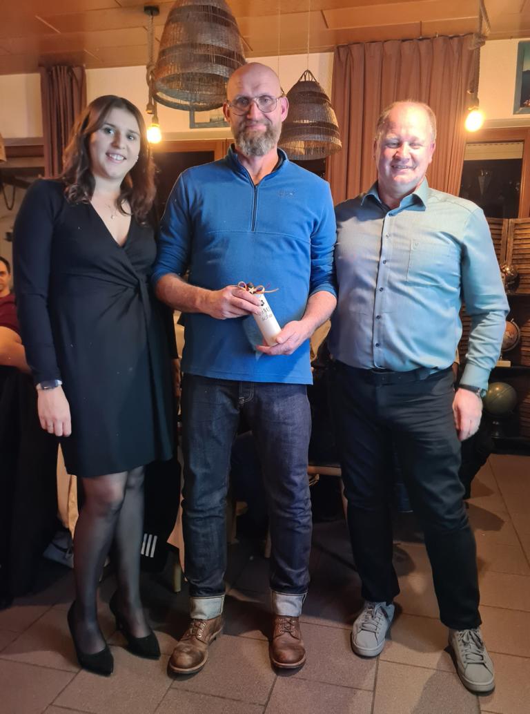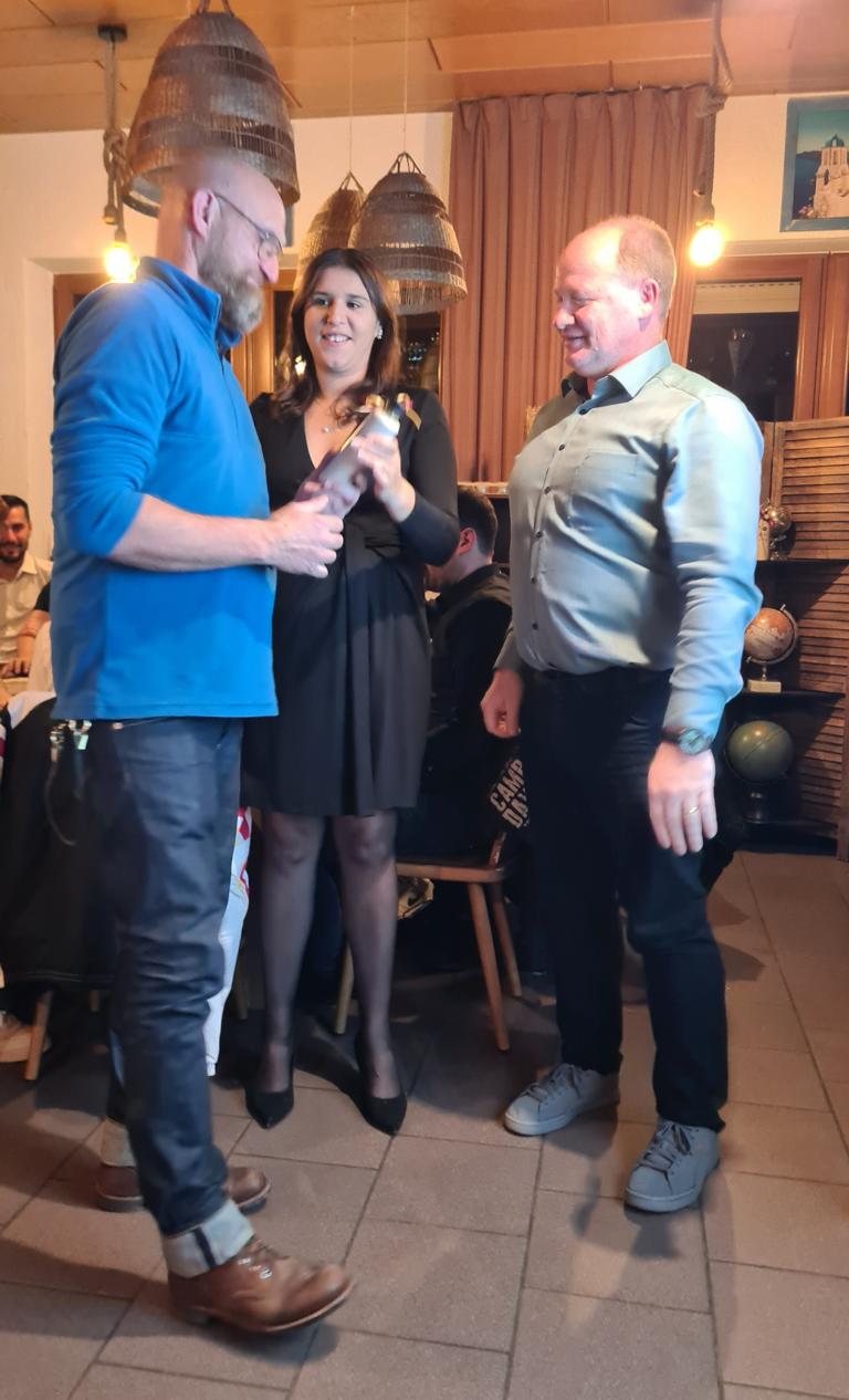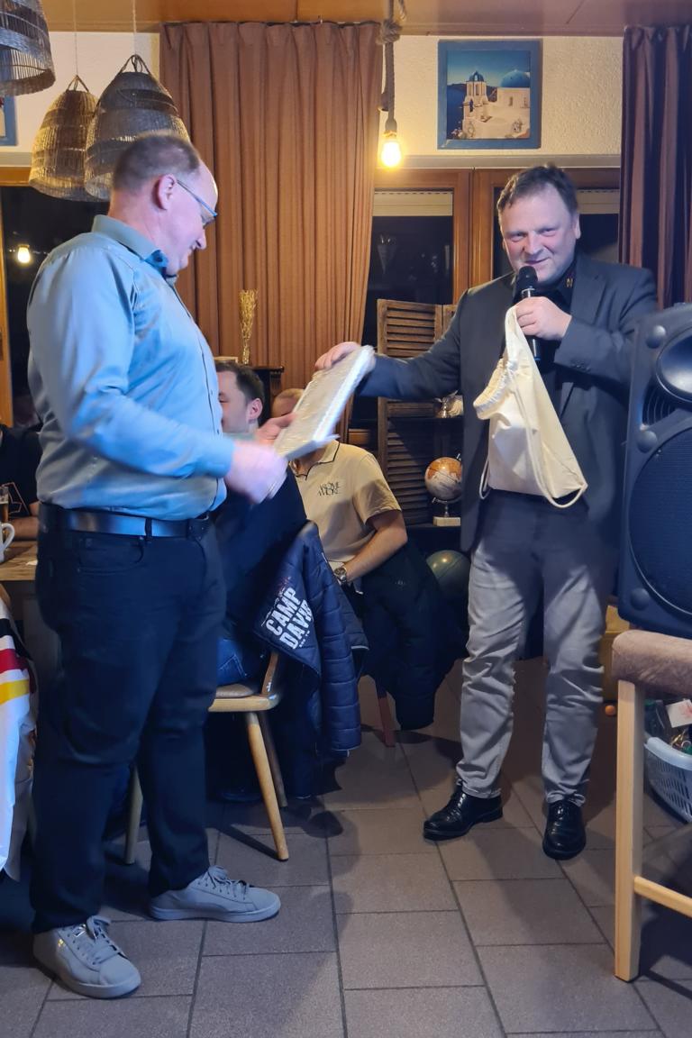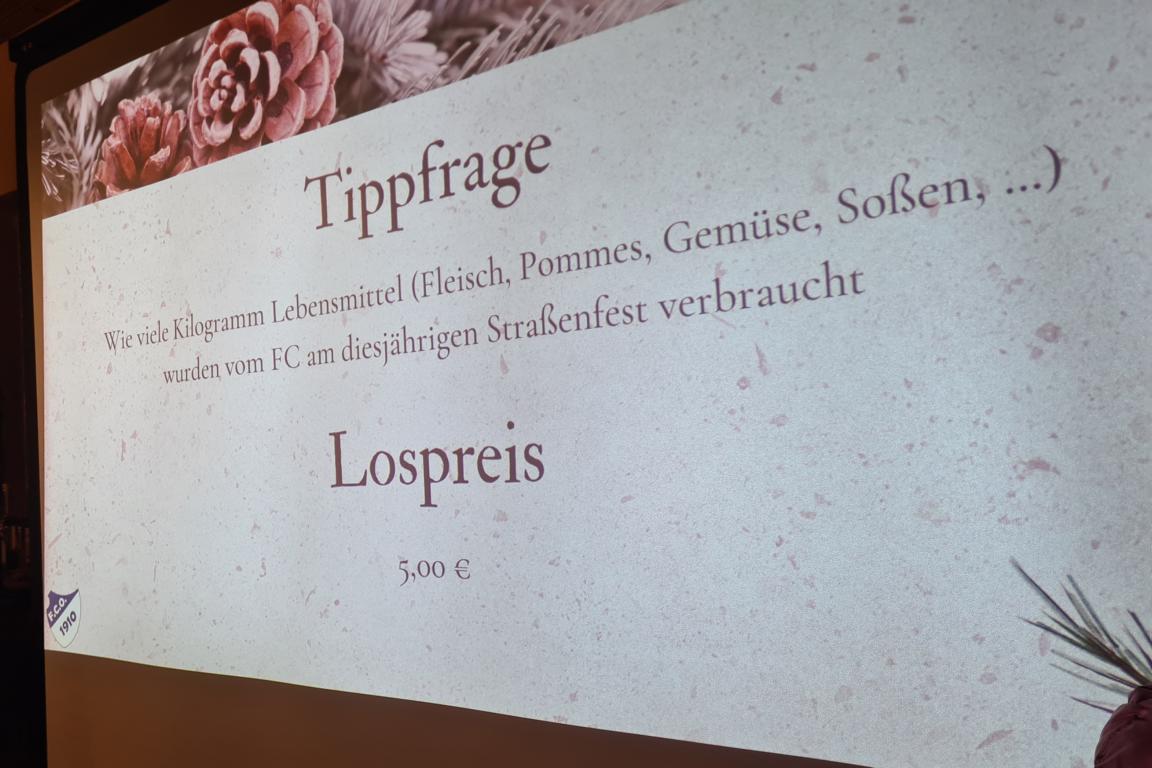 Zur Weihnachtsfeiertradition gehört auch längst das Tippspiel, für welches Marcus bereits zu Beginn der Veranstaltung den Startschuss gegeben hatte und für das unsere Herrenteams gegen einen Obolus Teilnahmezettel verkauft hatten. Auf diesen galt es diesmal die Schätzung zu notieren, wieviel Kilogramm Lebensmittel (Fleisch, Pommes, Gemüse, Soßen u.v.m.) von unserem FCO beim diesjährigen Straßenfest verbraucht worden waren. Nun wurde das Ergebnis aufgelöst und die drei Preisträger/innen verkündet. Platz 3 ging an unseren Spielausschuss und 2.-Mannschaftsspieler Jan Bayer, der 1.333,8 kg geschätzt hatte. Während Jan nur knappe 128 kg danebenlag, war das Rennen um Platz 1 noch um Einiges enger, sprich megaknapp. Während Thomas Vogel (1.499 kg) das richtige Ergebnis von 1.461,82 kg nur um 37,18 kg verfehlte, toppte dies Ursula Wagner noch mit 1.425 kg, mit 36,82 kg Abweichung und damit nur mit ganzen 36 Gramm besser als Thomas. Unsere drei Sieger/innen wurden für ihre Expertisen mit Preisen belohnt.