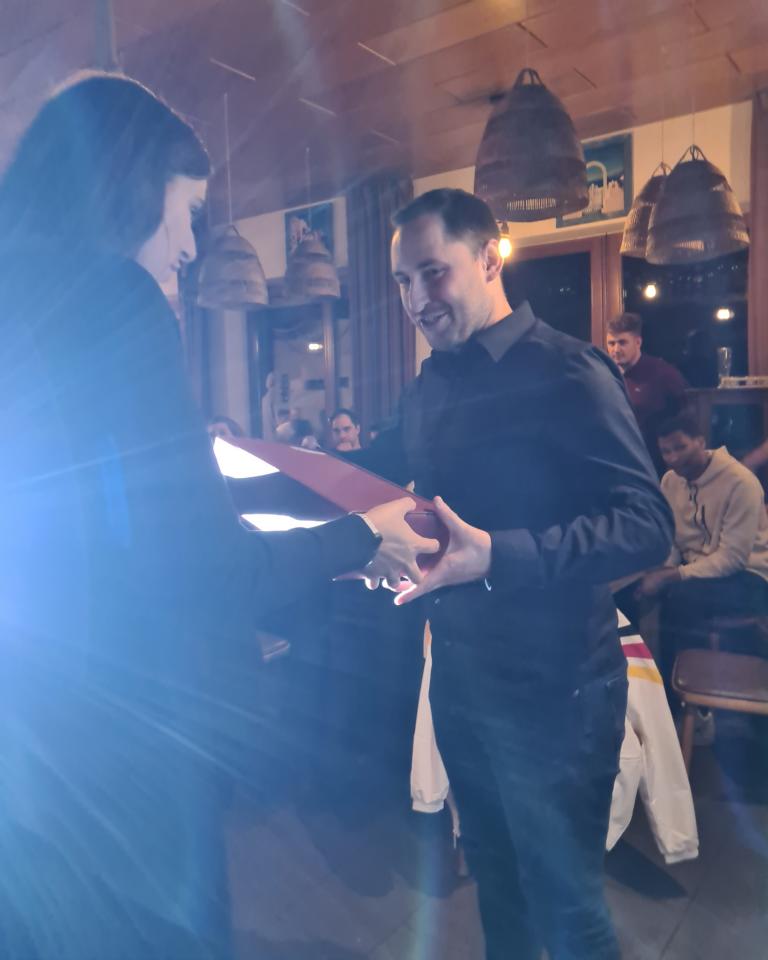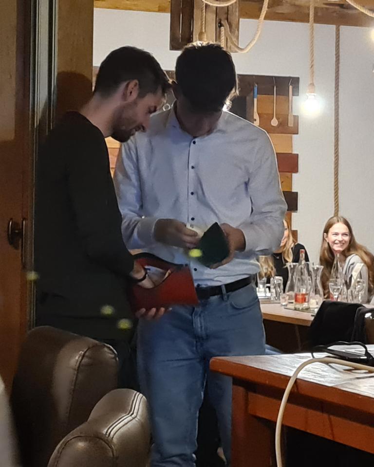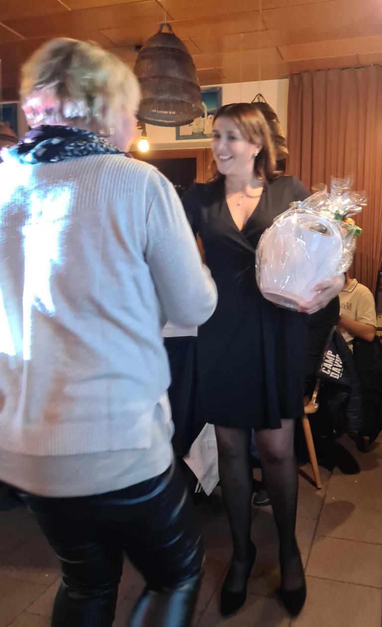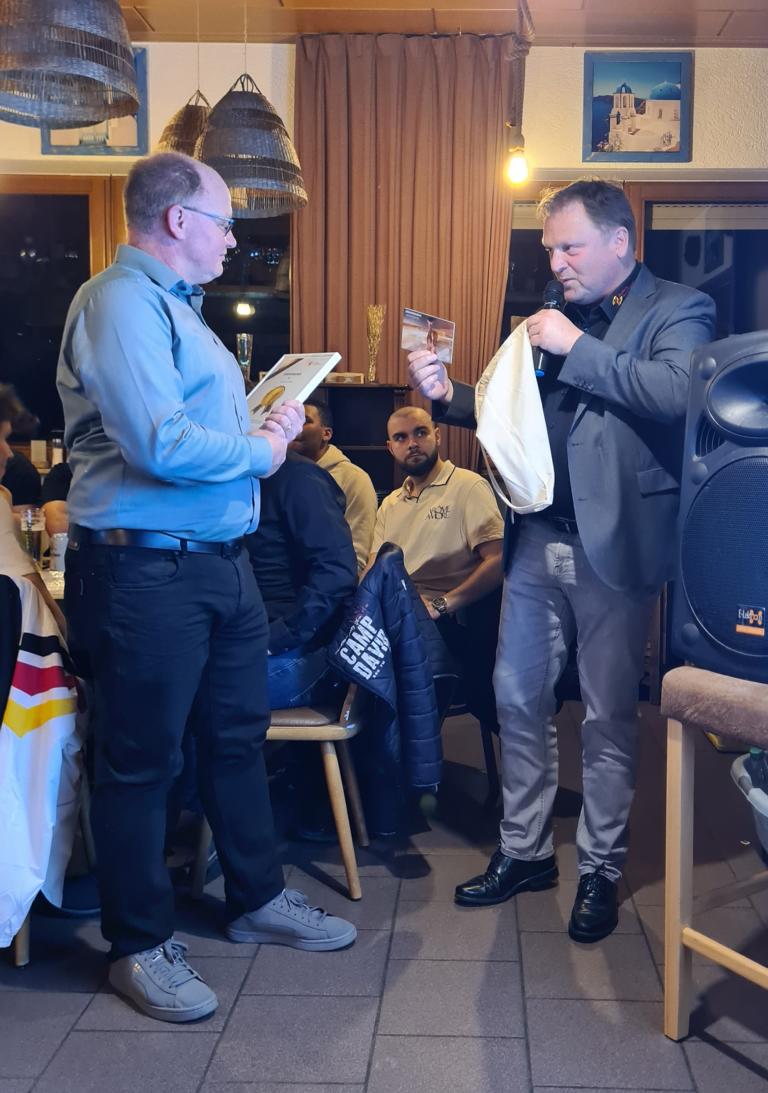 Zur Weihnachtsfeiertradition gehört auch längst das Tippspiel, für welches Marcus bereits zu Beginn der Veranstaltung den Startschuss gegeben hatte und für das unsere Herrenteams gegen einen Obolus Teilnahmezettel verkauft hatten. Auf diesen galt es diesmal die Schätzung zu notieren, wieviel Kilogramm Lebensmittel (Fleisch, Pommes, Gemüse, Soßen u.v.m.) von unserem FCO beim diesjährigen Straßenfest verbraucht worden waren. Nun wurde das Ergebnis aufgelöst und die drei Preisträger/innen verkündet. Platz 3 ging an unseren Spielausschuss und 2.-Mannschaftsspieler Jan Bayer, der 1.333,8 kg geschätzt hatte. Während Jan nur knappe 128 kg danebenlag, war das Rennen um Platz 1 noch um Einiges enger, sprich megaknapp. Während Thomas Vogel (1.499 kg) das richtige Ergebnis von 1.461,82 kg nur um 37,18 kg verfehlte, toppte dies Ursula Wagner noch mit 1.425 kg, mit 36,82 kg Abweichung und damit nur mit ganzen 36 Gramm besser als Thomas. Unsere drei Sieger/innen wurden für ihre Expertisen mit Preisen belohnt.