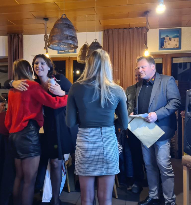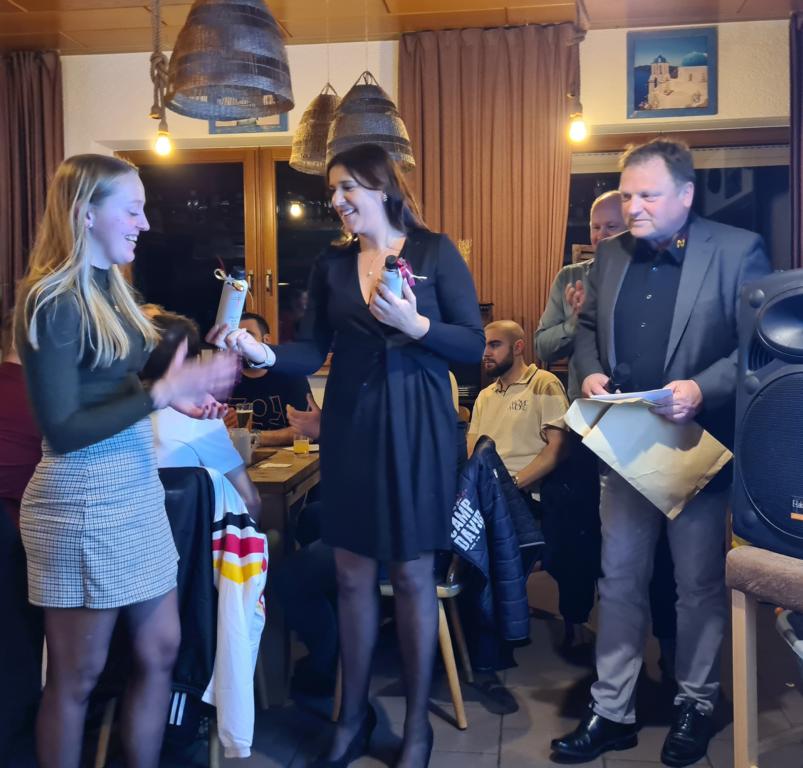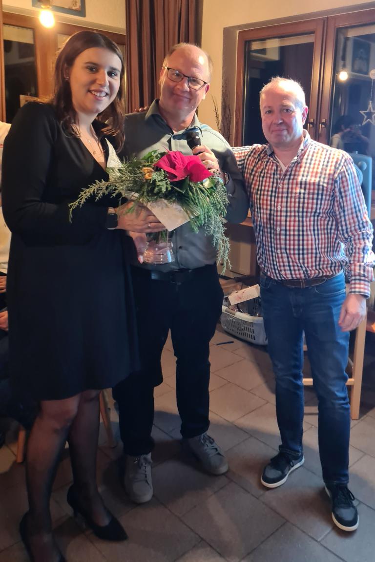 Torsten Witte bedankte sich im Namen der Vorstandschaft bei allen Anwesenden sowie bei den örtlichen und überörtlichen Firmen sowie im Zuge des „Weihnachtssammeln der Aktiven“ auch bei den Vereinsmitgliedern für die Spenden, die natürlich auch wieder eine Tombola möglich gemacht hatten. Die Preise hierzu wurden später noch im Kabinentrakt ausgehändigt, dies von Spielerinnen und Spielern unserer Teams sowie von Allrounderin Viola, die für ihr Engagement nicht nur für und bei der Weihnachtsfeier, von Torsten und Marcus noch hochverdientermaßen einen Blumenstrauß überreicht bekam.