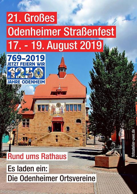 Vom 17. bis 19. August 2019 hatte der Arbeitskreis Odenheimer Vereine (AOV) zum mittlerweile 21. Odenheimer Straßenfest eingeladen, das dieses Jahr ganz im Zeichen des 1.250-jährigen Ortsjubiläums stand. Im Dorfzentrum waren zahlreiche Vereine und einheimischen Winzer mit von der Partie, auf der Open-Air-Bühne fanden zudem kunterbunte Veranstaltungen statt.