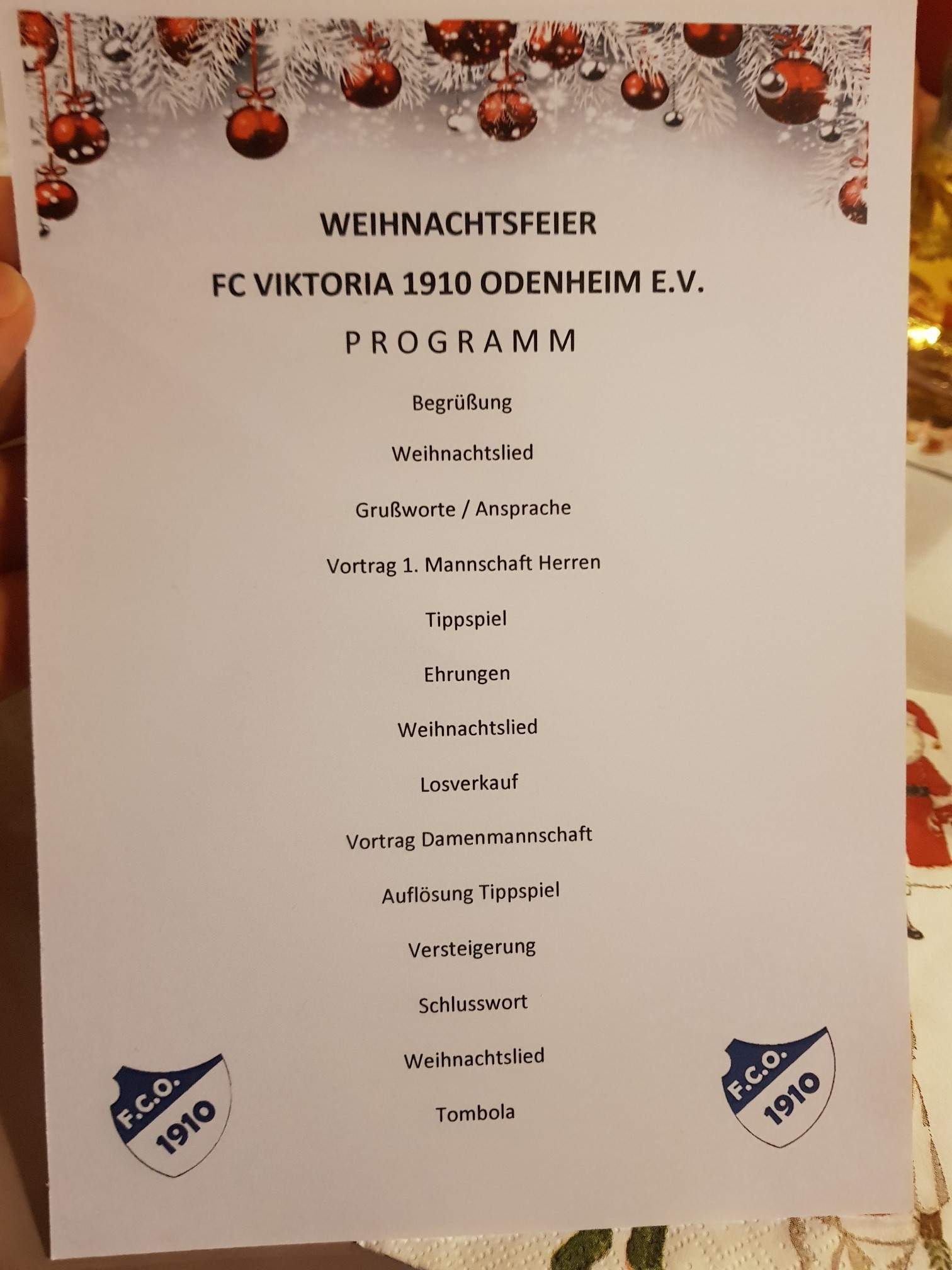 Am 21.12.2019 begrüßte die FCO-Vorstandschaft rund 100 Gäste zur traditionellen Weihnachtsfeier des Odenheimer Fußballvereins. Diese erwartete ein abwechslungsreiches und kurzweiliges Rahmenprogramm, dessen Moderation abwechselnd von den Vorstandsmitgliedern Viola Spitzer, Torsten Witte und Marcus Schäfer übernommen wurde. Hauptprogrammpunkte wie die Vorträge der Herren-und Damenmannschaften, die Ehrung verdienter Vereinsmitglieder, das FCO-Tippspiel oder die beliebte Versteigerung wurden mit Grußworten, Jahresrückblicken, Weihnachtsgedichten und -liedern umrahmt. In Vertretung des Bürgermeisters überbrachten die 2. Bürgermeisterstellvertreterin Ursula Neckermann und Ortsvorsteherstellvertreter Martin Scheuring die Grußworte der politischen Gemeinde.