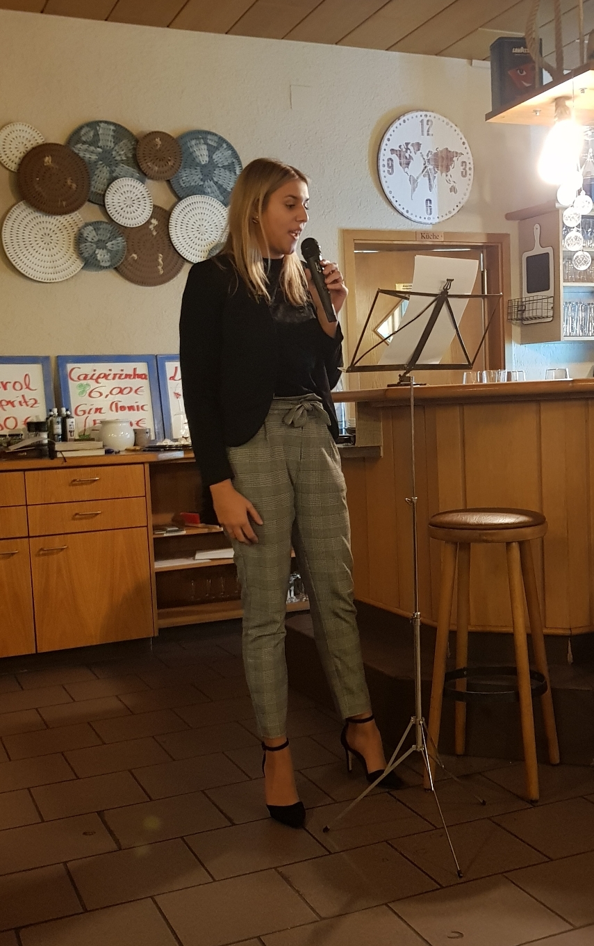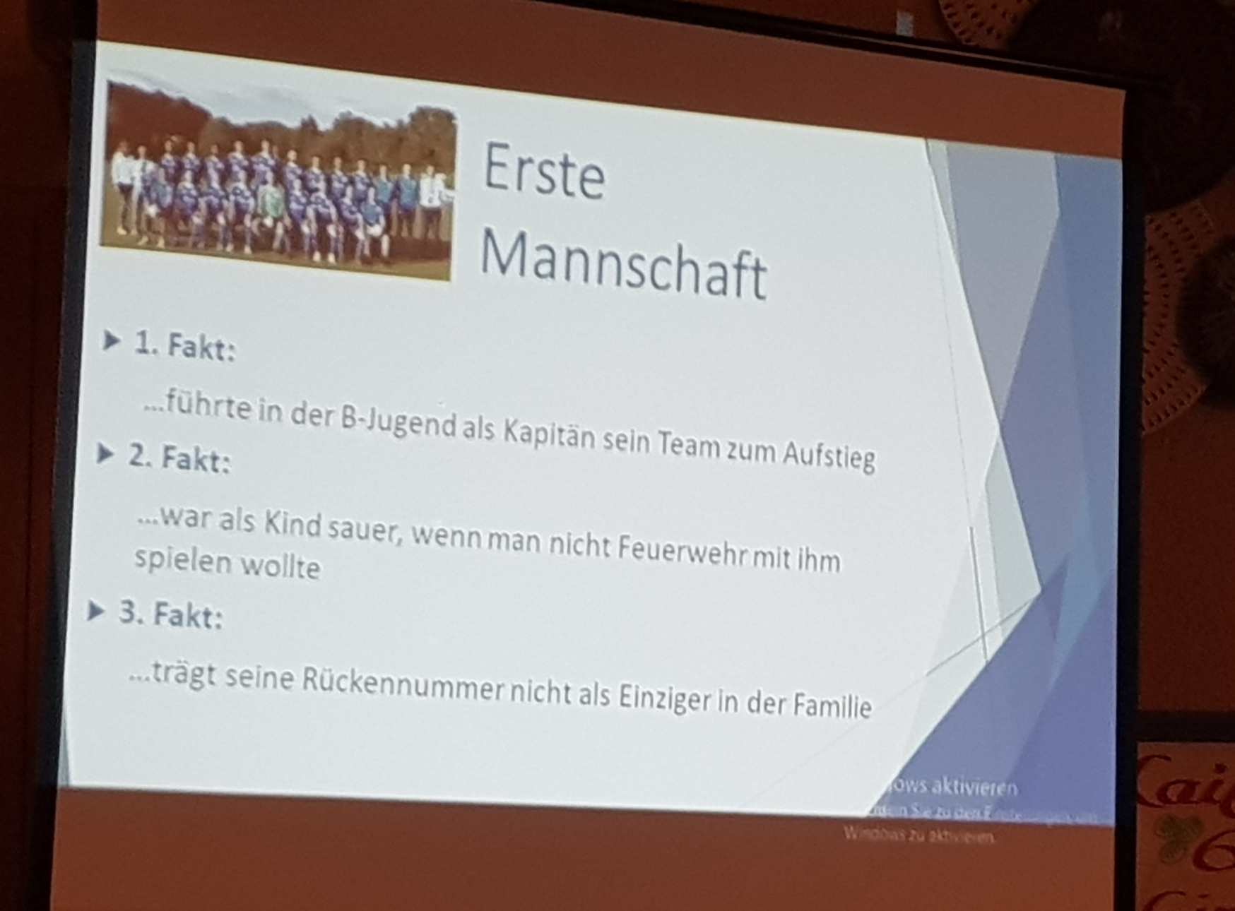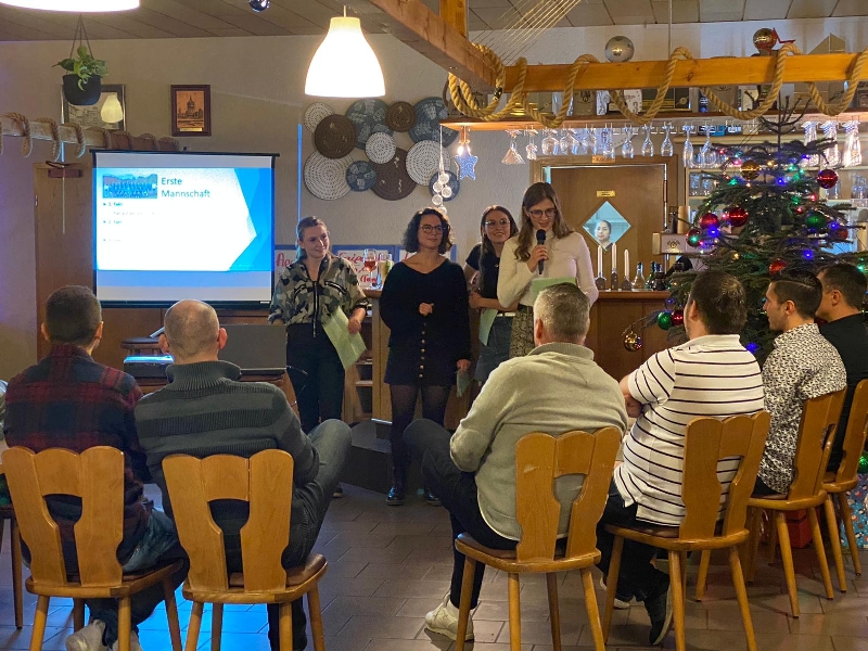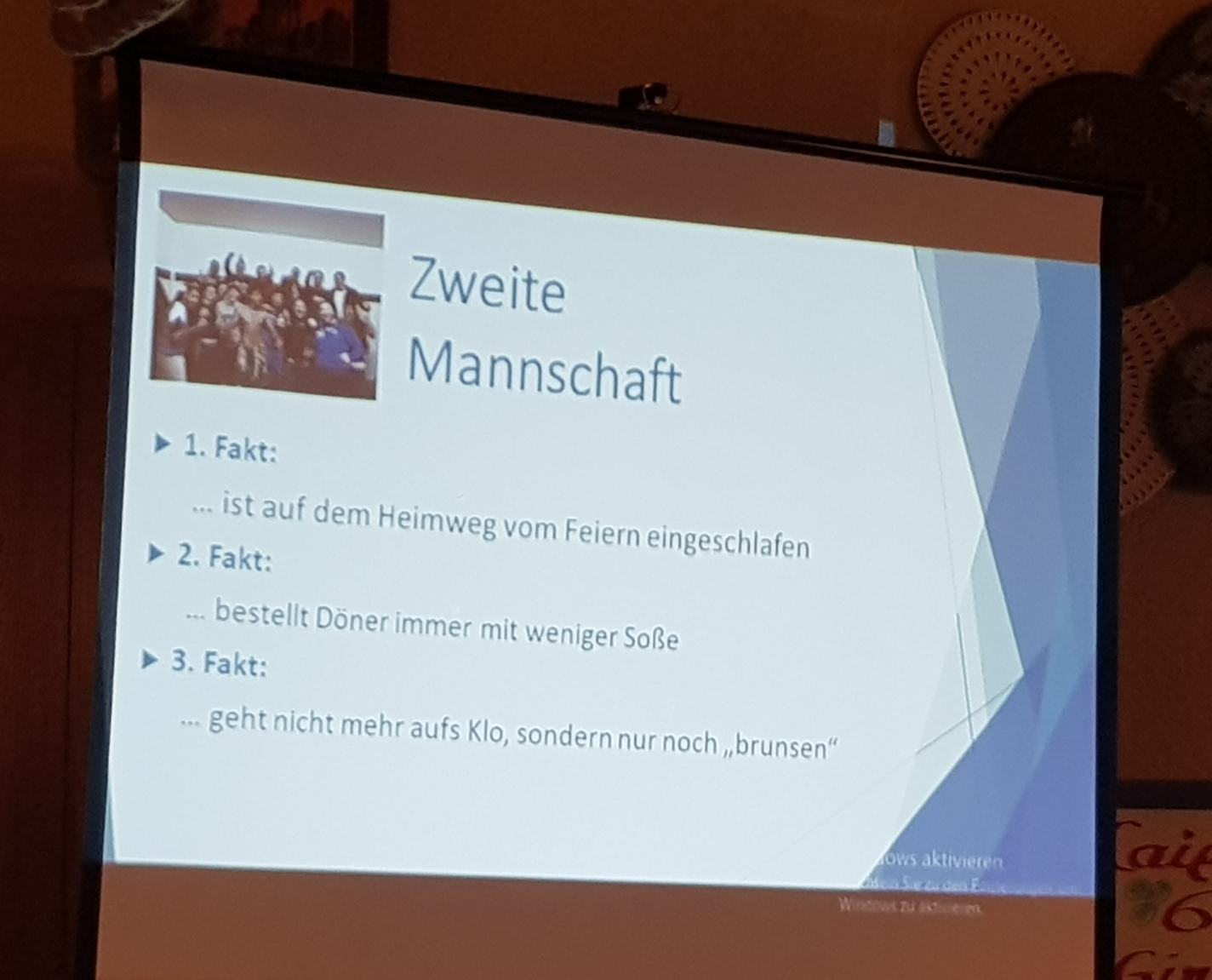 Die FCO-Amazonen hatten sich wieder etwas ganz Besonderes ausgedacht. Stellvertretend für ihr Damenteam präsentierten Kapitänin Annalena May, Anja Fielenbach, Elena Schanzenbach und Laura Wetzel ein Spieler/innen-Quiz. Drei Trainerduos, Fabian Fersching/Luca Hodecker (1. Herrenmannschaft), Markus Wagner/Steffen Rudolf (2. Herrenmannschaft) und Joachim Reichert/Nico Sinibaldi (Damenmannschaft) stellten sich dem Wettkampf und hatten nacheinander anhand von jeweils drei punktemäßig gewichteten Fakten herauszufinden, welcher Spieler bzw. welche Spielerin ihrer Teams sich jeweils hinter welcher Power-Point-Präsentation verbirgt. Dabei erfuhr das Publikum interessante Geheimnisse und Storys über Spieler, die „auf dem Heimweg vom Feiern eingeschlafen waren“, „die als Kind sauer waren, wenn man nicht Feuerwehr mit ihnen spielen wollte“ oder die „nur mit einer Zahnbürste, einem Ersatzshirt und einer Aldi-Tüte nach Mallorca geflogen sind“. Nicht zu vergessen auch ein Fakt über einen sich noch gar nicht so lange in unserem Land befindlichen Kameraden und Freund, der „anstelle aufs Klo nur noch ´brunsen´ geht“ und somit auch schon den Odenheimer Dialekt verinnerlicht hat. Durch witzige Beschreibungen erfuhr man auch, wer von den FCO-Spielerinnen „die lustigsten Grimassen während dem Fußballspielen schneidet“ oder wer – wohlgemerkt nicht figurtechnisch gemeint – „im Trikot Obelix ähnelt“. Die meisten Punkte sammelten die Herren I-Coaches Fersching/Hodecker und freuten sich über einen riesigen Pokal. Wagner/Rudolf wurden für Platz 2 mit Medaillen ausgezeichnet und die Damentrainer Reichert/Sinibaldi für Rang 3 mit „Stirn-Medaillen“.