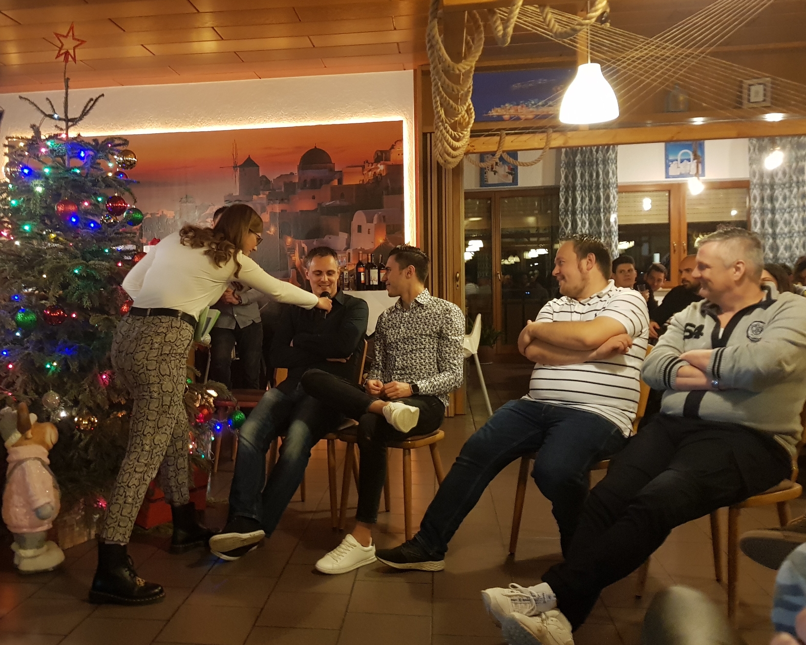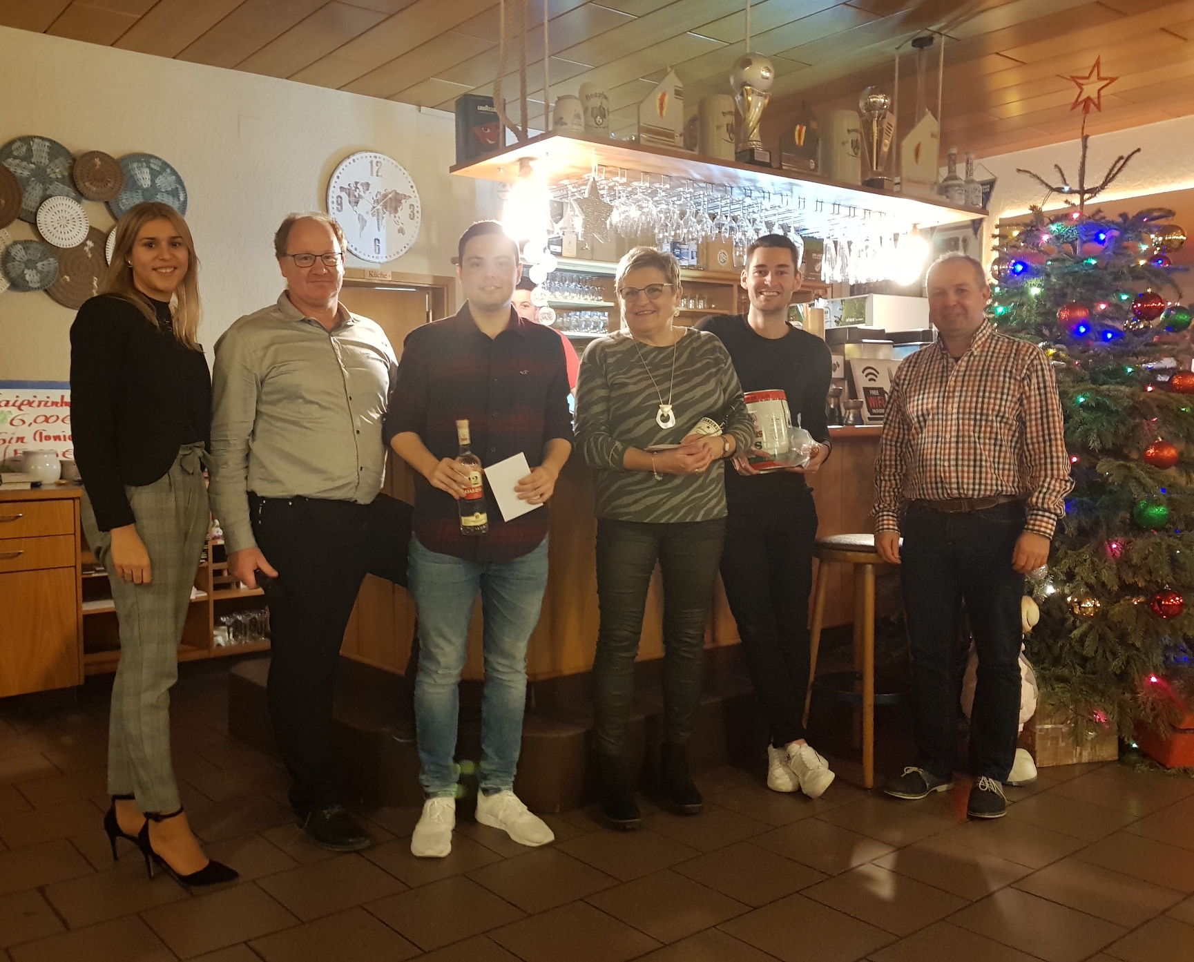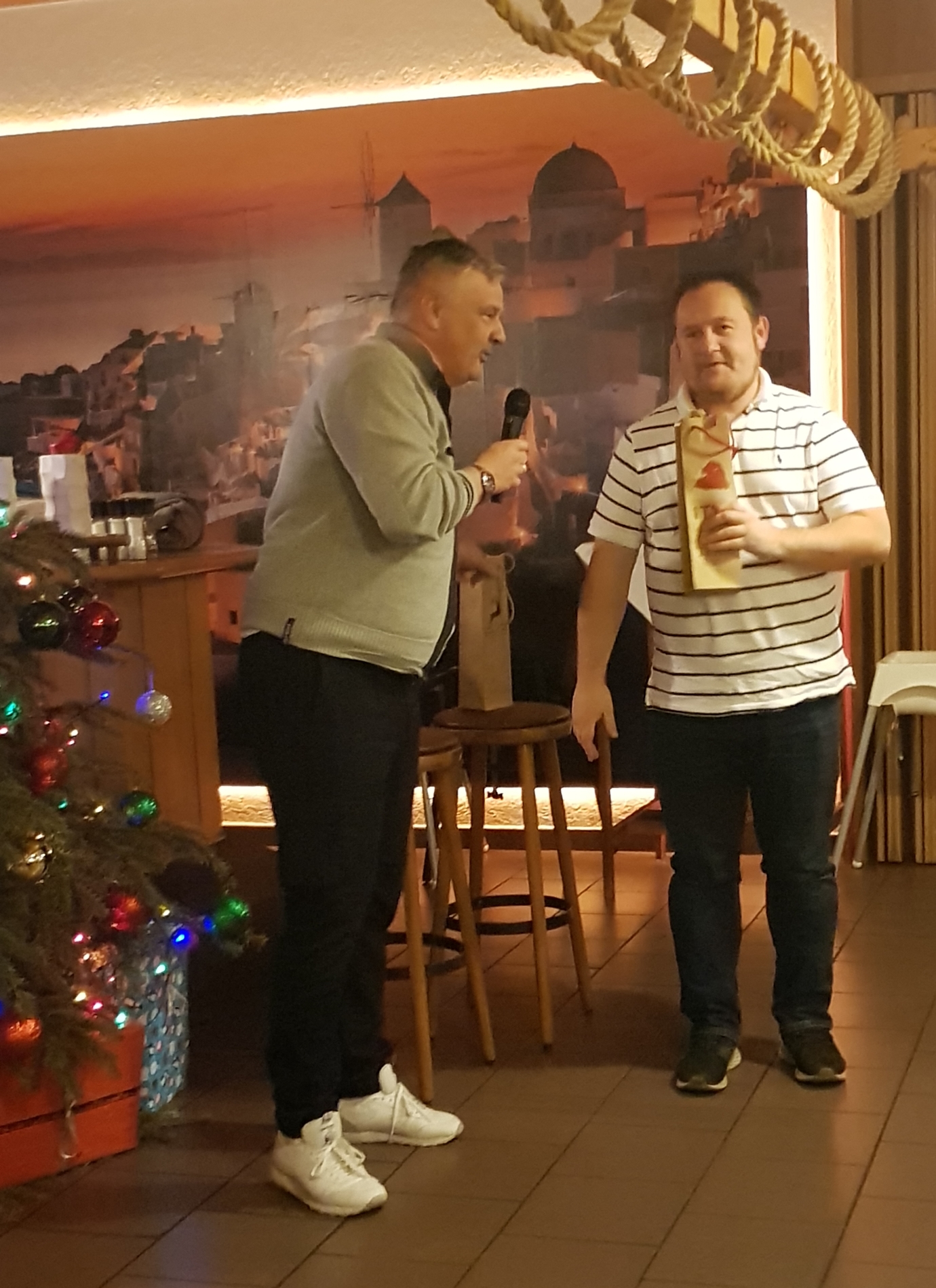 Hinter dem mit Spannung erwarteten Tippspiel verbarg sich dieses Mal die Frage, wieviel Liter Bier im Jahr 2019 im Rahmen des „Hoepfner-Lieferantenvertrages“ abgerufen und damit im FCO-Clubhaus, bei Heimspielen oder Vereinsfesten konsumiert wurden. Als Richtwerte ließen sich Witte/Schäfer eine mögliche Untergrenze von 50 und Obergrenze von 10.000 Litern entlocken. Eine wichtige Hilfe, waren doch zwischenzeitlich gerüchteweise Vermutungen von bis zu 26.000 Litern im Umlauf gewesen. Ganz so viele waren es natürlich nicht, aber auch die letztlich korrekte Zahl von 6.147 ist stattlich und spricht für trinkfeste Odenheimer. Der in diesem Jahr auf der Weihnachtsfeierbühne multipräsente Nico Sinibaldi verfehlte die richtige Literzahl nur um mickrige drei Liter und holte sich vor Gabi Stauacker und Marvin Wagner den diesjährigen Tippspielsieg.