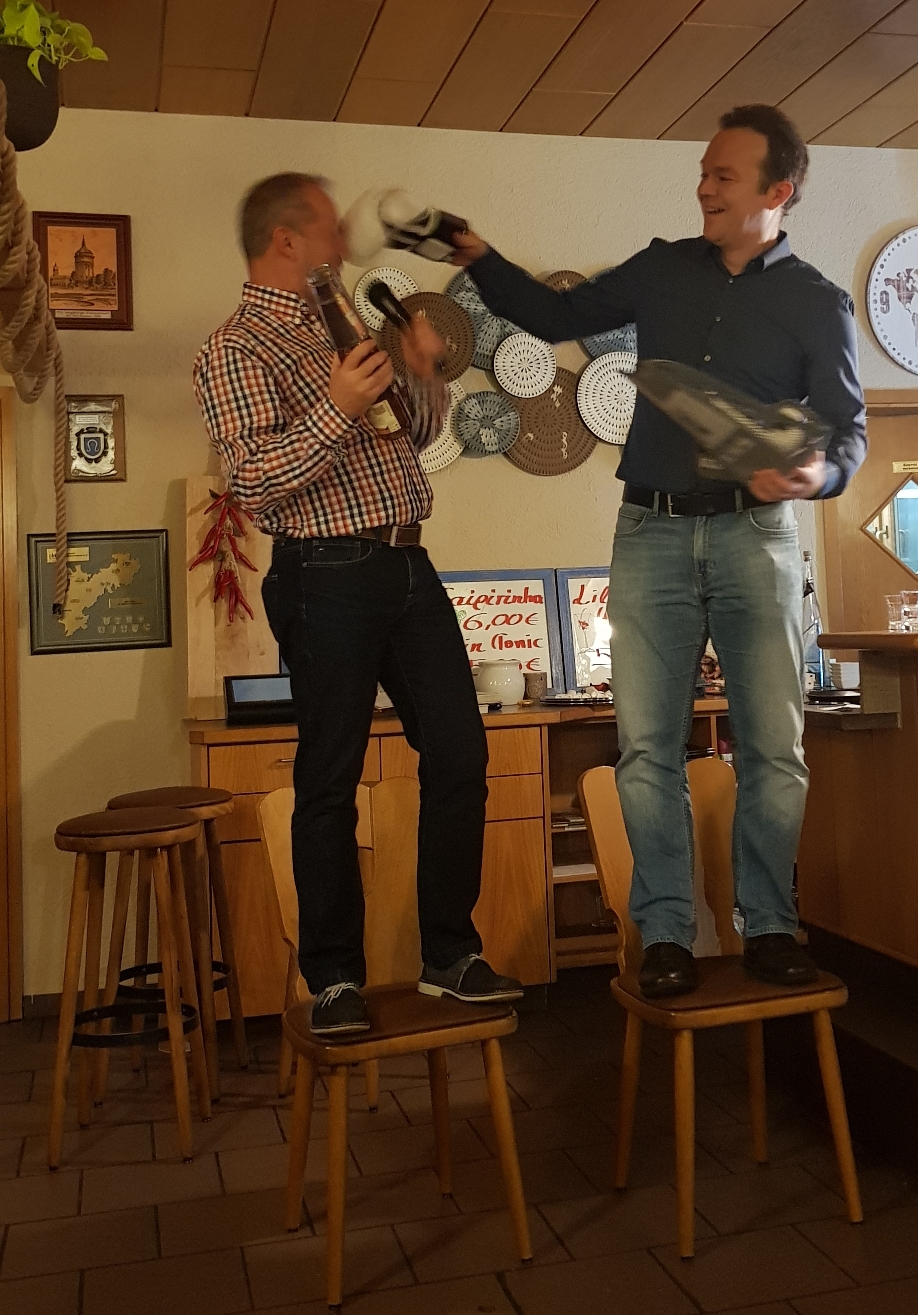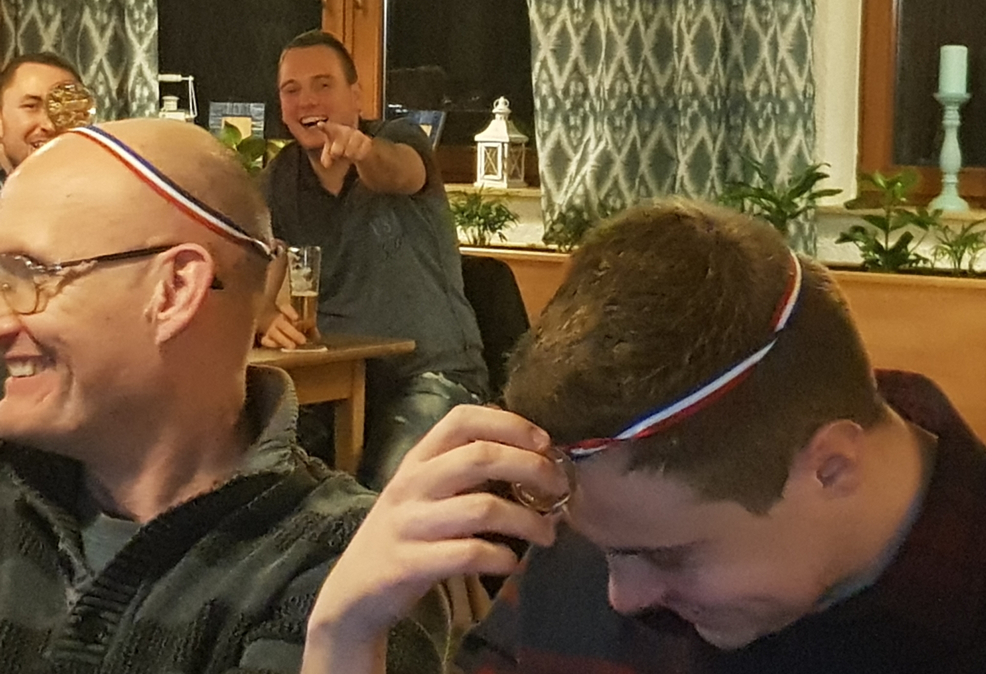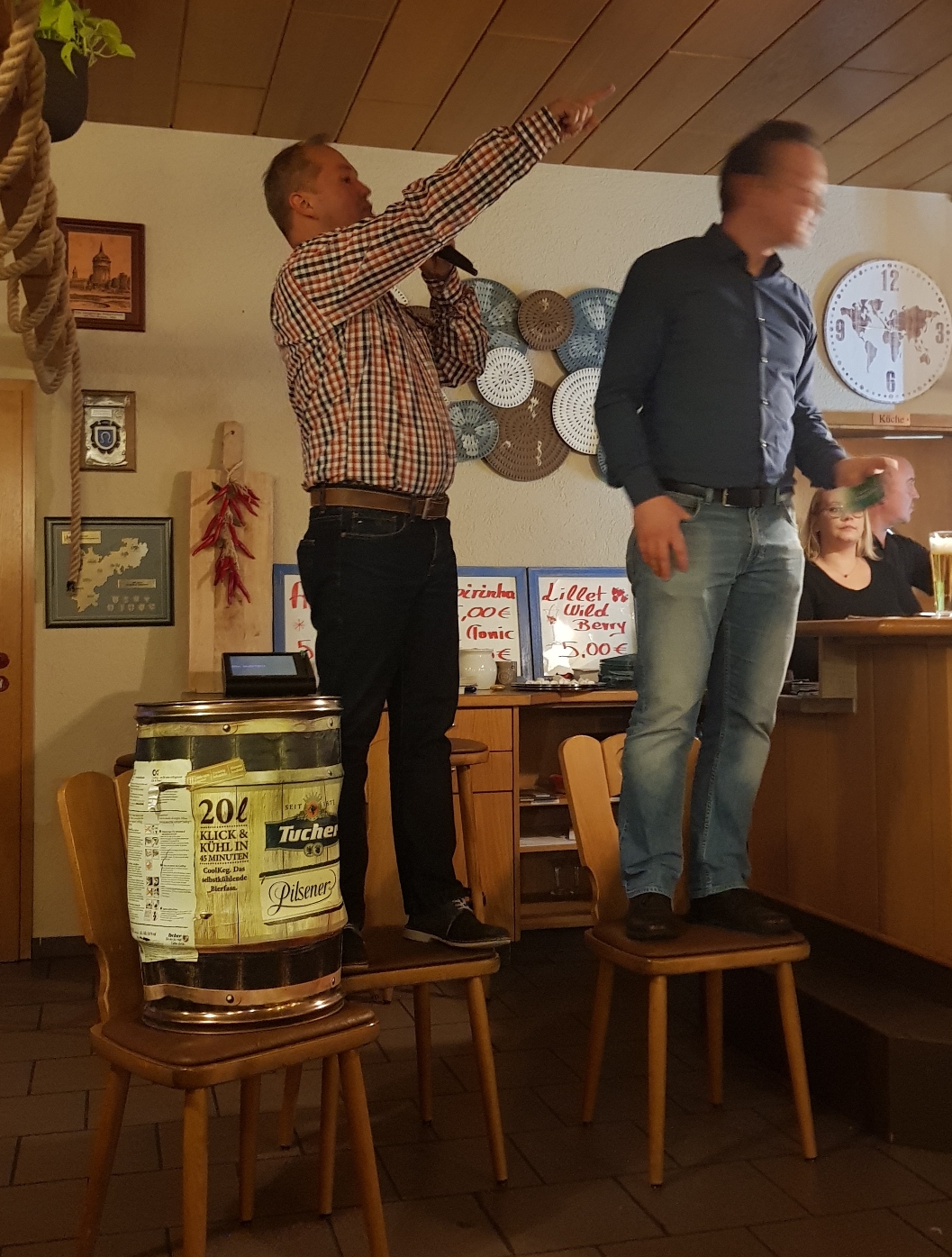 Hinter dem mit Spannung erwarteten Tippspiel verbarg sich dieses Mal die Frage, wieviel Liter Bier im Jahr 2019 im Rahmen des „Hoepfner-Lieferantenvertrages“ abgerufen und damit im FCO-Clubhaus, bei Heimspielen oder Vereinsfesten konsumiert wurden. Als Richtwerte ließen sich Witte/Schäfer eine mögliche Untergrenze von 50 und Obergrenze von 10.000 Litern entlocken. Eine wichtige Hilfe, waren doch zwischenzeitlich gerüchteweise Vermutungen von bis zu 26.000 Litern im Umlauf gewesen. Ganz so viele waren es natürlich nicht, aber auch die letztlich korrekte Zahl von 6.147 ist stattlich und spricht für trinkfeste Odenheimer. Der in diesem Jahr auf der Weihnachtsfeierbühne multipräsente Nico Sinibaldi verfehlte die richtige Literzahl nur um mickrige drei Liter und holte sich vor Gabi Stauacker und Marvin Wagner den diesjährigen Tippspielsieg.