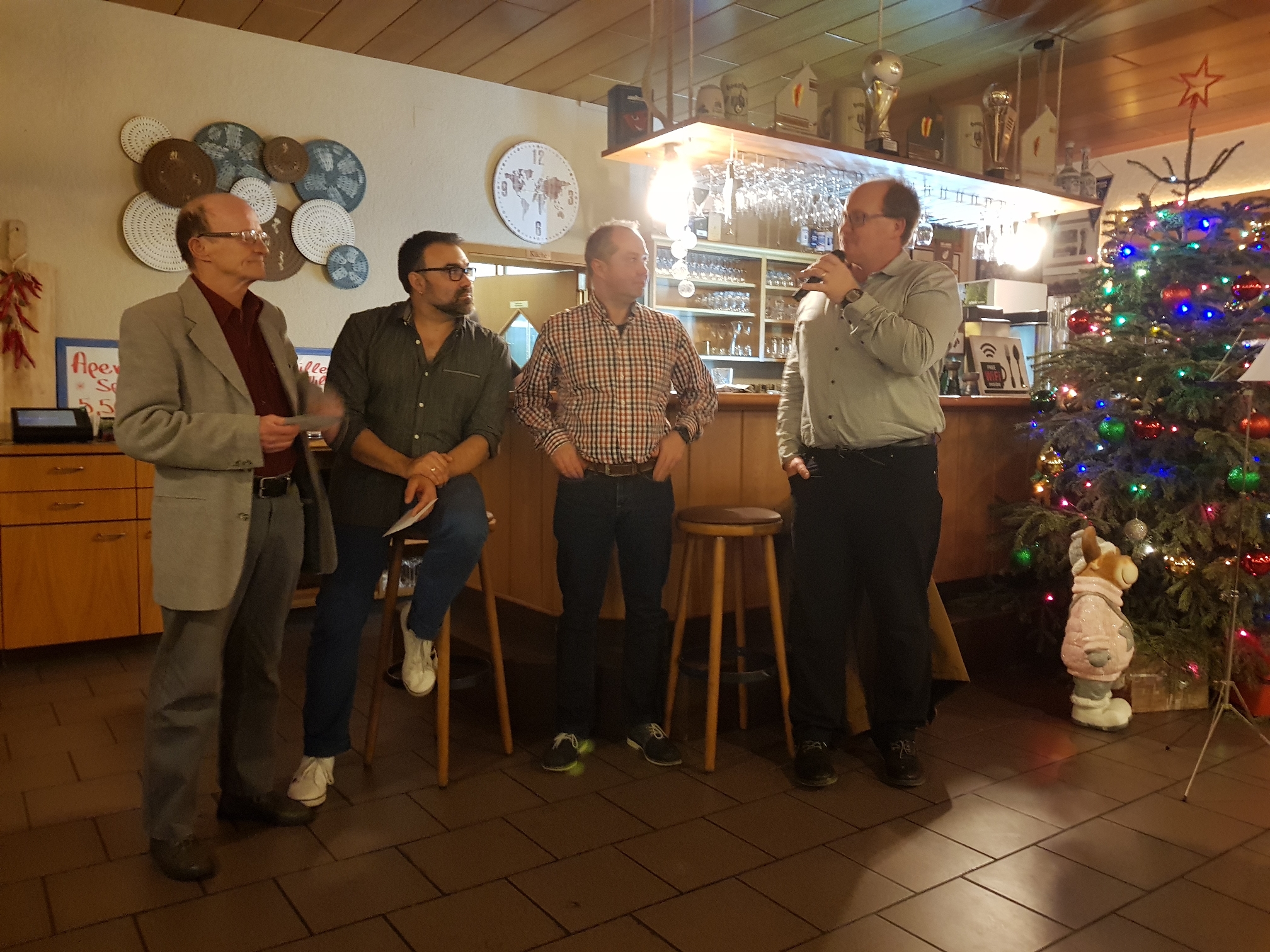 Torsten Witte und Marcus Schäfer bedankten sich bei allen, die den FCO im zu Ende gehenden Jahr in vielfältiger Weise unterstützt haben. Insbesondere hoben sie auch all die Personen hervor, die eher im Hintergrund agieren, ohne die jedoch vieles nicht so gut funktionieren würde. Um zu zeigen, wie wichtig ehrenamtliches Engagement für den Verein ist, sollen bei den künftigen Weihnachtsfeiern aus dem Kreis der Mitglieder jeweils stellvertretend Personen geehrt werden, die sich durch jahrelanges nachhaltiges oder besonderes Engagement für den FC Odenheim eingesetzt haben. In diesem Jahr waren dies Acacio „Katz“ da Silva und Albert Schilfahrt. „Katz“ war Jugendspieler und Aktiver unserer Herrenmannschaft, Jugendtrainer und -betreuer und kümmert sich inzwischen um die FCO-Sportanlage, übernimmt die Sportplatzabzeichnung und vieles mehr. Albert kam 1975 zum FCO, war zunächst Aktiver und danach A-Jugendtrainer. Seit 1978 hat er die Aufgabe als Platzkassier inne. Wer seit 41 Jahren die Heimspiele unseres FCO besucht, der wird von unserem Albert begrüßt. Beide haben sich in besonderem Maße für den FC Odenheim verdient gemacht und bekamen unter großem Applaus Präsente überreicht.